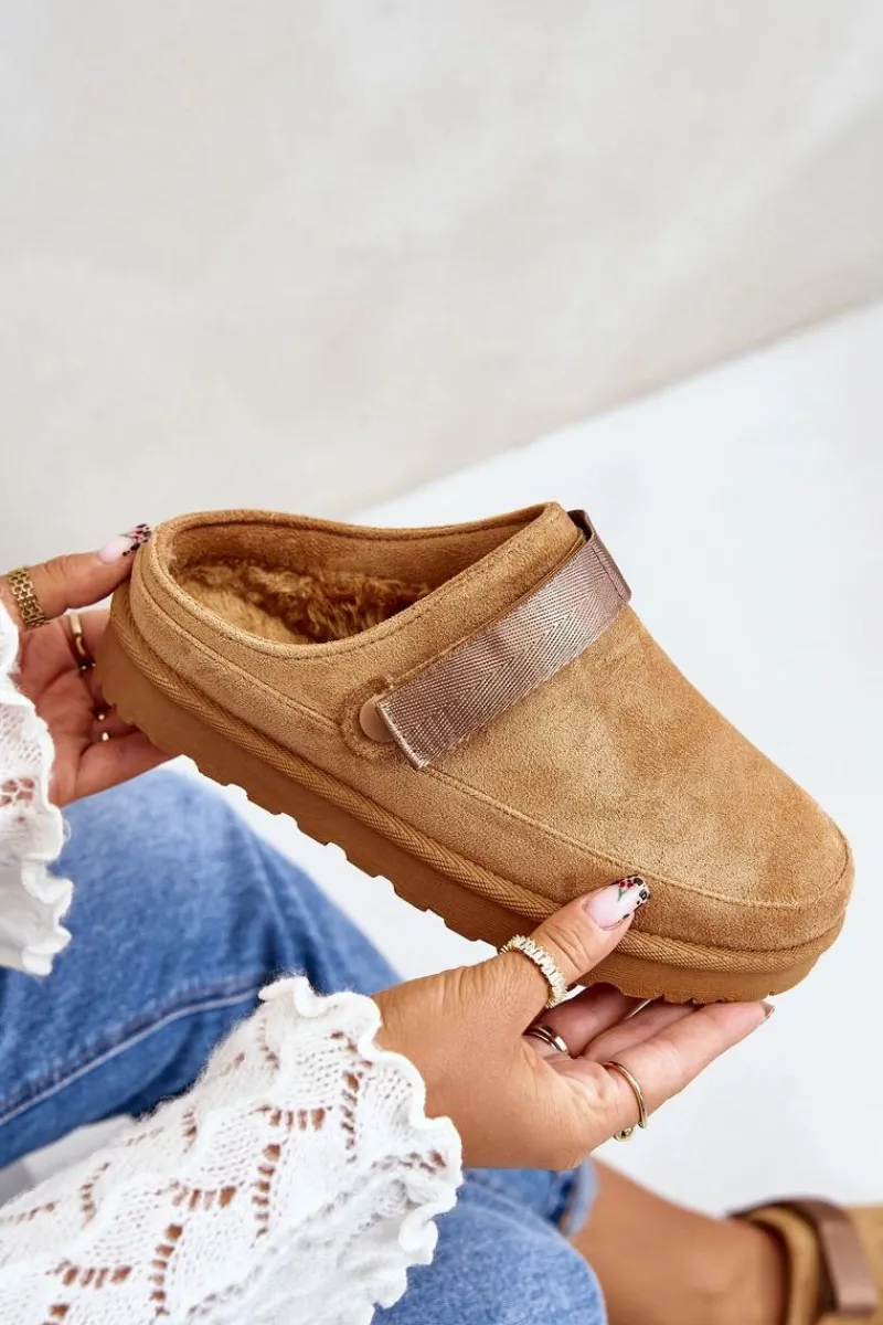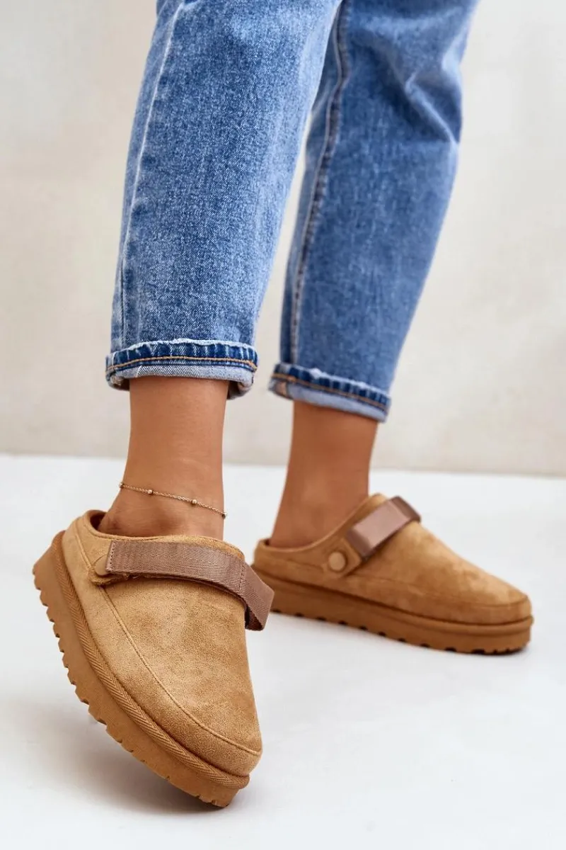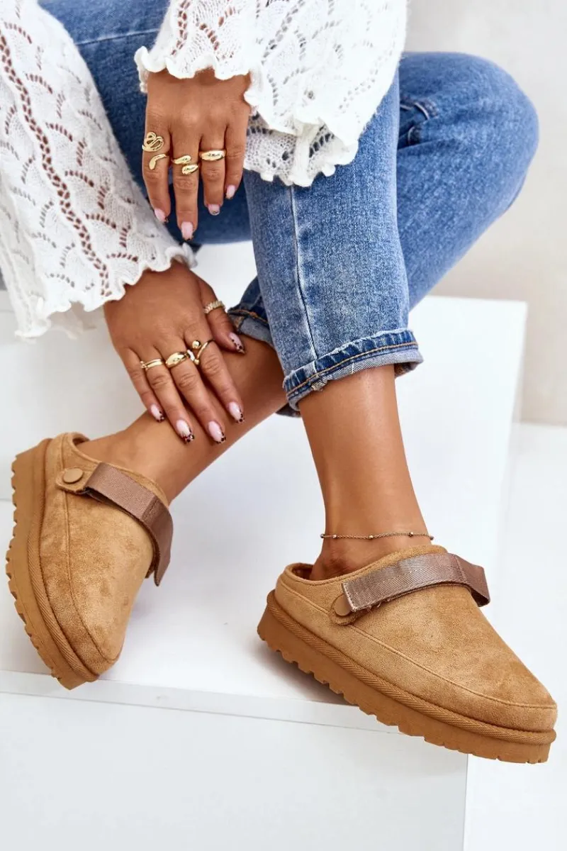 Damskie klapki wykonane z eko zamszu. Osadzone na platformie. Wnętrze ocieplone przyjemnym futerkiem, co zapewnia komfort w chłodniejsze dni. Dodatkowo posiadają ruchomy pasek zapinany na rzep, który stabilizuje piętę i umożliwia idealne dopasowanie. Idealne na co dzień, łączą styl z funkcjonalnością. Przy wyborze rozmiaru prosimy sugerować się tabelą rozmiarów.