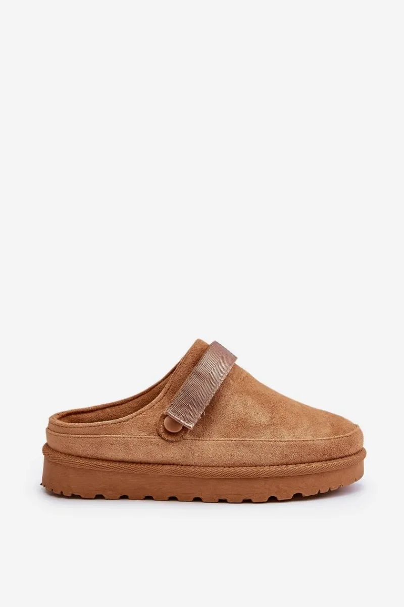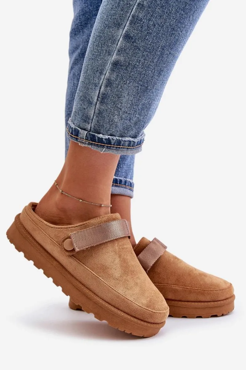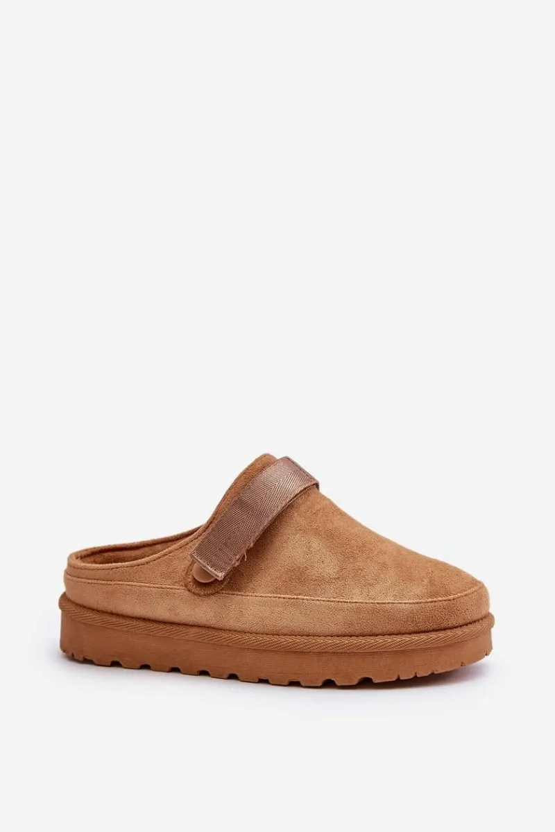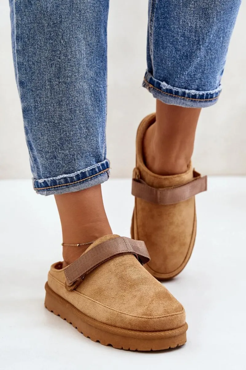 Damskie klapki wykonane z eko zamszu. Osadzone na platformie. Wnętrze ocieplone przyjemnym futerkiem, co zapewnia komfort w chłodniejsze dni. Dodatkowo posiadają ruchomy pasek zapinany na rzep, który stabilizuje piętę i umożliwia idealne dopasowanie. Idealne na co dzień, łączą styl z funkcjonalnością. Przy wyborze rozmiaru prosimy sugerować się tabelą rozmiarów.