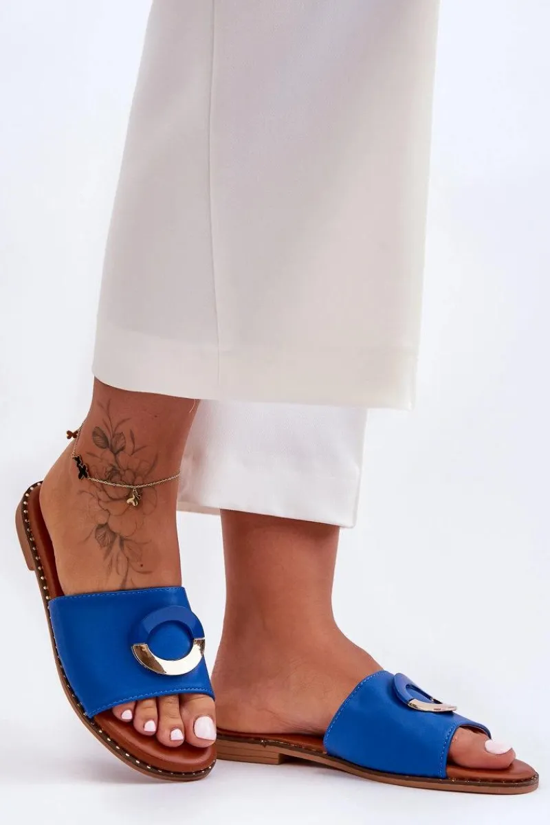 Damskie klapki zostały wykonane z eko skóry. Posiadają na przodzie ozdobę w postaci koła. Klapki osadzono na płaskim obcasie i antypoślizgowej, gumowej podeszwie. Wkładka jest niezwykle miękka i wygodna w użytkowaniu, co zwiększa komfort użytkowania. Nosek w tych klapkach jest odkryty i lekko zaokrąglony. Dodatkowo przy podeszwie znajdują się ozdobne ćwieki. Przy wyborze rozmiaru prosimy sugerować się tabelą rozmiarów.