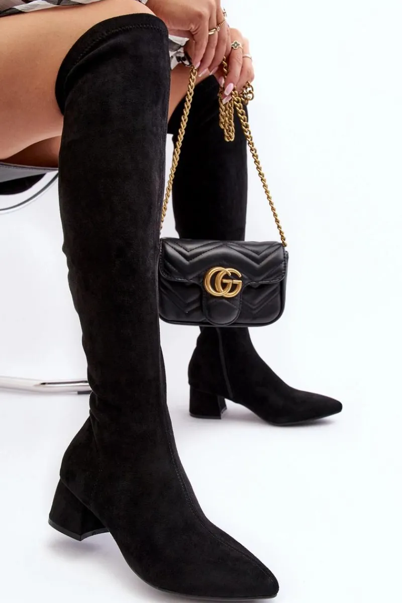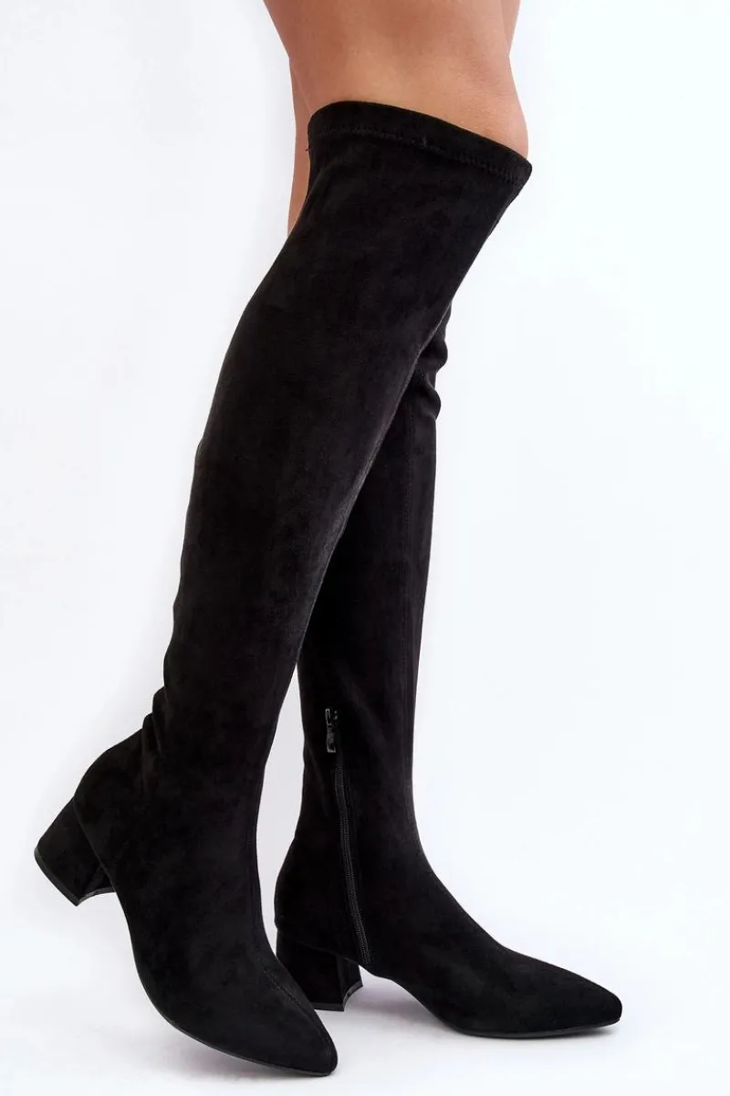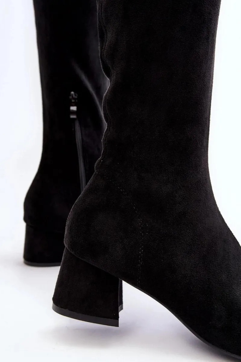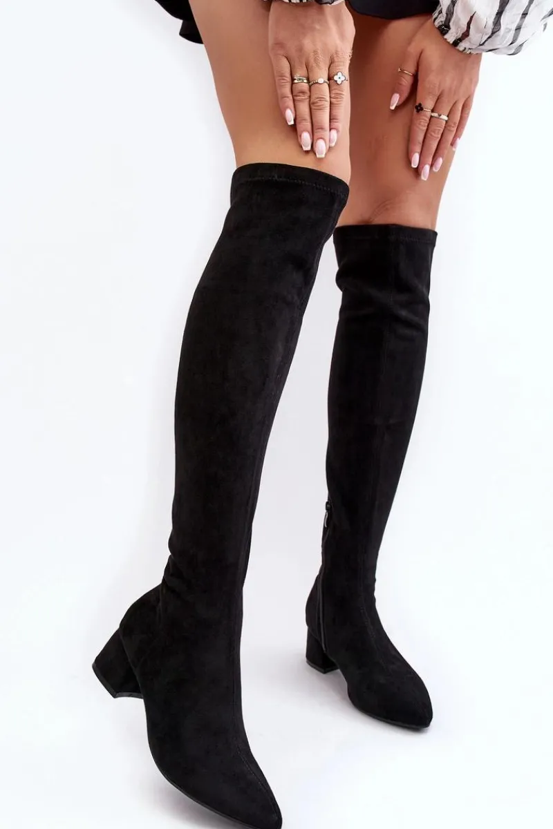 Modne kozaki damskie z cholewką za kolano. Wykonane z eko zamszu. Osadzone na niskim obcasie klocku. Noski w szpic optycznie wysmuklą nogi. Model wsuwany z dodatkowym zapięciem na suwak. Cholewka ozdobiona przeszyciami. Idealny model do sukienek mini czy spódniczek. Koniecznie powinnaś je mieć! Przy wyborze rozmiaru prosimy sugerować się tabelą rozmiarów.