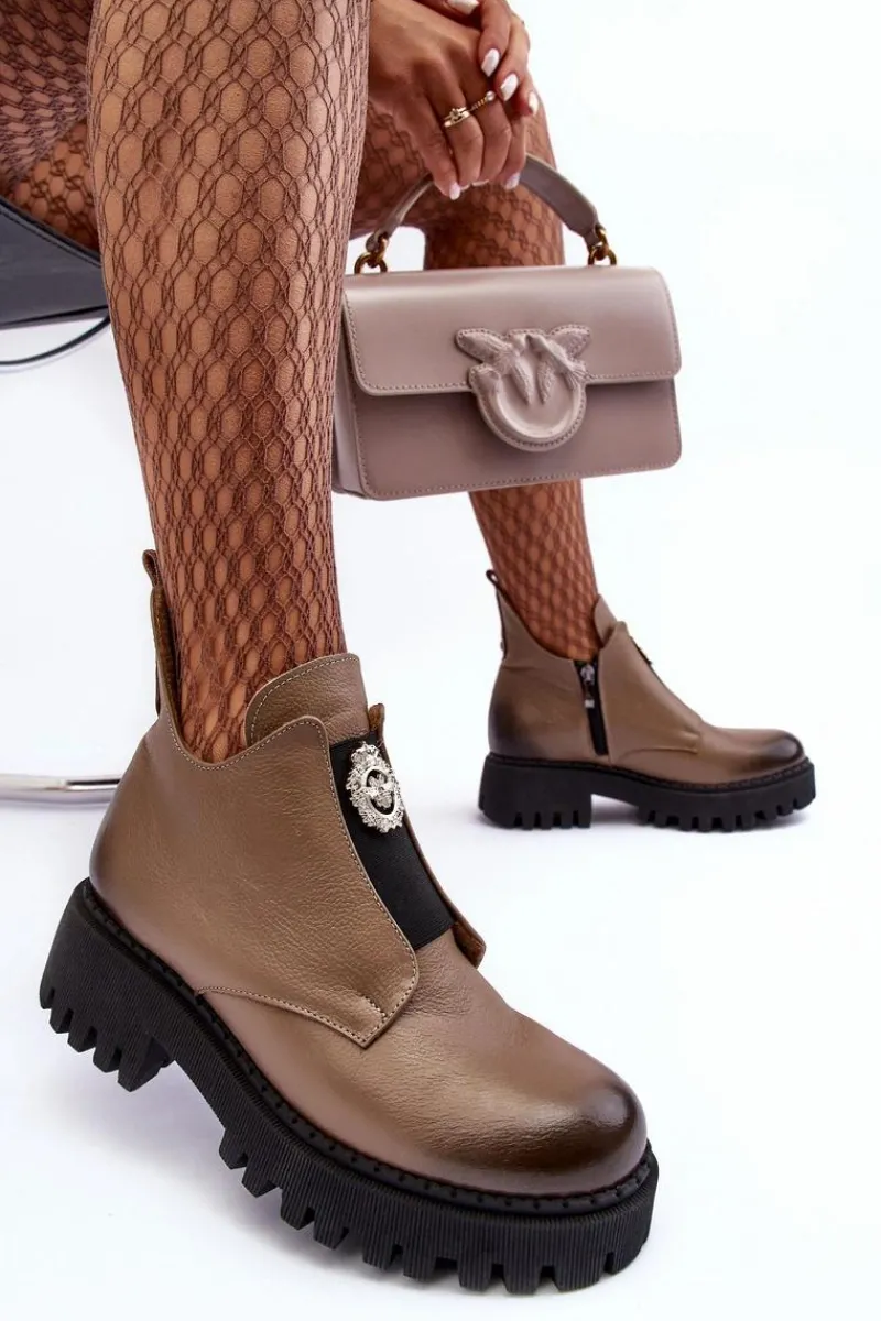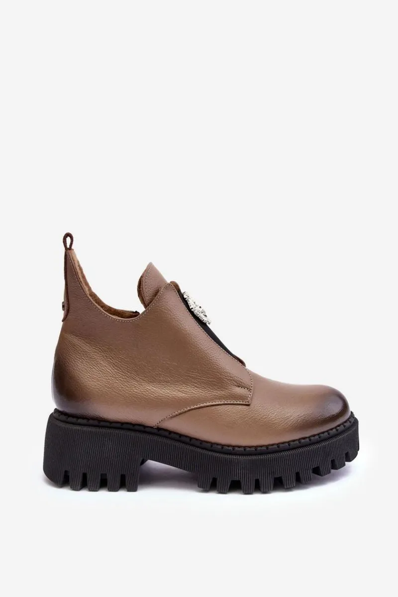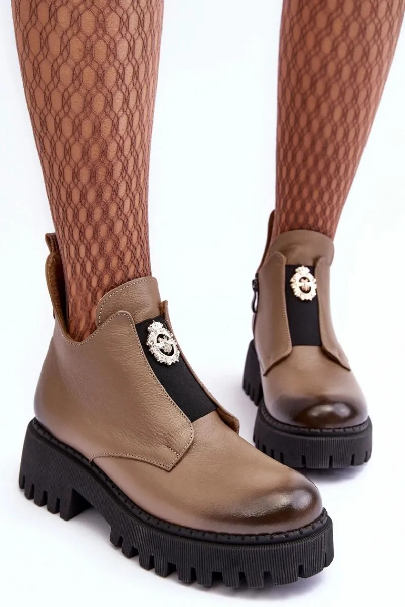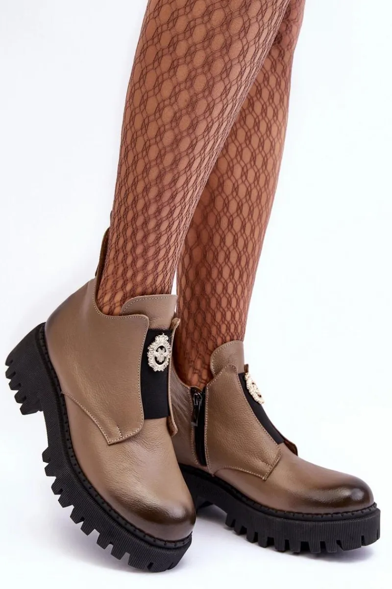 Damskie botki zostały wykonane z wysokiej jakości naturalnej skóry. Osadzone na masywnym obcasie i platformie ze żłobieniami. Model zapinany na suwak po wewnętrznej stronie cholewki. Z przodu na elastycznej wstawce znajduje się ozdoba z tworzywa sztucznego. Wnętrze ocieplone kocem obuwniczym. Ten wyjątkowy model wzbogaci wiele Twoich stylizacji! Przy wyborze rozmiaru prosimy sugerować się tabelą rozmiarów.
