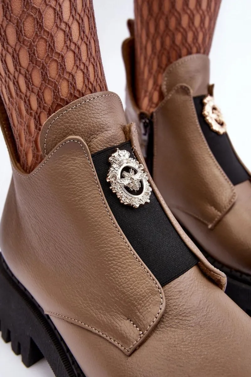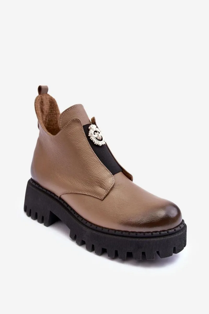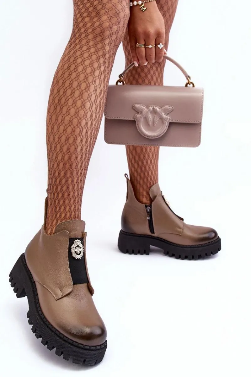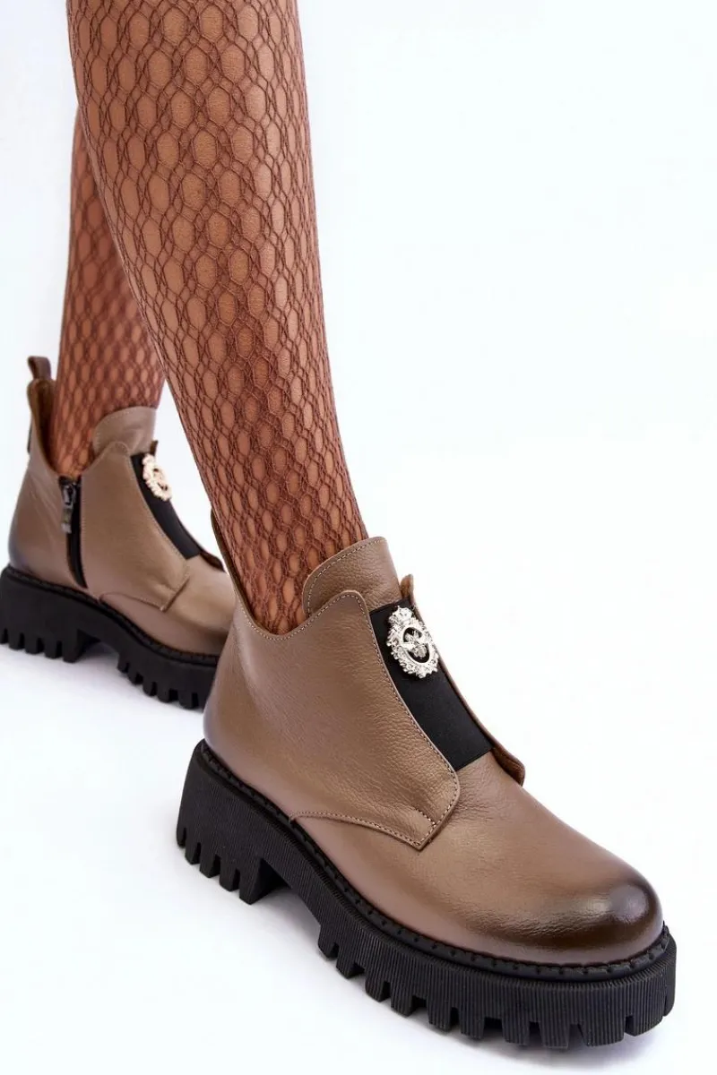Damskie botki zostały wykonane z wysokiej jakości naturalnej skóry. Osadzone na masywnym obcasie i platformie ze żłobieniami. Model zapinany na suwak po wewnętrznej stronie cholewki. Z przodu na elastycznej wstawce znajduje się ozdoba z tworzywa sztucznego. Wnętrze ocieplone kocem obuwniczym. Ten wyjątkowy model wzbogaci wiele Twoich stylizacji! Przy wyborze rozmiaru prosimy sugerować się tabelą rozmiarów.