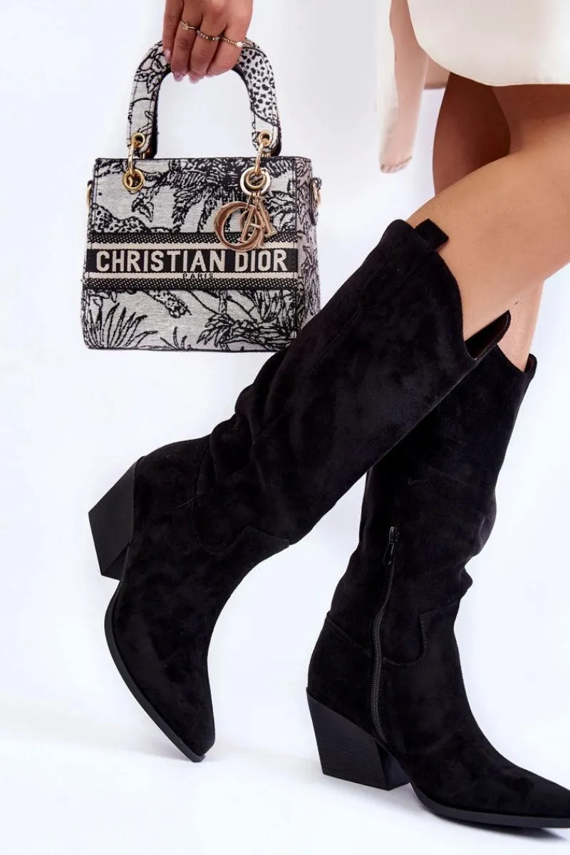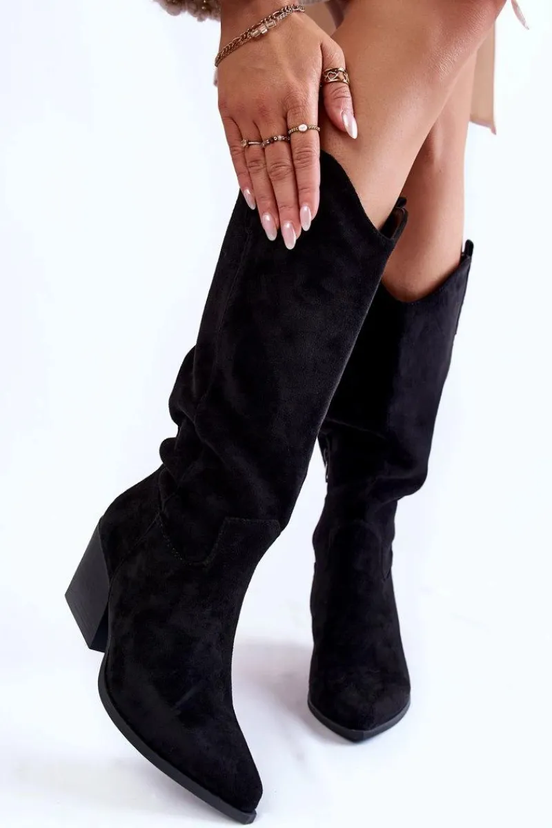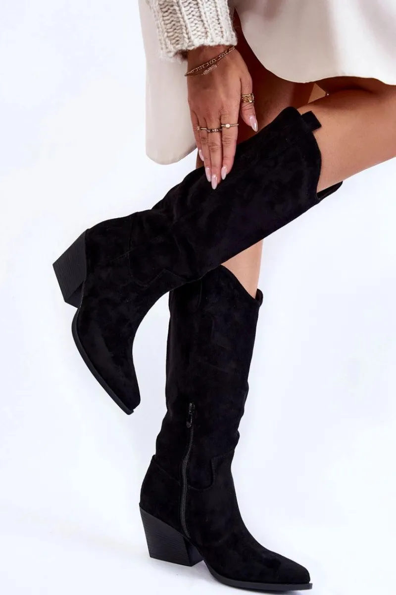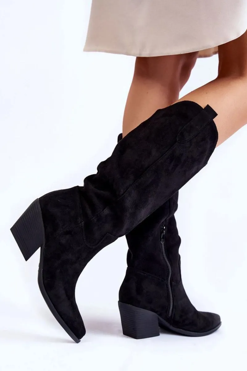 Modne kozaki-kowbojki uzupełnią wiele Twoich jesiennych stylizacji! Model wykonany z miłego eko zamszu. Kozaki są wsuwane, a także posiadają zamek z boku cholewki. Osadzone na obcasie w postaci masywnego słupka. Ocieplone wewnątrz kocem obuwniczym. Nosek w szpic optycznie wysmukli nogi. Kozaki posiadają usztywniany zapiętek. Przy wyborze rozmiaru prosimy sugerować się tabelą rozmiarów.