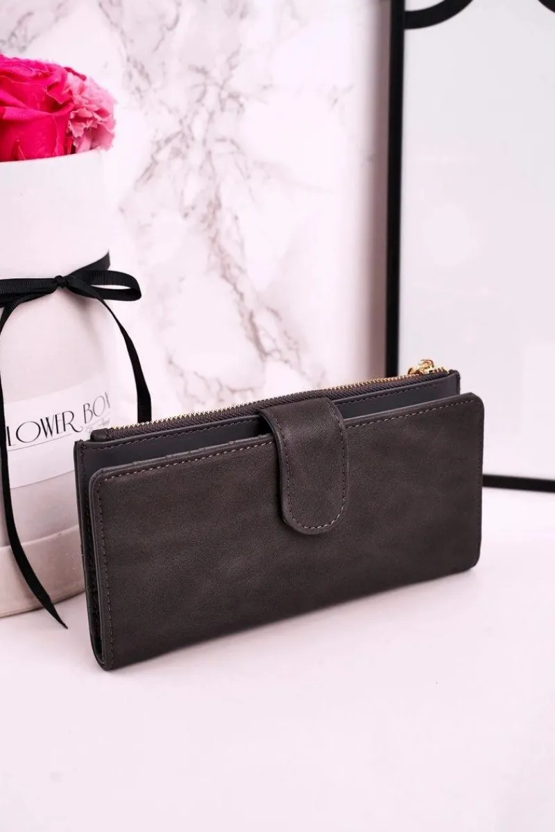Duży i praktyczny portfel zapinany na zamek i zatrzask. Portfel pomieści bilon, banknoty oraz karty płatnicze i dokumenty. Wykonany ze skóry ekologicznej, dostępny w kilku kolorach. W zestawie znajduje się mała portmonetka zapinana na zamek.