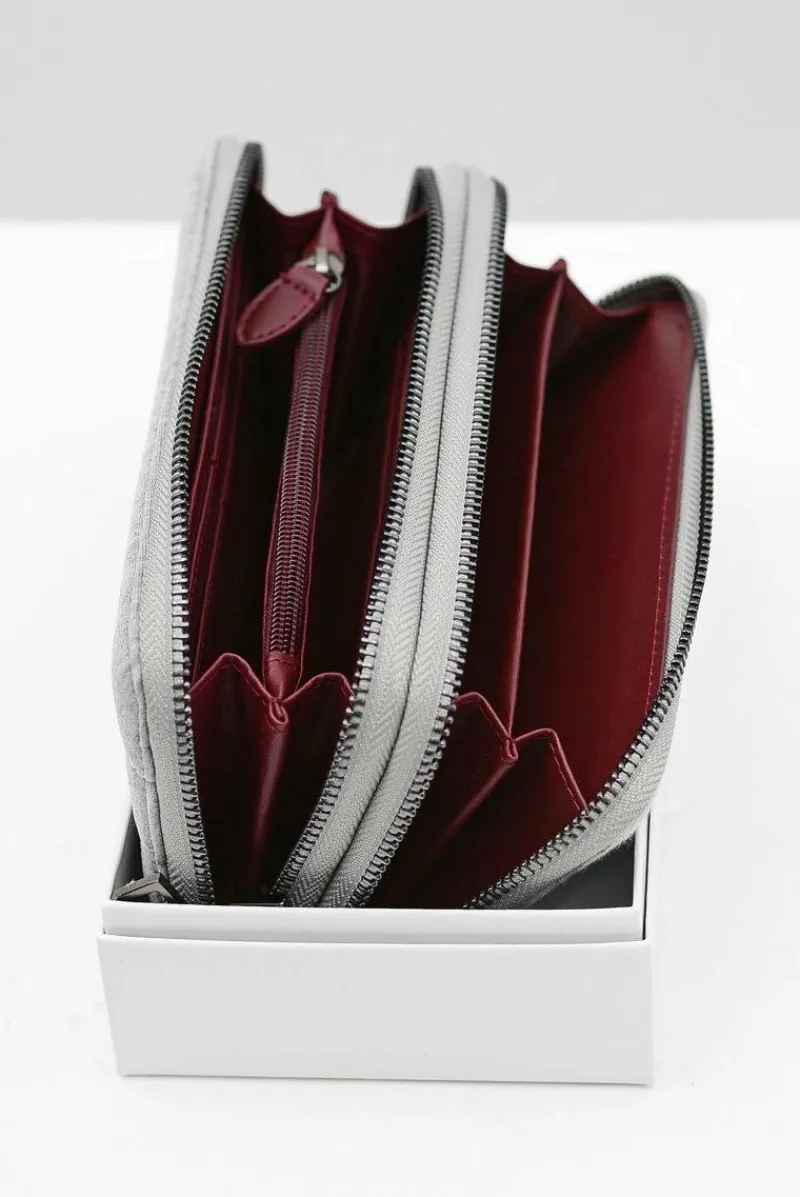 Dopełnieniem każdej kobiecej stylizacji jest nie tylko torebka i buty ale również dobrze dobrany portfel. Portfel wykonany z najwyższej jakości delikatnego materiału tekstylnego. Portfel posiada dwie duże oddzielne komory zapinane na srebrne suwaki. Wewnątrz pierwszej kieszeni znajdują się dwie przegródki na banknoty bądź dokumenty. W drugiej kieszeni znajdują się dwie duże przegródki z miejscem na karty płatnicze oraz inne potrzebne rzeczy oraz jedna na bilon zapinana na zamek.