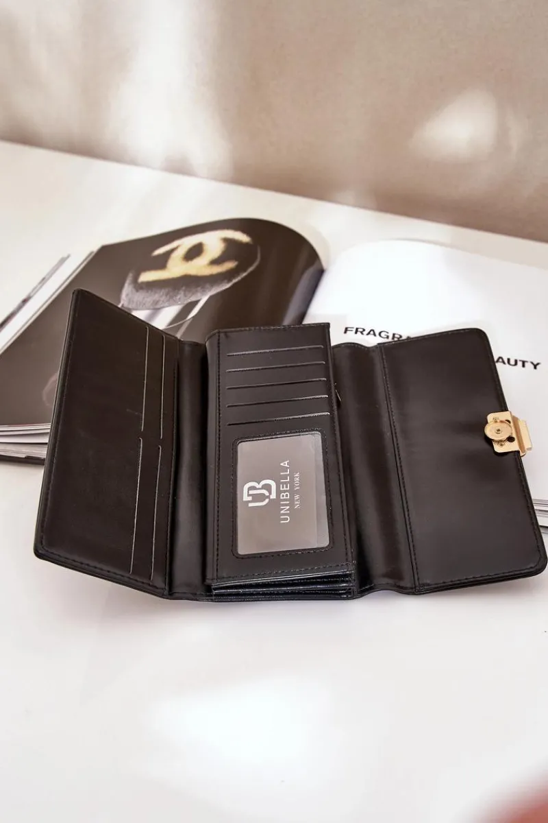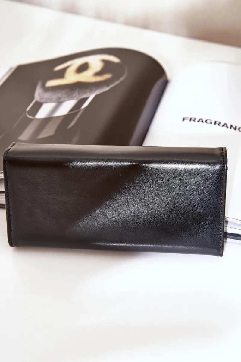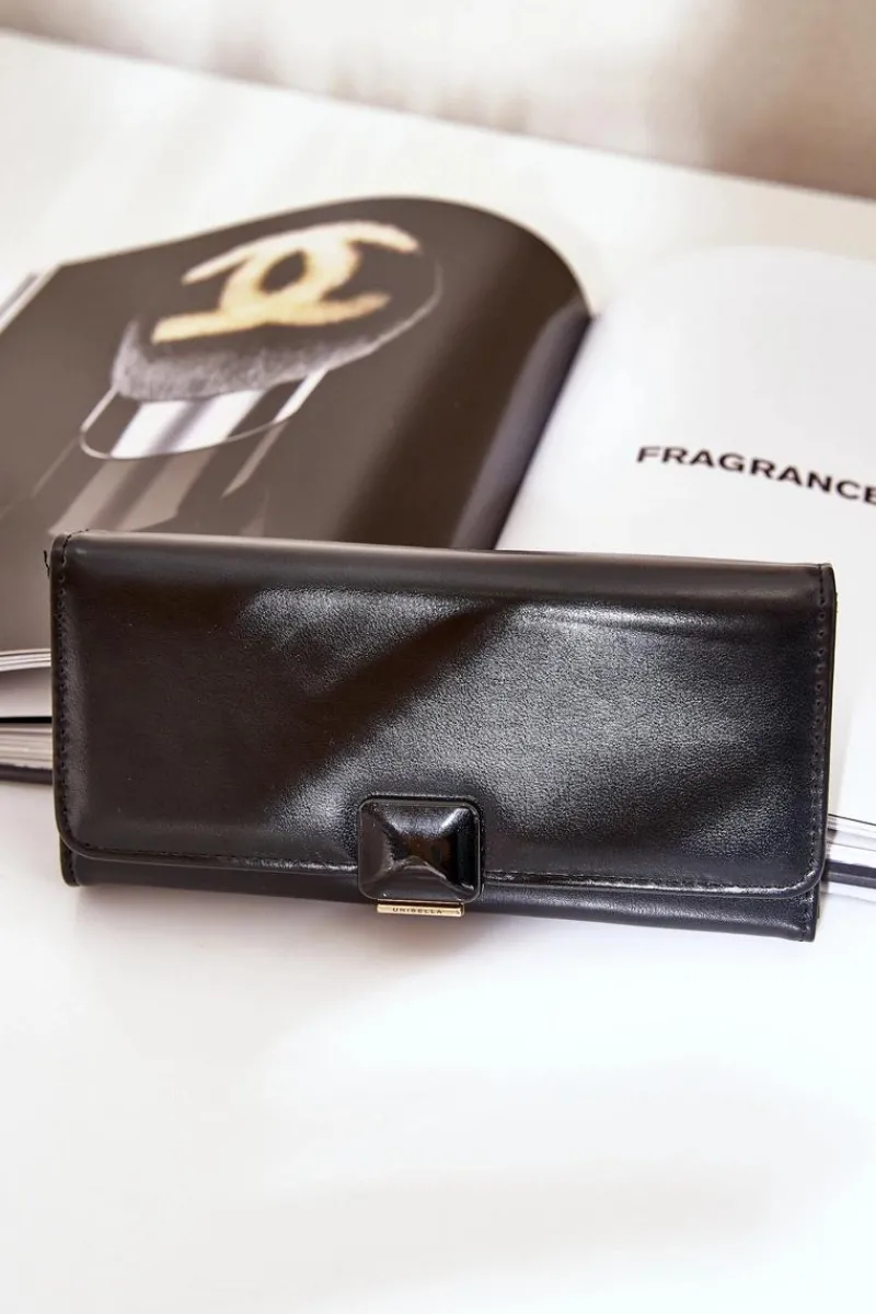 Stylowy damski portfel wykonany z eko skóry, zapinany na magnes. Wnętrze wyposażone w kieszeń na monety, przegródki na karty, miejsce na banknoty oraz fotografię. Elegancki i funkcjonalny, doskonały zarówno na co dzień, jak i jako prezent dla bliskiej osoby!