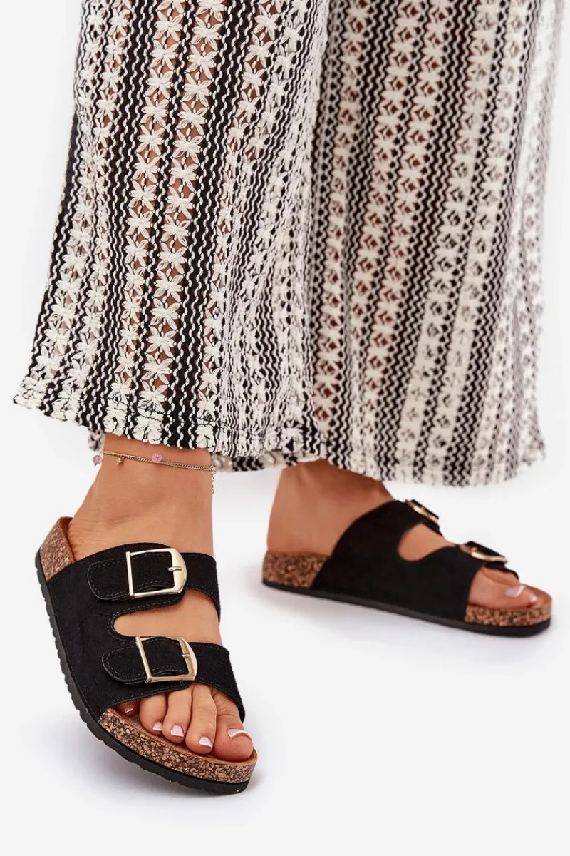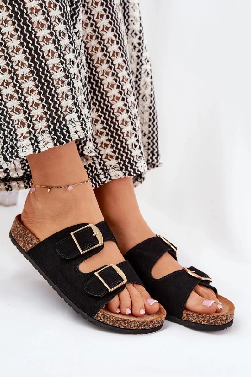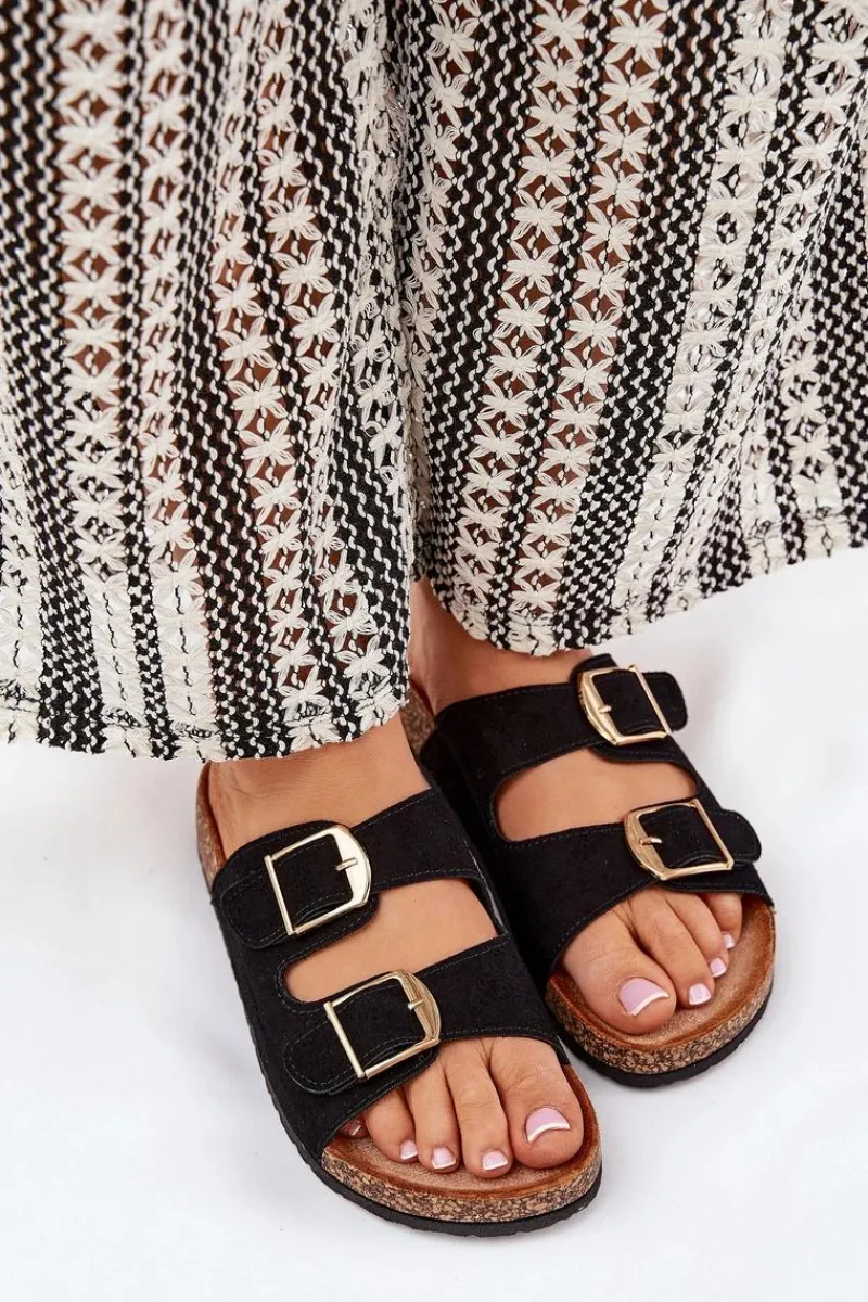 Stylowe klapki damskie na korkowej platformie, które łączą wygodę z modnym wyglądem. Z przodu znajdują się dwa paski z klamrami, które zapewniają idealne dopasowanie. Profilowana eko zamszowa wkładka gwarantuje komfort przez cały dzień. Te klapki będą doskonałym wyborem na letnie dni, świetnie komponując się z sukienkami, spódnicami i spodniami. Przy wyborze rozmiaru prosimy sugerować się tabelą rozmiarów.
