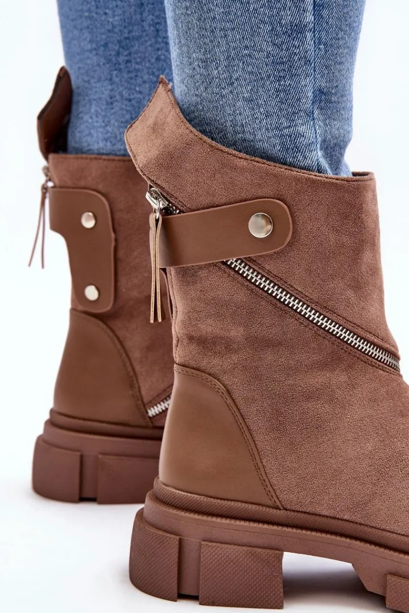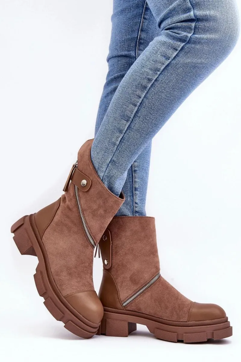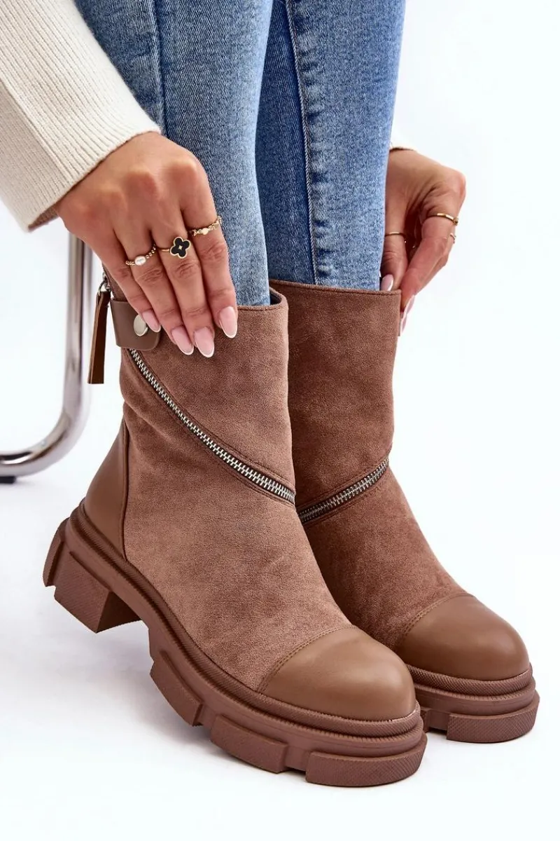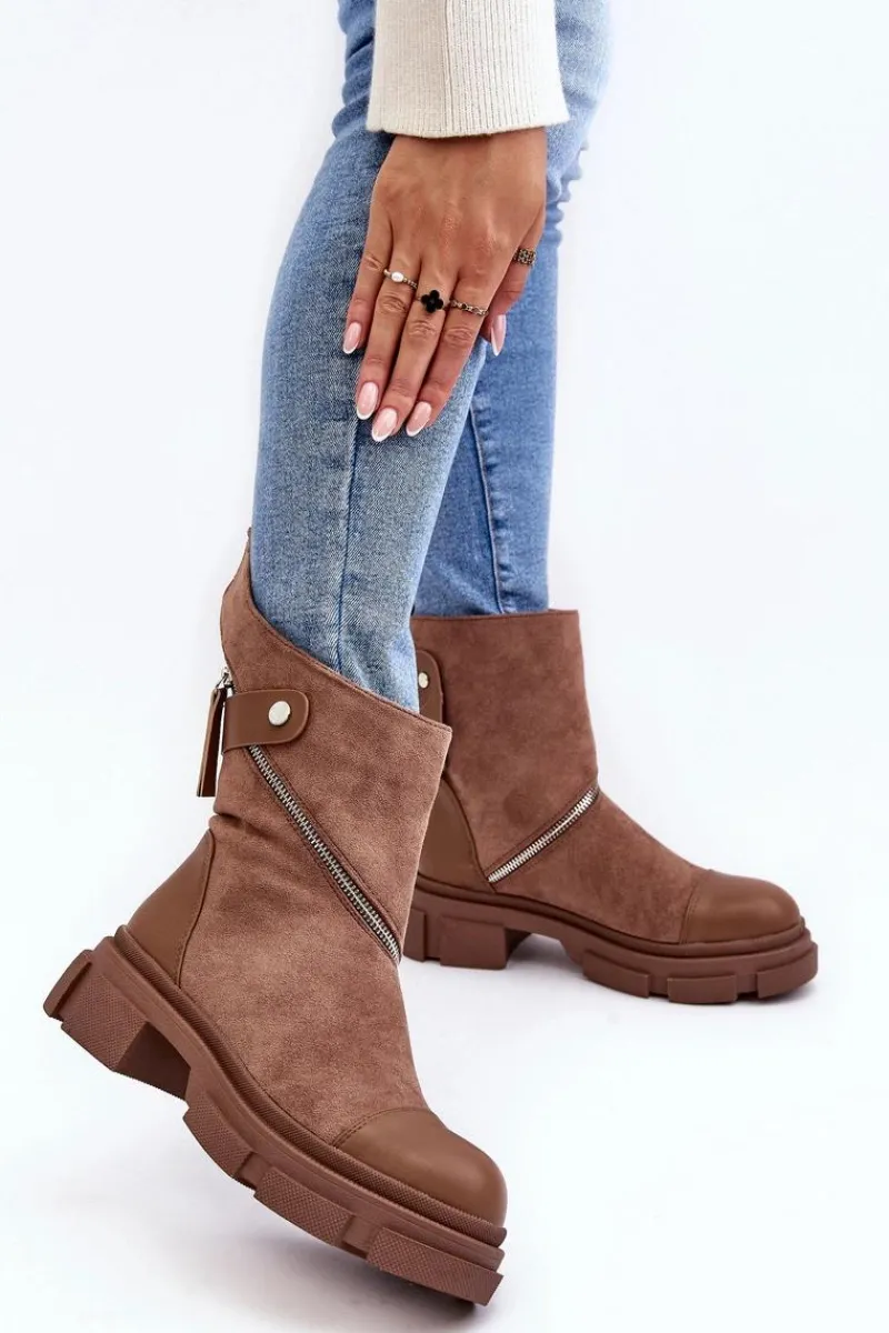 Wyjątkowe botki damskie zapinane na zamek błyskawiczny oraz napę. Wyjątkowy fason zachwyci niejedną miłośniczkę modowych nowości! Botki zostały wykonane z połączenia eko skóry oraz eko zamszu. Środek ocieplony przyjemnym w dotyku futerkiem. Osadzone na platformie i obcasie w postaci słupka. Nieregularne zakończenie cholewki dodaje charakteru tym butom! Przy wyborze rozmiaru prosimy sugerować się tabelą rozmiarów.