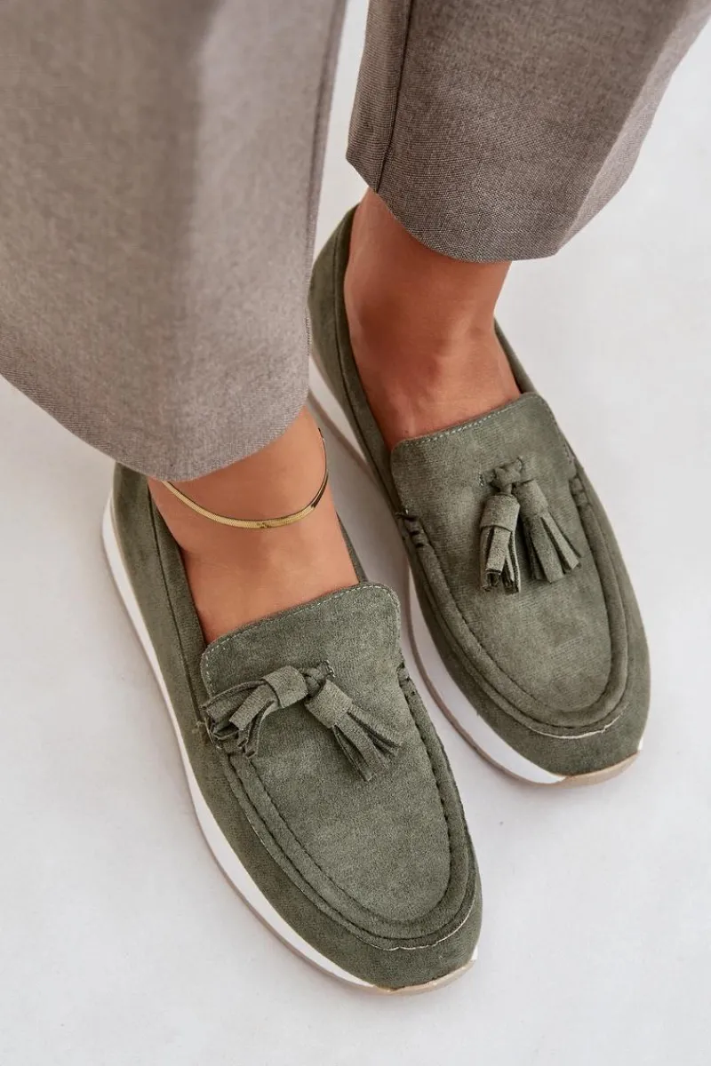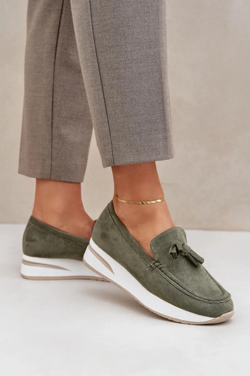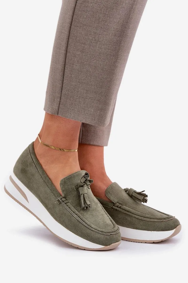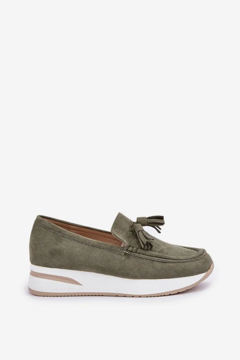 Mokasyny damskie wykonane z eko zamszu. Osadzone na platformie oraz delikatnym koturnie, zapewniają komfort noszenia i dodają lekkości sylwetce. Zaokrąglone noski sprawiają, że obuwie jest niezwykle wygodne, a miękka wkładka dba o komfort przez cały dzień. Całość uzupełniają ozdobne frędzle, które dodają oryginalnego charakteru i stylu. Idealne do codziennych stylizacji! Przy wyborze rozmiaru prosimy sugerować się tabelą rozmiarów.