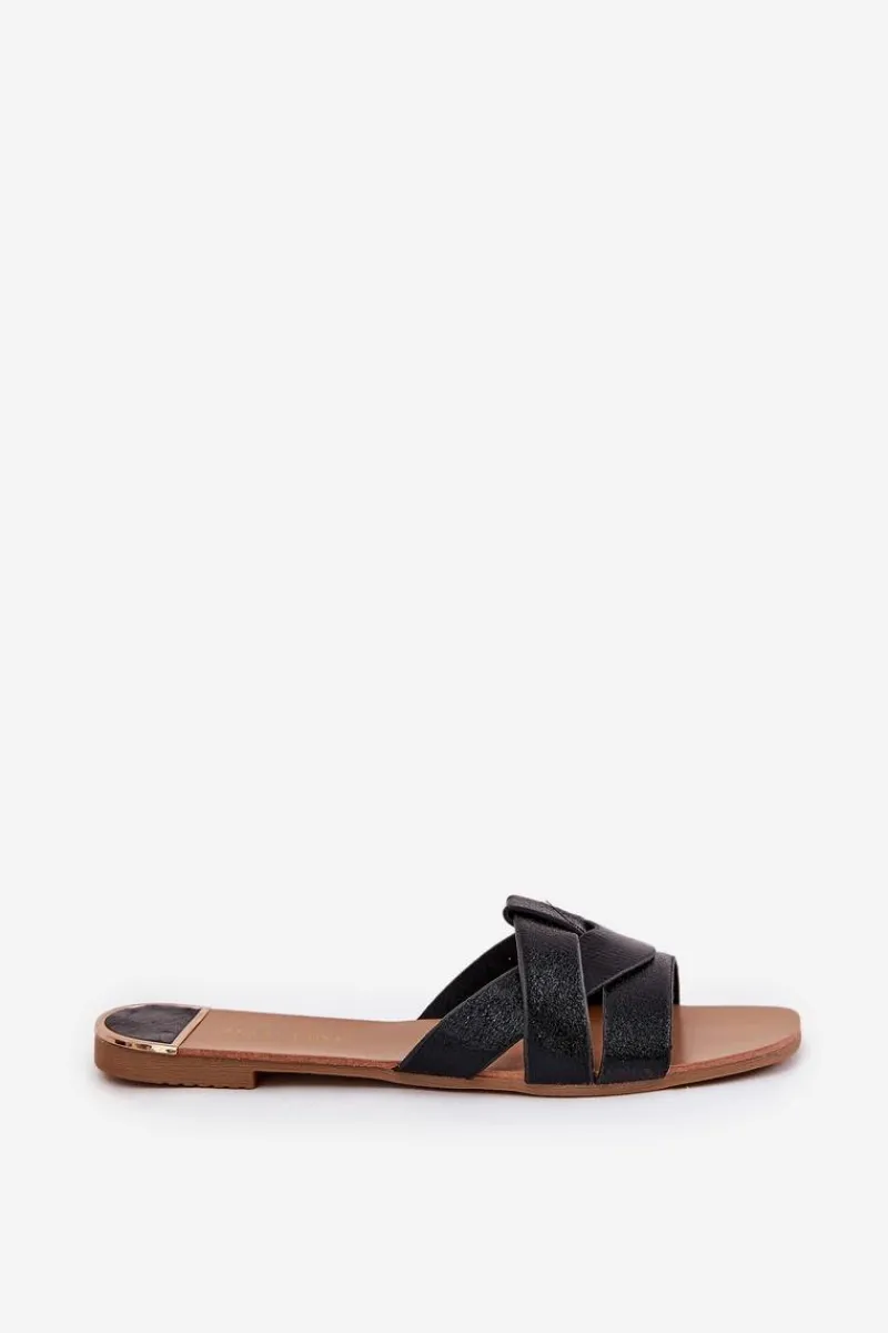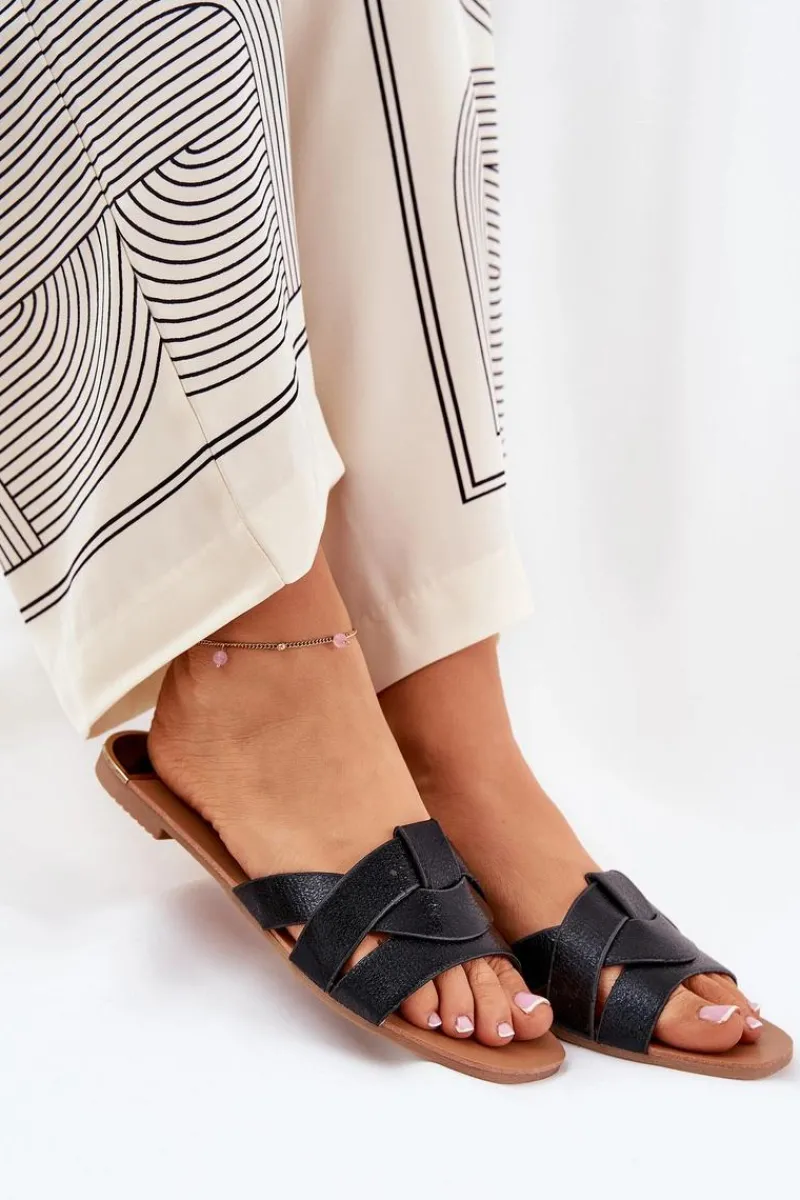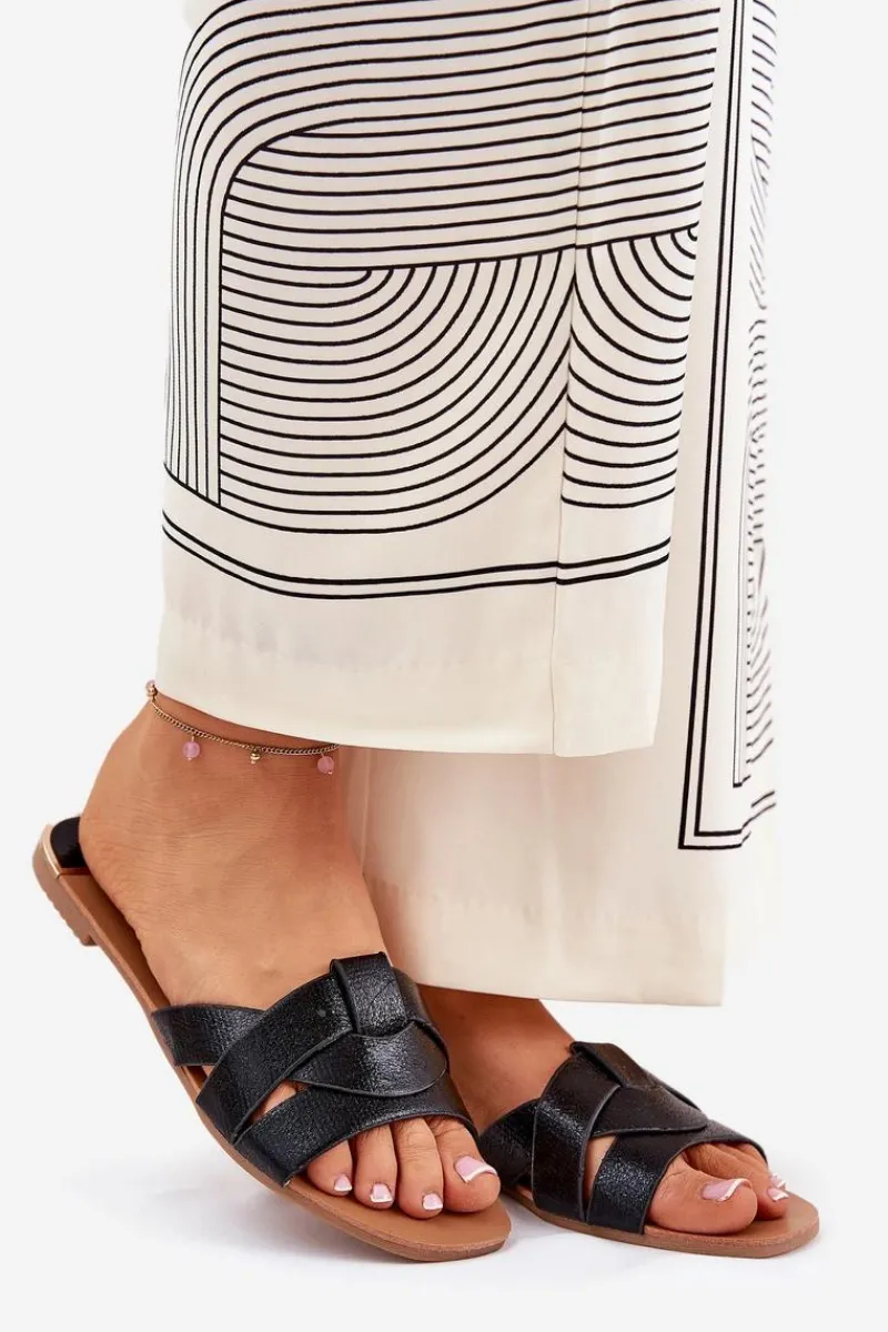 Płaskie klapki damskie z materiału tekstylnego, które charakteryzują się przeplatającymi się paskami z przodu, nadającymi im delikatnego uroku. Klasyczny fason sprawia, że będą doskonałym wyborem do wielu stylizacji, łącząc wygodę z prostym, eleganckim wyglądem. Przy wyborze rozmiaru prosimy sugerować się tabelą rozmiarów.