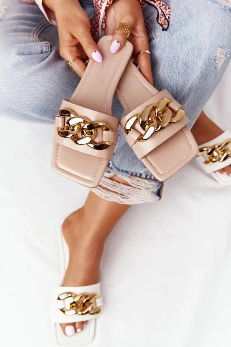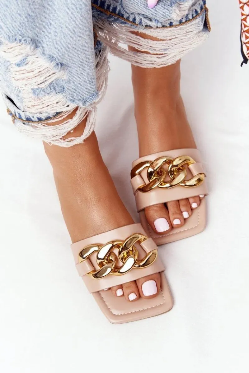 New Boto Skórzane Klapki Z Łańcuchem Nude French Kiss