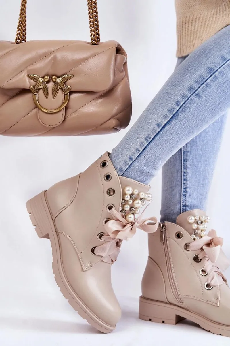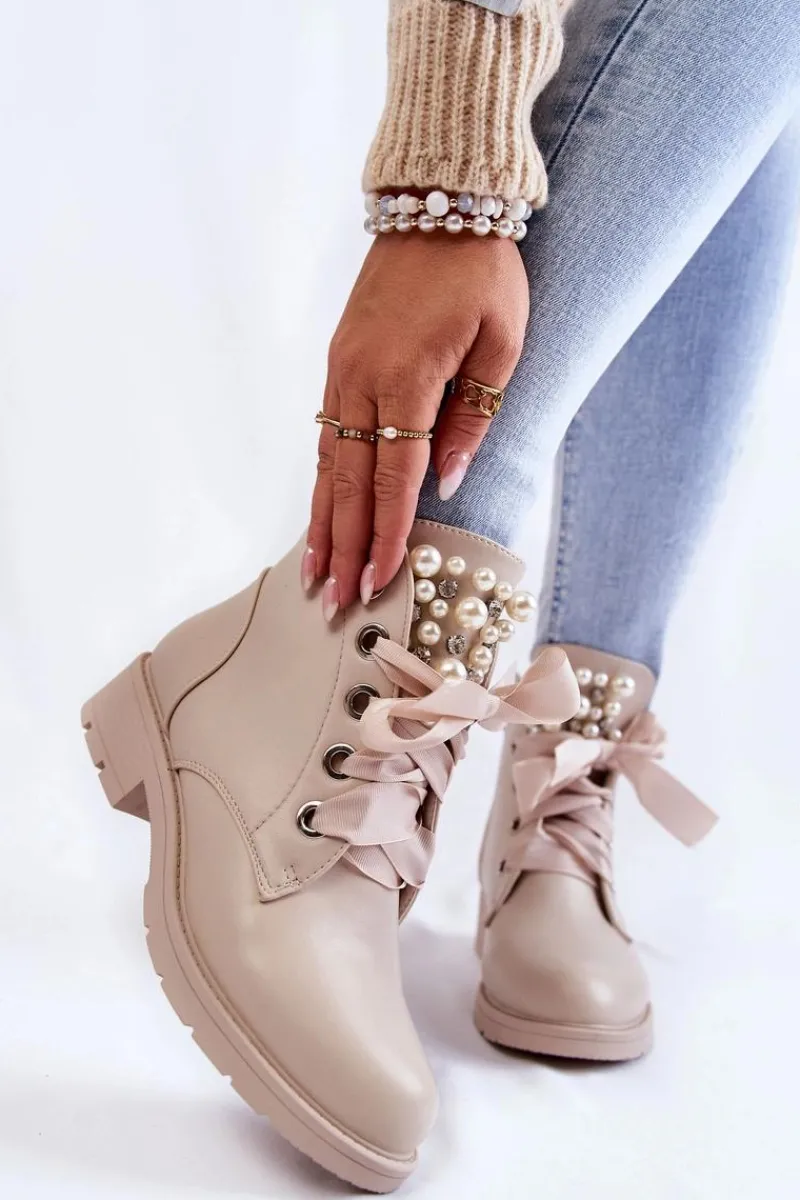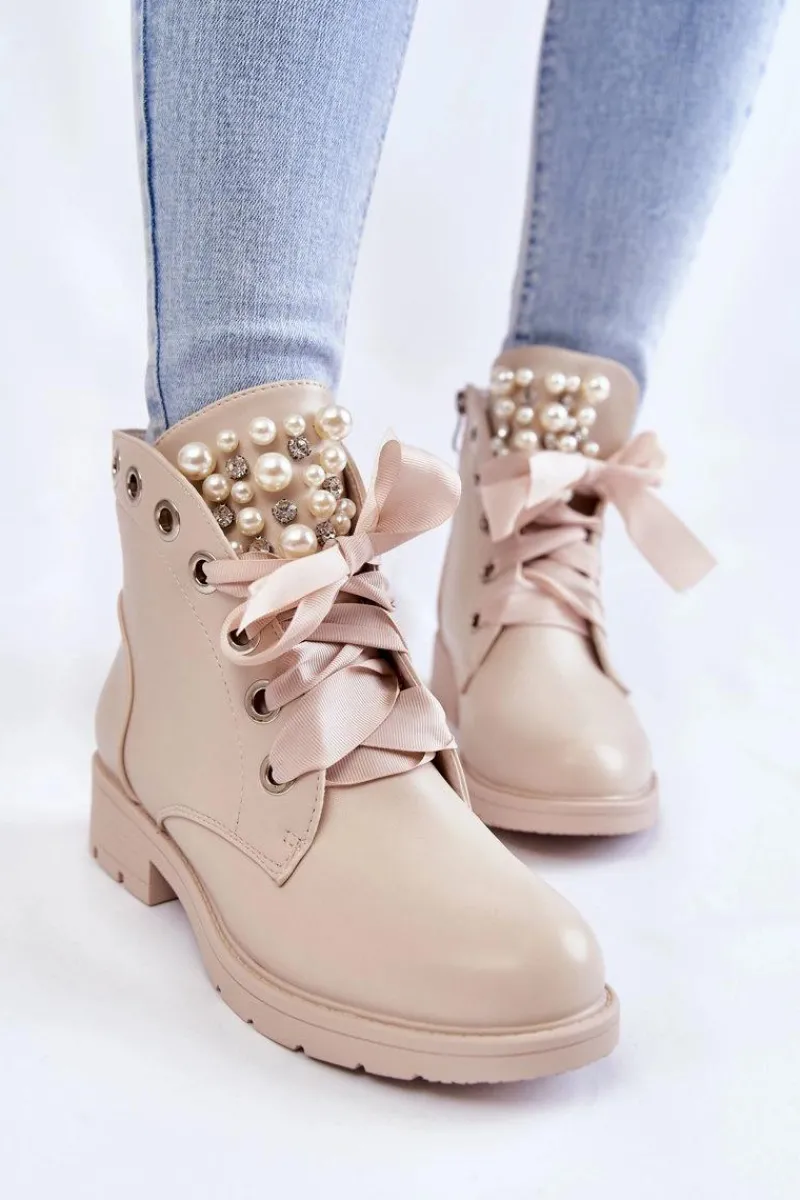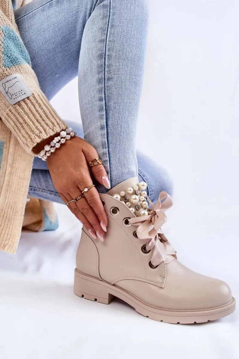 Damskie botki z pięknymi perełkami i dżetami imitującymi cyrkonie podkreślą każdą Twoją stylizację! Wykonane z eko skórzanych materiałów. Nieregularna cholewka została przyozdobiona metalowymi kółeczkami. Botki posiadają ocieplenie w postaci delikatnego koca obuwniczego. Osadzone na płaskim obcasie i delikatnej podeszwie. Ten świetny model nigdy nie wyjdzie z mody, dlatego powinnaś mieć te botki w swojej szafie! Przy wyborze rozmiaru prosimy sugerować się tabelą rozmiarów.