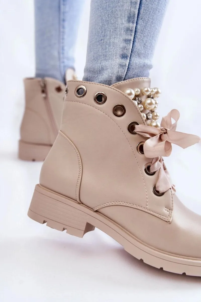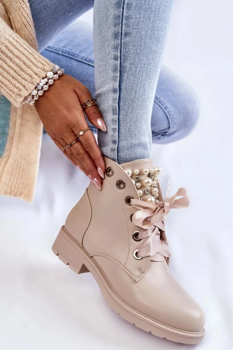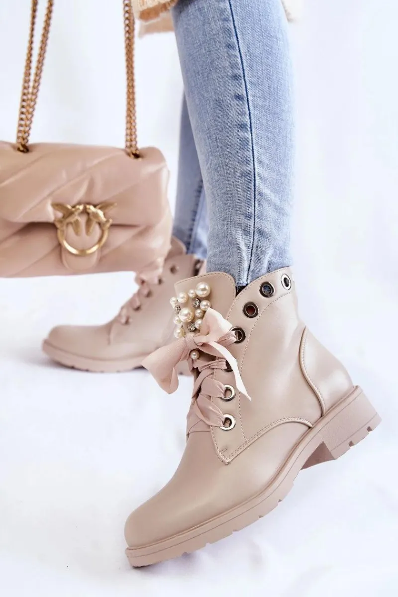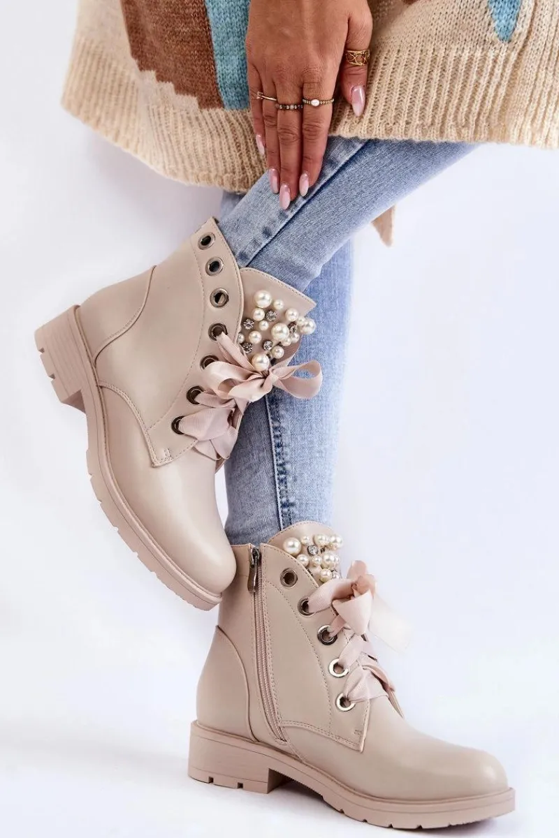 Damskie botki z pięknymi perełkami i dżetami imitującymi cyrkonie podkreślą każdą Twoją stylizację! Wykonane z eko skórzanych materiałów. Nieregularna cholewka została przyozdobiona metalowymi kółeczkami. Botki posiadają ocieplenie w postaci delikatnego koca obuwniczego. Osadzone na płaskim obcasie i delikatnej podeszwie. Ten świetny model nigdy nie wyjdzie z mody, dlatego powinnaś mieć te botki w swojej szafie! Przy wyborze rozmiaru prosimy sugerować się tabelą rozmiarów.