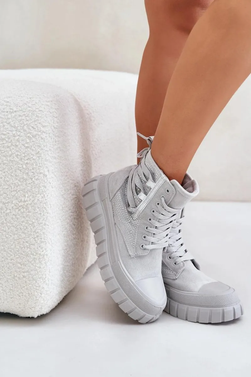 Wysokie trampki damskie wykonane z połączenia eko zamszu i materiału tekstylnego. Ich masywna platforma i podwójne sznurowanie nadają im nowoczesny wygląd, który świetnie komponuje się w różnych stylizacjach. Dodatkowe zapięcie na zamek ułatwi zakładanie obuwia. To absolutny must-have w Twojej garderobie! Przy wyborze rozmiaru prosimy sugerować się tabelą rozmiarów.