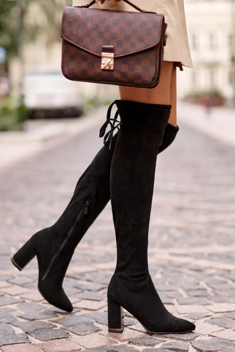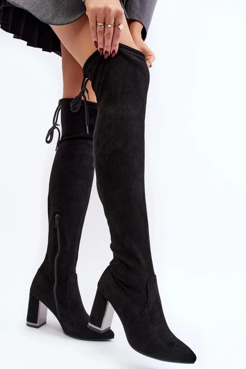 Kozaki damskie z cholewką za kolano. Wykonane z eko zamszu. Osadzone na obcasie w postaci słupka, który wzbogacony został lustrzanym elementem. Na górze cholewki znajduje się wiązanie. Model wsuwany z dodatkowym suwakiem. W środku ocieplone na wysokości stopy. Idealny model do sukienek mini czy spódniczek. Koniecznie powinnaś je mieć! Przy wyborze rozmiaru prosimy sugerować się tabelą rozmiarów.