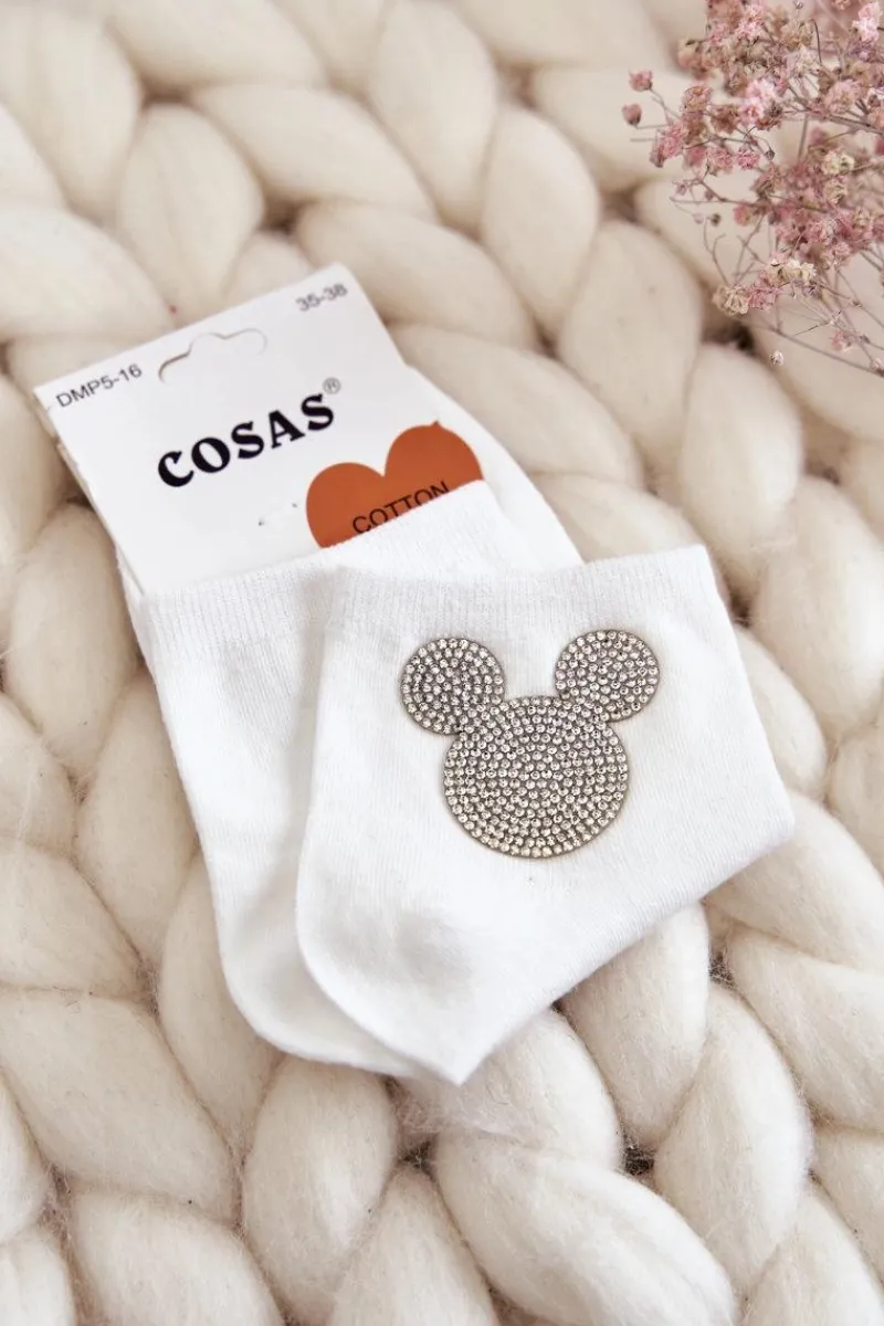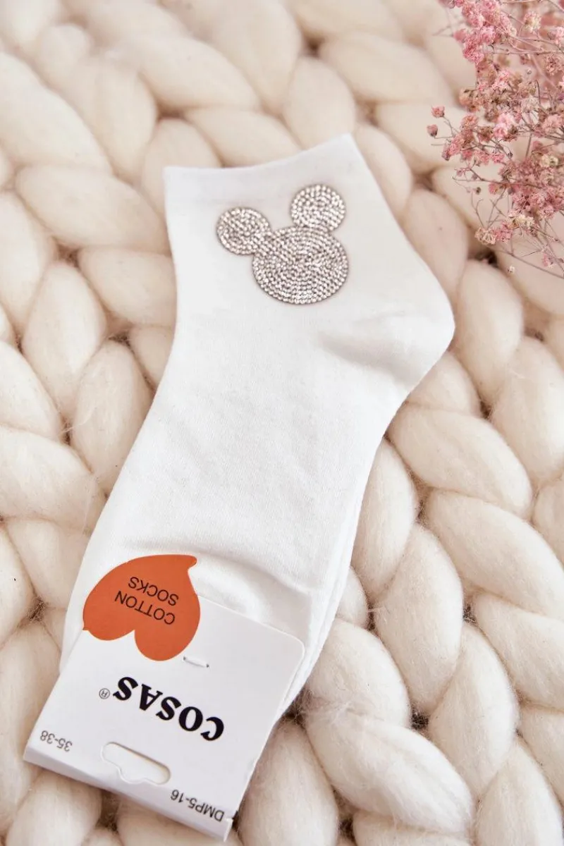 Damskie skarpetki zostały wykonane z wysokiej jakości bawełny z domieszką spandexu. Ozdobiono je mieniącymi się dżetami w postaci cyrkonii w kształcie myszki. Delikatny ściągacz sprawi, że skarpetki będą idealnie dopasowane. Model za kostkę. Świetnie będą prezentować się do sportowego obuwia.