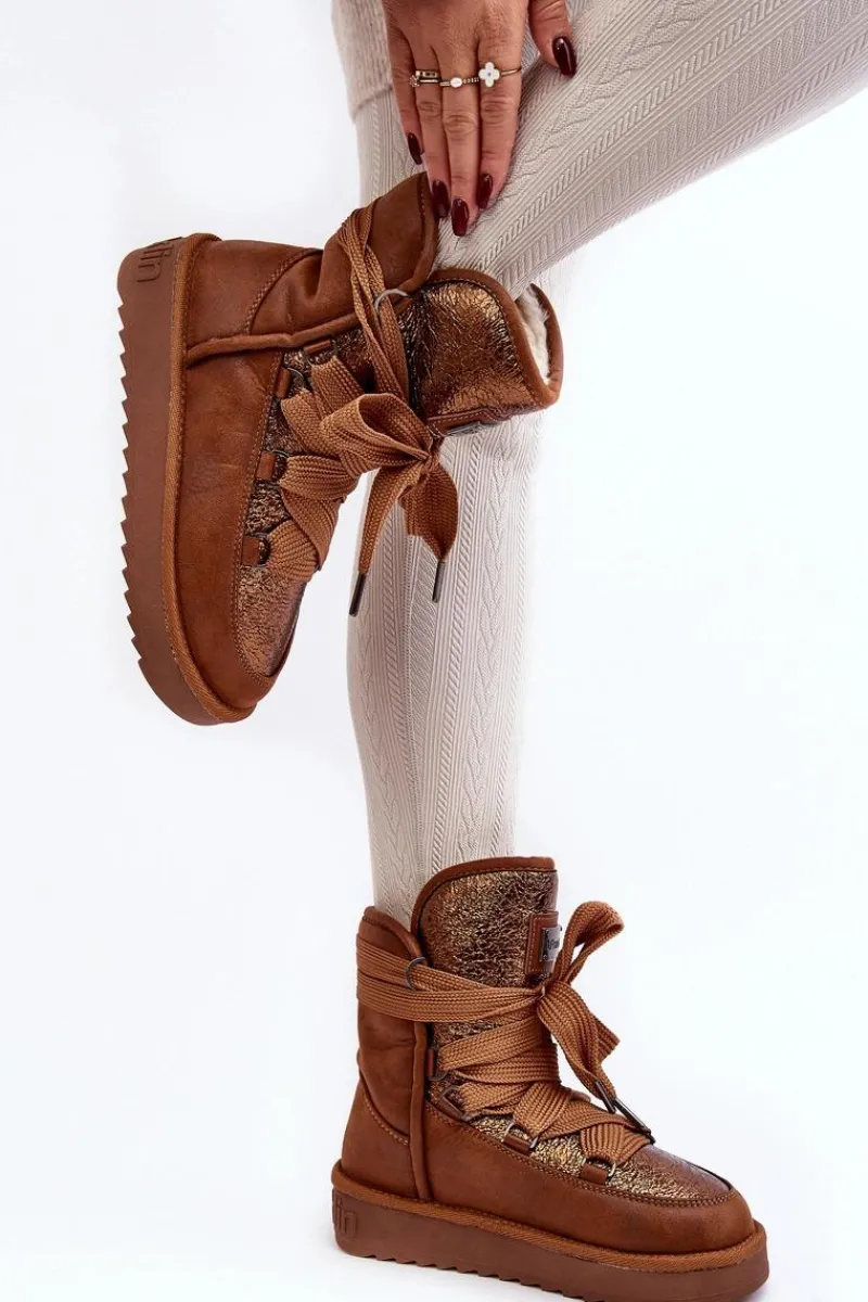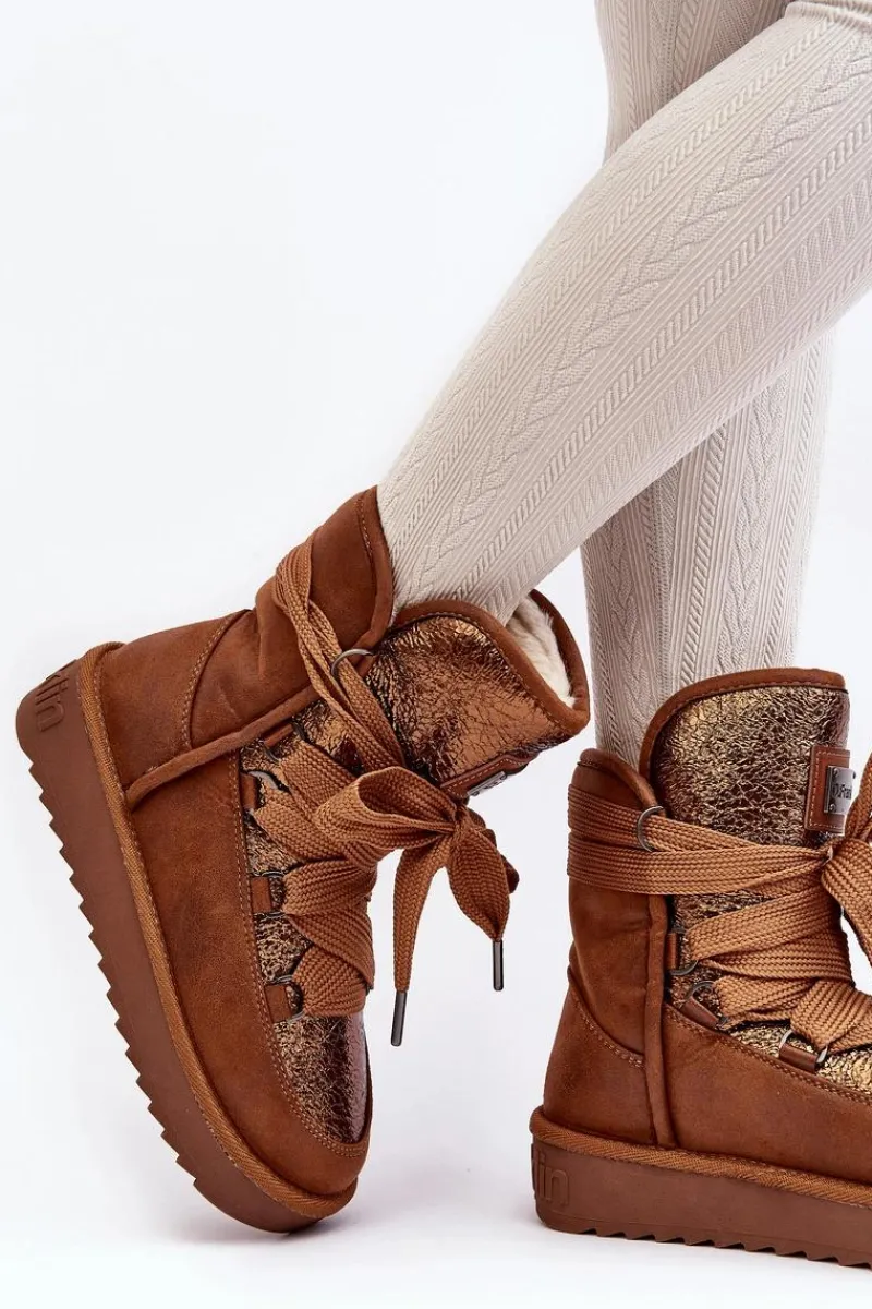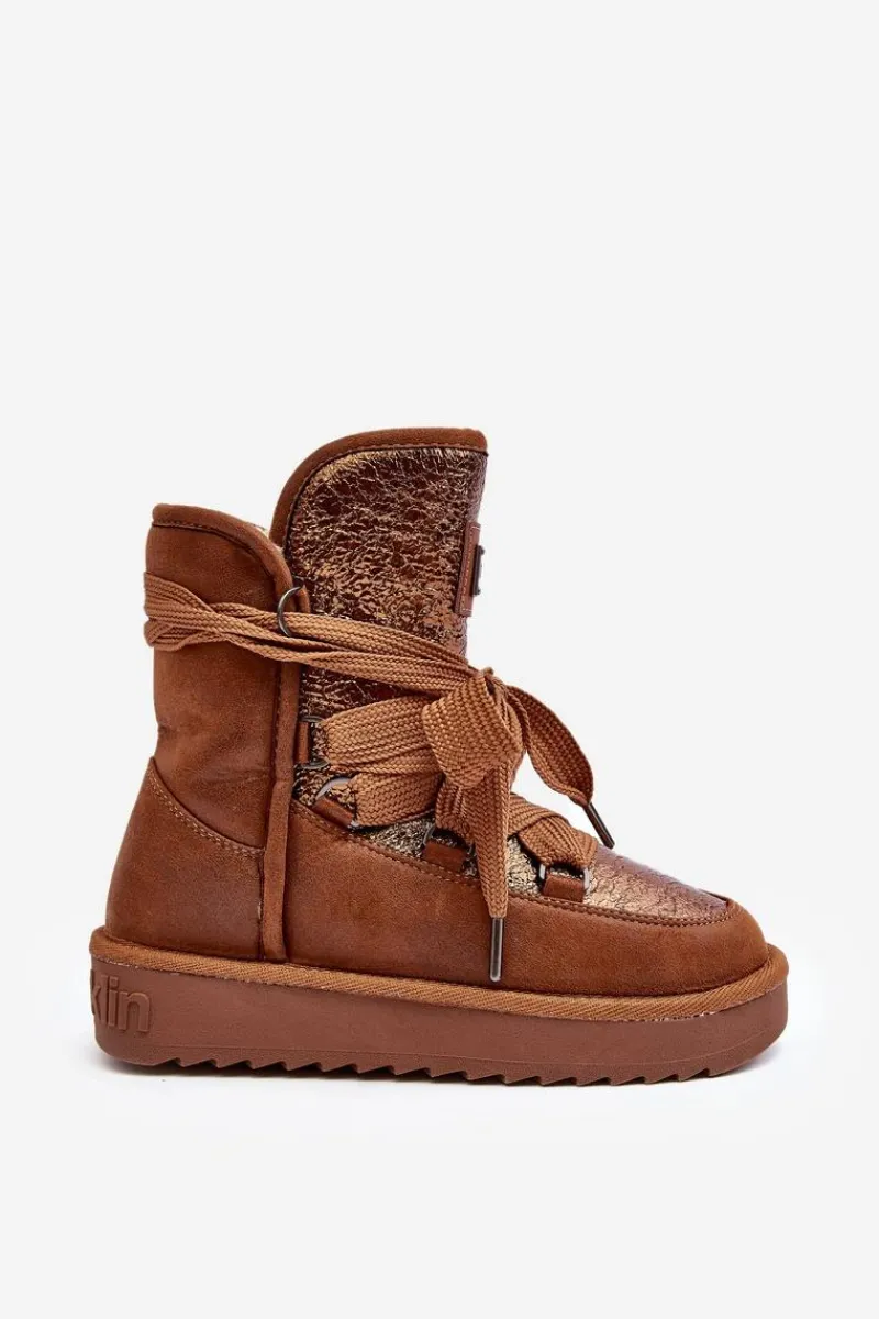 Śniegowce damskie wykonane z wysokiej jakości tkaniny z mikrofibry. Przód butów został ozdobiony połyskującym detalem, co nadaje im stylowego charakteru. Dodatkowym atutem jest fakt, że są wykonane z materiałów wegańskich. Środek ocieplony syntetycznym futerkiem. Model ten posiada grube sznurowadła. Modne i funkcjonalne obuwie, które z pewnością wyróżni się w Twojej kolekcji! Przy wyborze rozmiaru prosimy sugerować się tabelą rozmiarów.