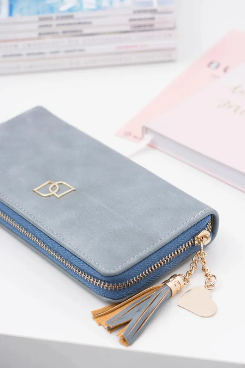 Przedstawiamy piękny portfel dla eleganckich Pań. Produkt ten charakteryzuje wyjątkowy szyk wzorowany na trendach mody. Portfele wykonane przy użyciu tylko najwyższej klasy materiałów. Staranne i piękne wykończenie portfela oddaje niesamowitą dbałość o detale oraz modowy gust. Wewnątrz znajdziemy 3 przegródki, które zapinane są na zamek przyozdobiony brelokiem ze złotym sercem oraz frędzelkami. Jedna z kieszonek zapinana jest na zameczek, która świetni sprawdzi się do przechowywania bilonu, dodatkowo po bokach znajduje się 8 przegródek na karty i dwie na większe dokumenty. Dostępne w kilku kolorach. Nie czekaj i spraw sobie ten wspaniały portfel!