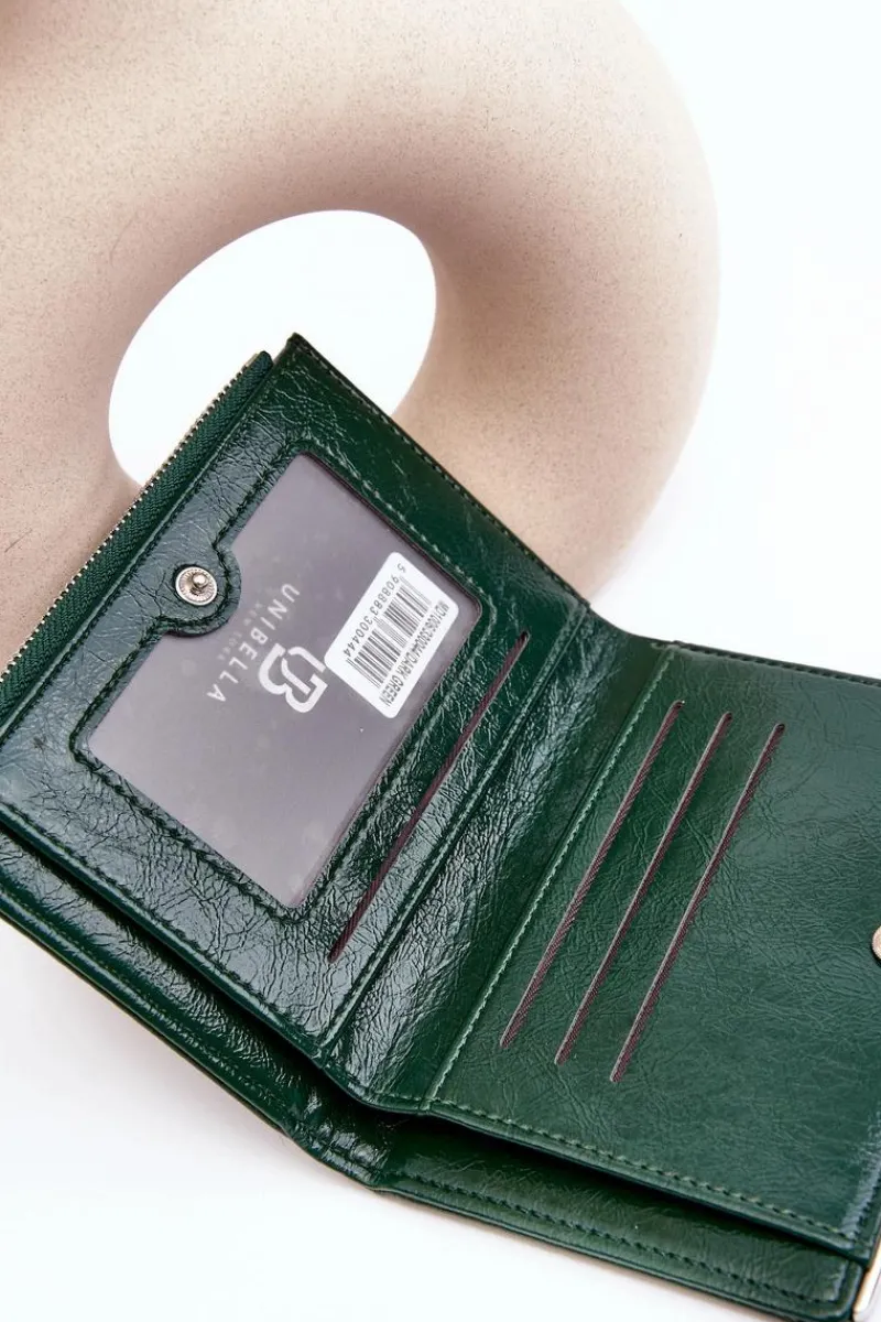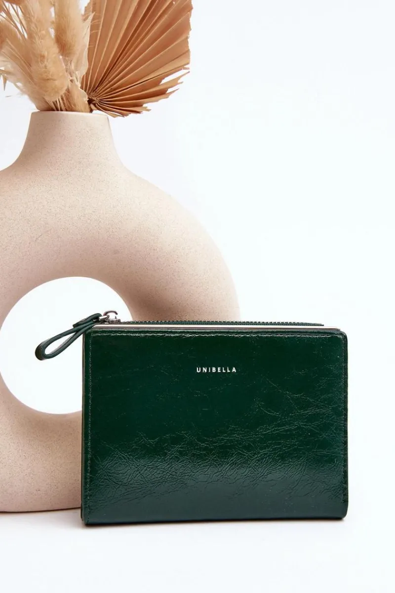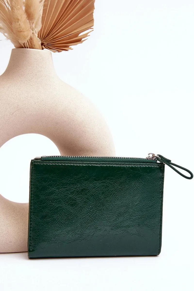 Portfel damski wykonany z połyskującej eko skóry. Zapinany na zatrzask oraz suwak. W środku miejsce na banknoty, karty, fotografię. Model ten posiada osobną kieszeń na monety. Doskonale sprawdzi się jako prezent!