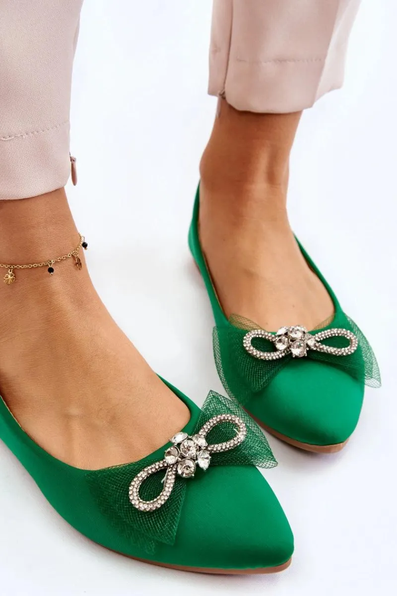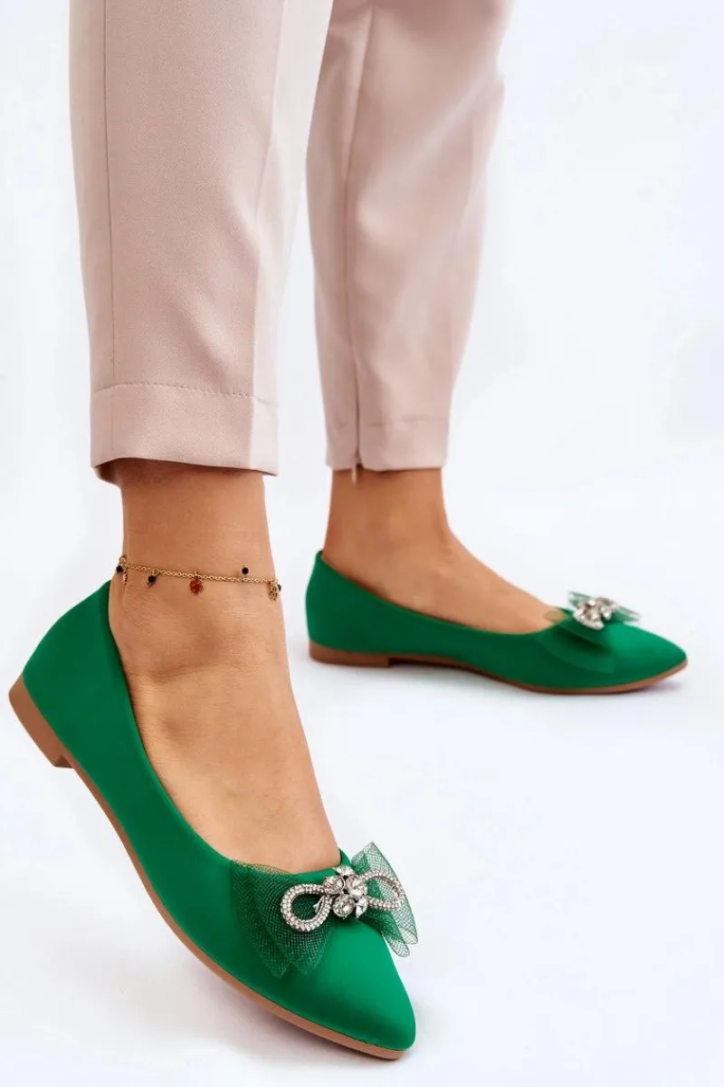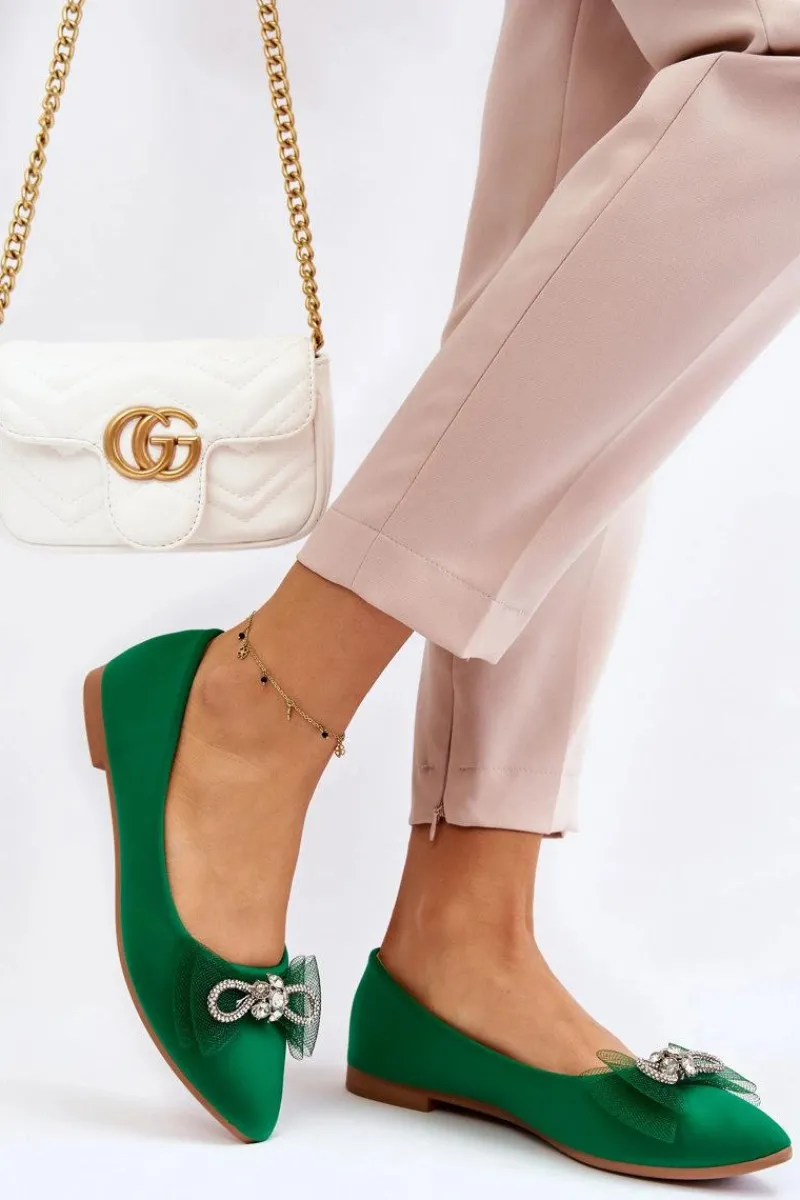 Eleganckie, damskie baleriny zostały wykonane z materiału tekstylnego. Model ten posiada na przodzie kokardę oraz dżety imitujące cyrkonie. Nosek w szpic. Baleriny to buty, z którymi stworzysz mnóstwo stylizacji. Będą idealne na różne, ważne okazje. Miękka wkładka wykonana z eko skóry zapewni wygodę podczas użytkowania. Przy wyborze rozmiaru prosimy sugerować się tabelą rozmiarów.