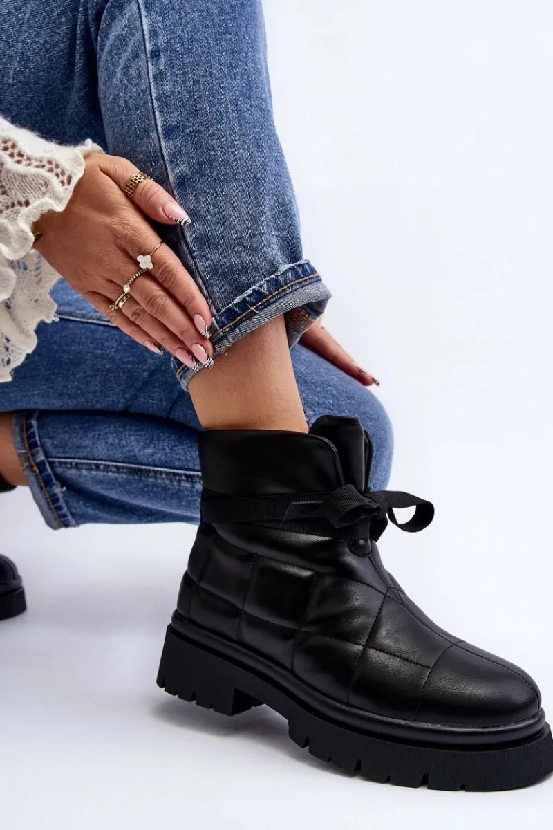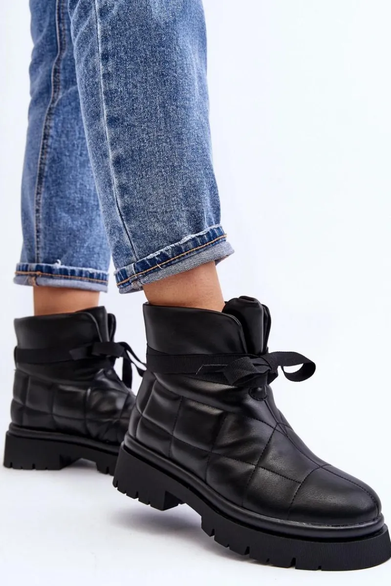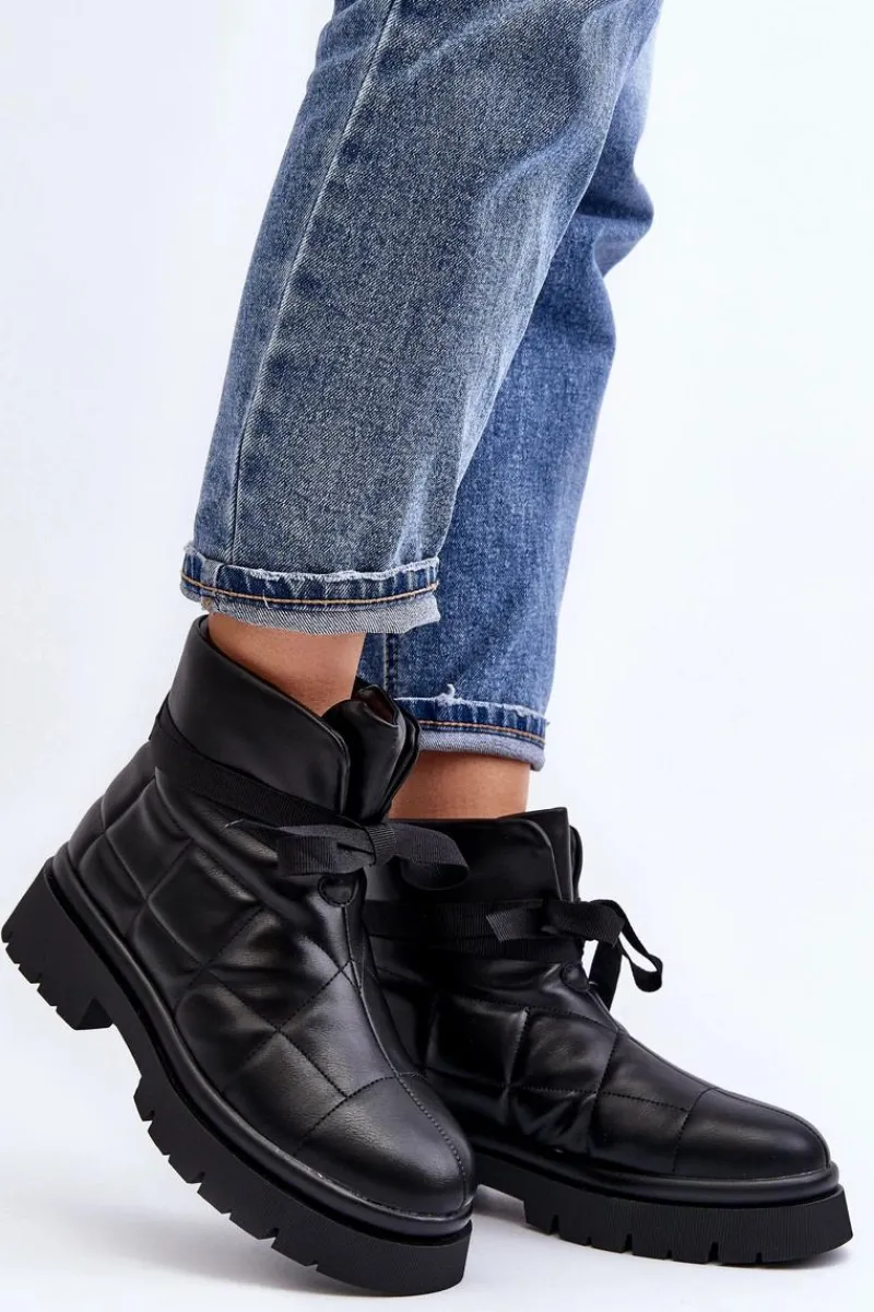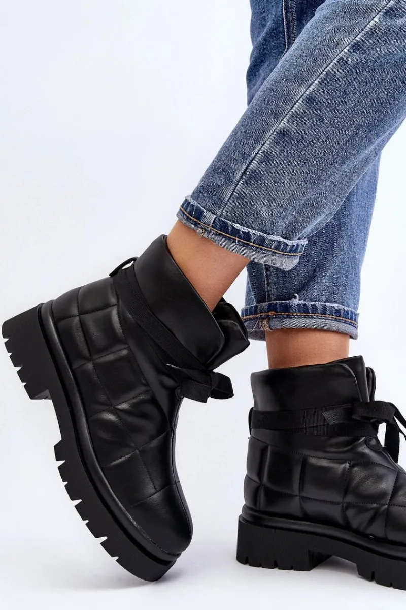 Ciepłe i modne botki wykonane z eko skóry. Osadzone na płaskim, stabilnym obcasie. Model wsuwany, z cholewką za kostkę. Środek ocieplony futerkiem. Cholewka ozdobiona pikowaniem. Dodatkowo zapiętek jest usztywniony. Idealne na chłodne dni! Przy wyborze rozmiaru prosimy sugerować się tabelą rozmiarów.