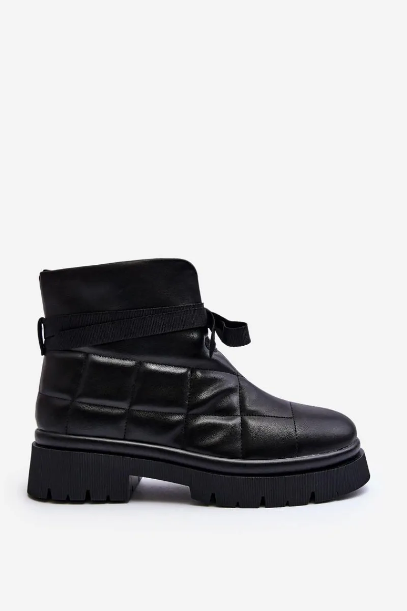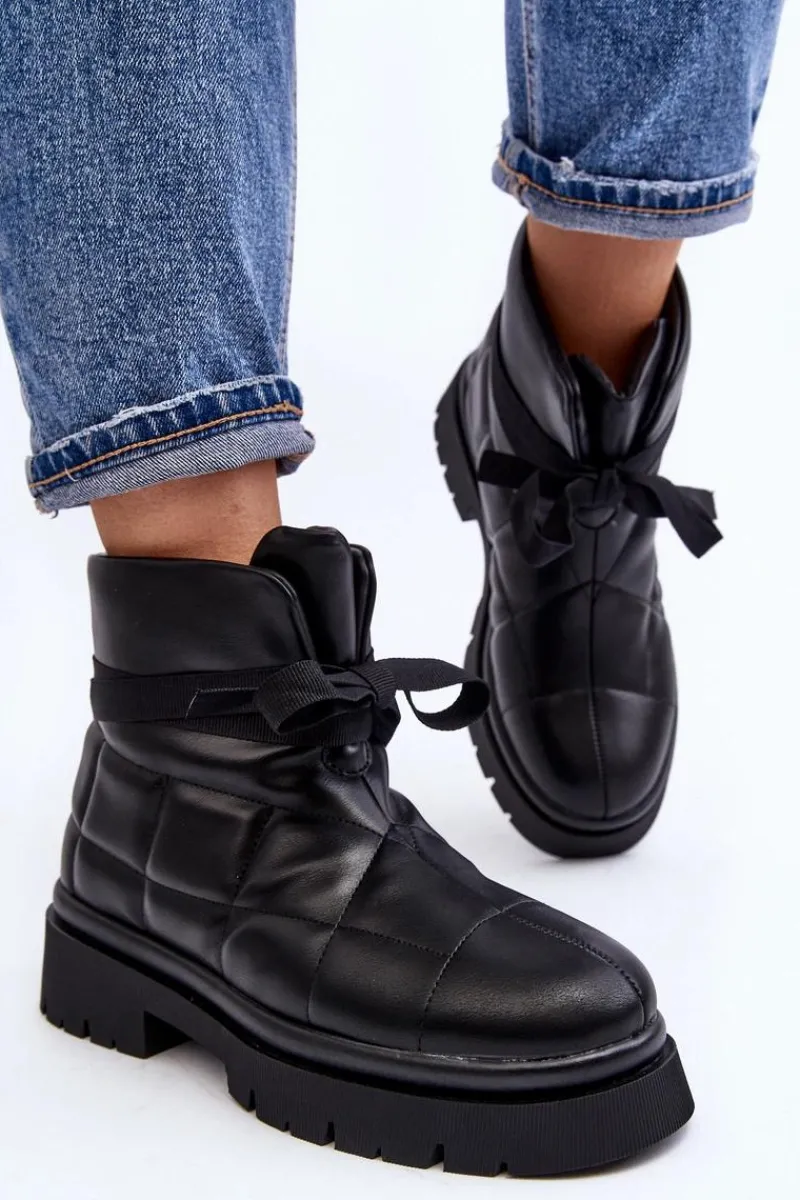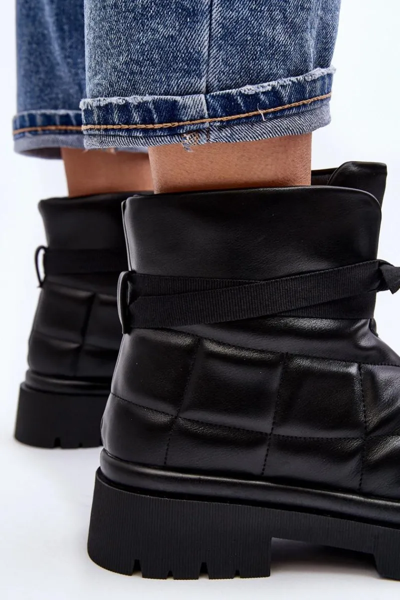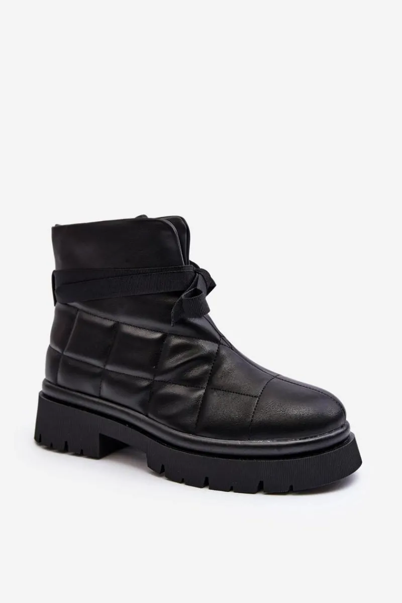 Ciepłe i modne botki wykonane z eko skóry. Osadzone na płaskim, stabilnym obcasie. Model wsuwany, z cholewką za kostkę. Środek ocieplony futerkiem. Cholewka ozdobiona pikowaniem. Dodatkowo zapiętek jest usztywniony. Idealne na chłodne dni! Przy wyborze rozmiaru prosimy sugerować się tabelą rozmiarów.