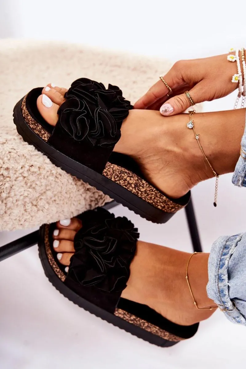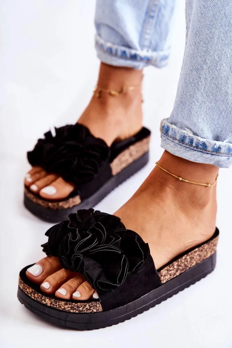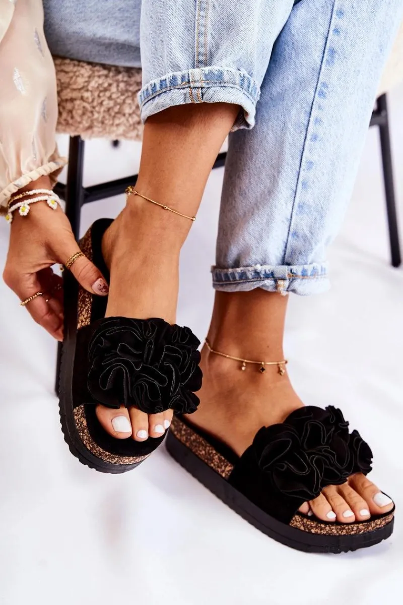 Klasyczne damskie klapki osadzone na masywnej platformie wykonanej z korka oraz tworzywa sztucznego. Na przodzie znajduje się przyszyta ozdoba z eko zamszu. Profilowana wkładka jest wygodna w użytkowaniu nawet przez cały dzień. Model wsuwany. Nie czekaj dłużej i kup już dziś! Koniecznie powinnaś je mieć! Przy wyborze rozmiaru prosimy sugerować się tabelą rozmiarów.