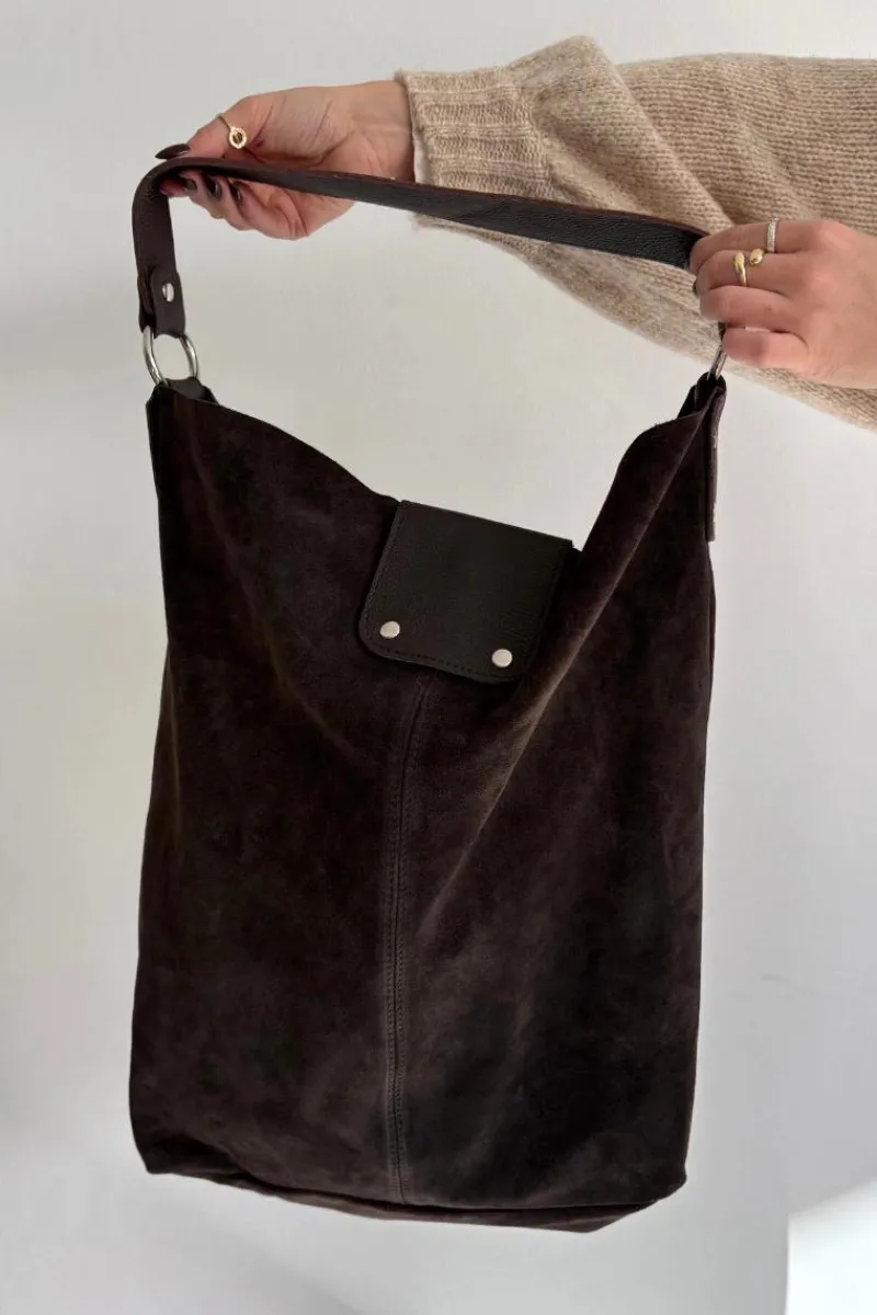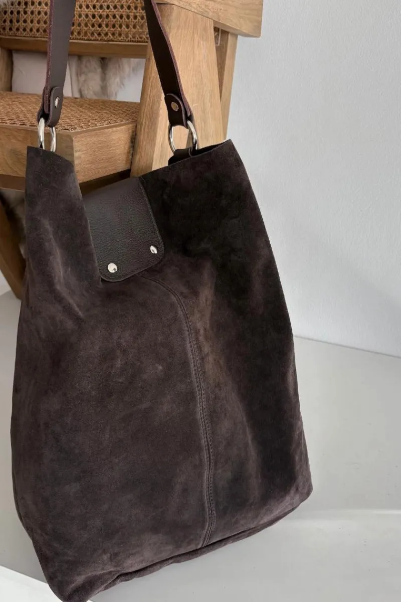 Duża torebka damska typu shopper wykonana z naturalnego zamszu to idealne połączenie elegancji i funkcjonalności. Model zapinany jest na klips magnetyczny, co zapewnia wygodę użytkowania i szybki dostęp do zawartości. Torebka jest jednokomorowa, z jedną praktyczną kieszenią wewnętrzną, ułatwiającą organizację drobiazgów. Dwa paski – krótki, nieodpinany uchwyt do noszenia w dłoni oraz dłuższy, odpinany pasek, który umożliwia noszenie jej na ramieniu. To klasyczny shopper o ponadczasowym fasonie, idealny zarówno do codziennych stylizacji.