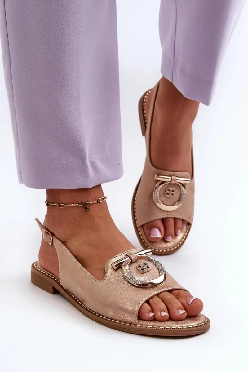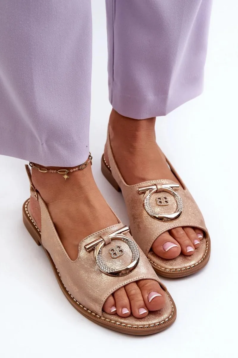 Eleganckie sandały damskie od marki S.Barski wykonane z eko skóry. Osadzone na płaskim obcasie. Złota ozdoba dodaje im subtelnego uroku. Skórzana wkładka comfort zapewni wygodę podczas użytkowania. Zapinane na regulowany pasek ze sprzączką. Doskonałe na wiele różnych okazji! Przy wyborze rozmiaru prosimy kierować się tabelą rozmiarów.