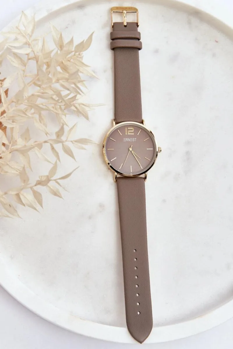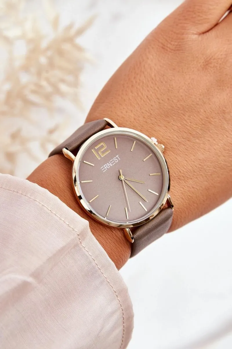 Damski zegarek marki Ernest. Tarcza zegarka wykonana jest ze stali nierdzewnej. Eko skórzany pasek jest regulowany. Nie zawiera niklu. Klasyczny model, który dopełni niemalże każdą stylizację!