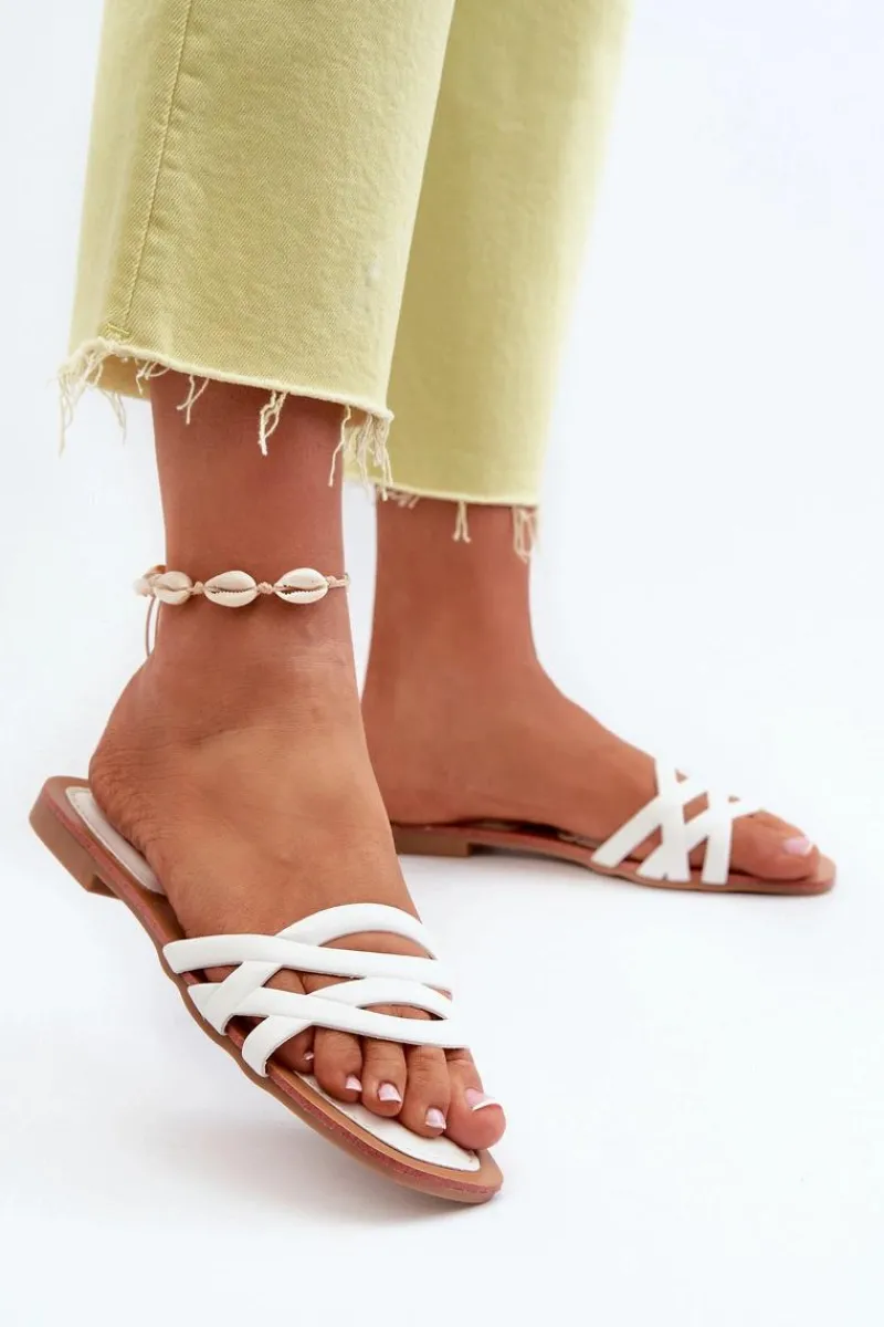 Klapki damskie wykonane z eko skóry. Płaski obcas sprawia, że są niezwykle wygodne podczas długich spacerów czy letnich wypadów. Modny design pozwala na swobodne łączenie ich zarówno z sukienkami, jak i spodniami, nadając letniej stylizacji niepowtarzalnego uroku. Model ten będzie pasować na wąską stopę. Przy wyborze rozmiaru prosimy sugerować się tabelą rozmiarów.
