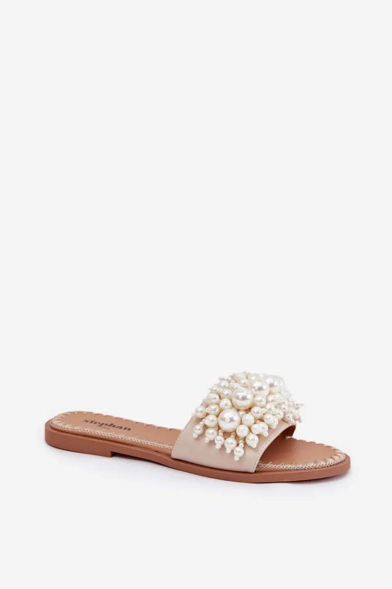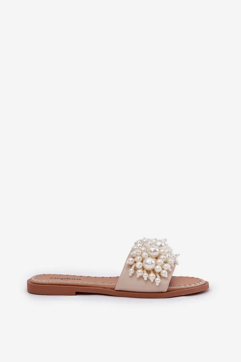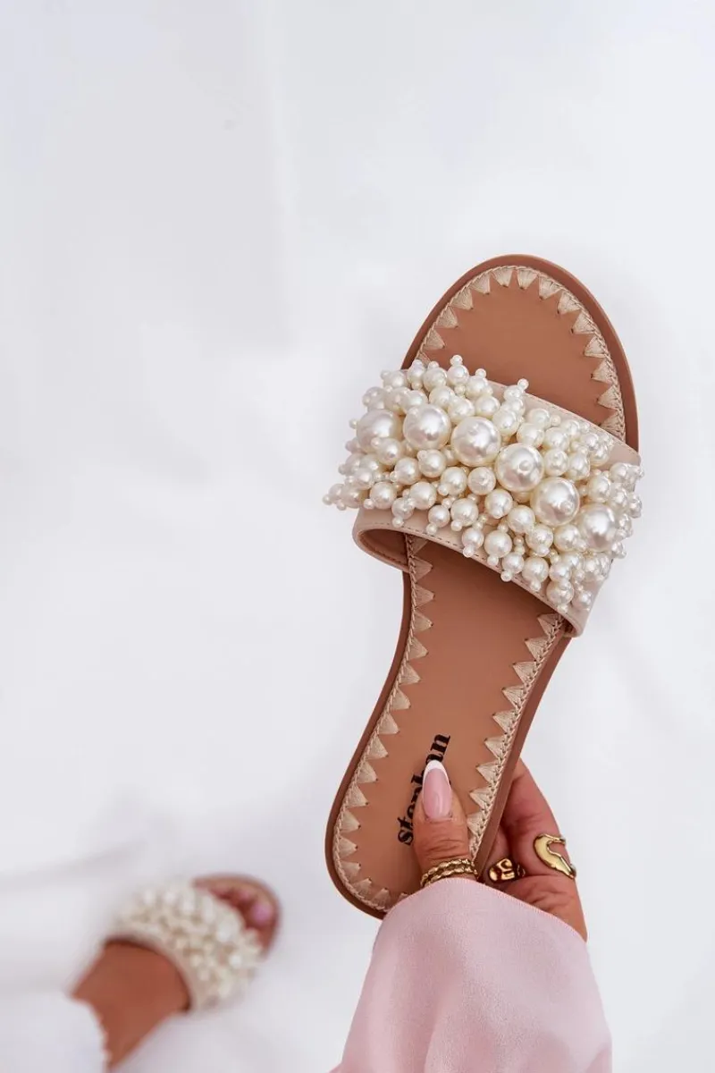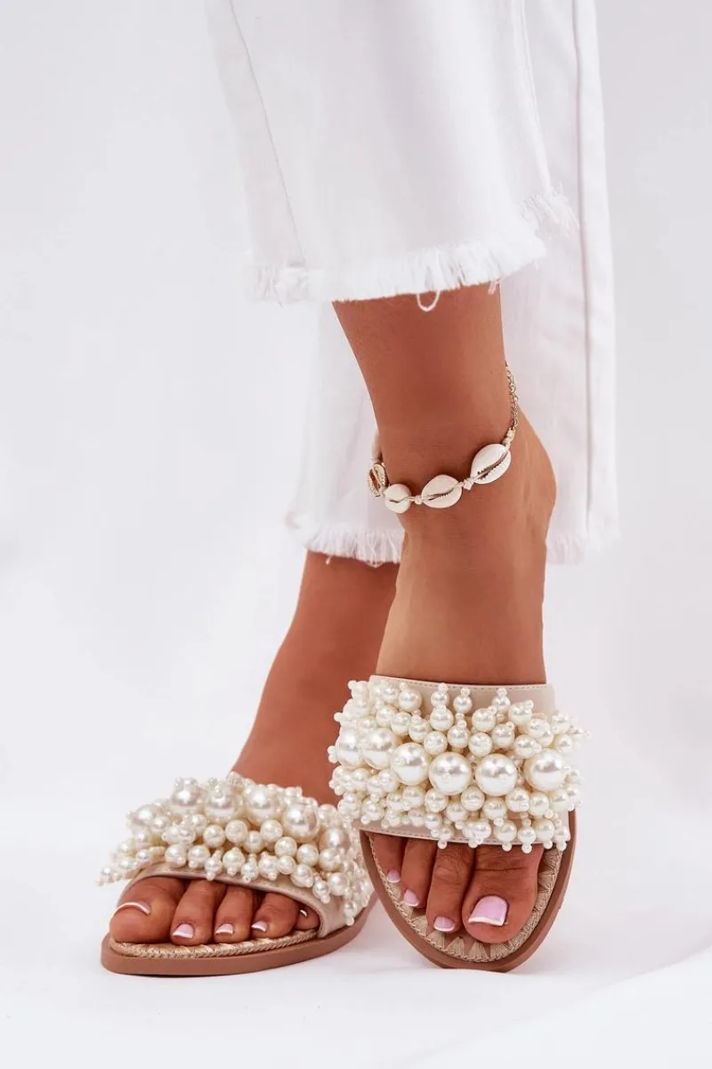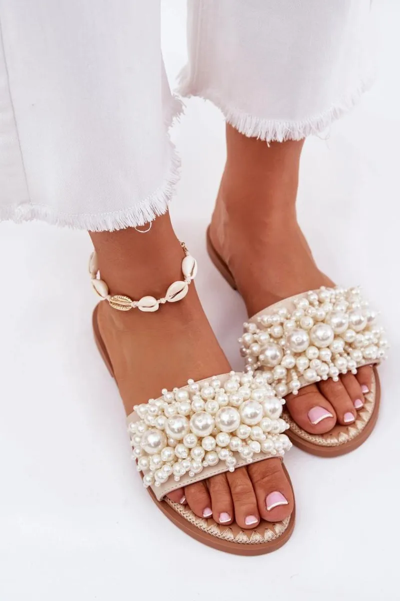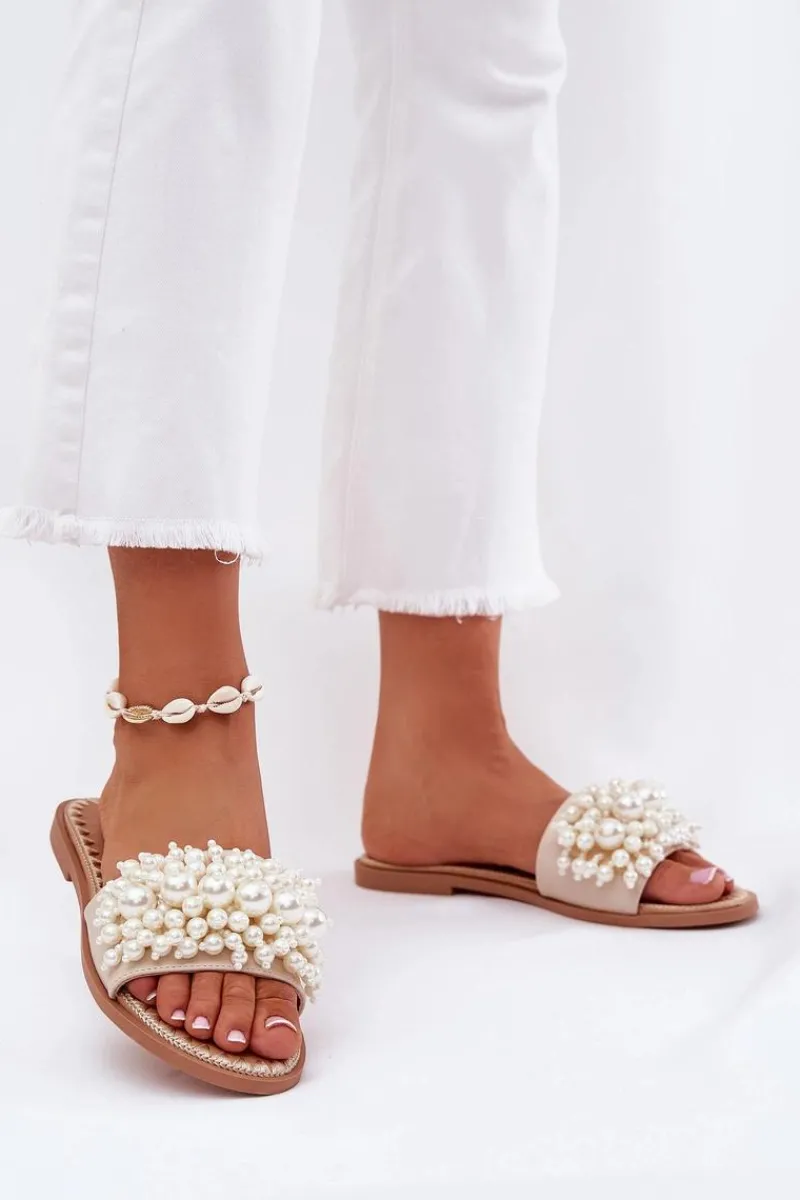 New Klapki Damskie Płaskie Z Ozdobnymi Koralikami Beżowe Aricca Damskie Klapki Damskie Klasyczne