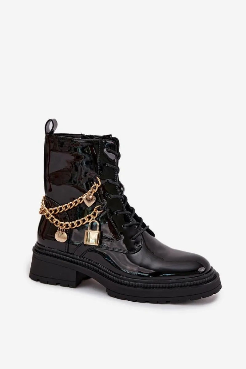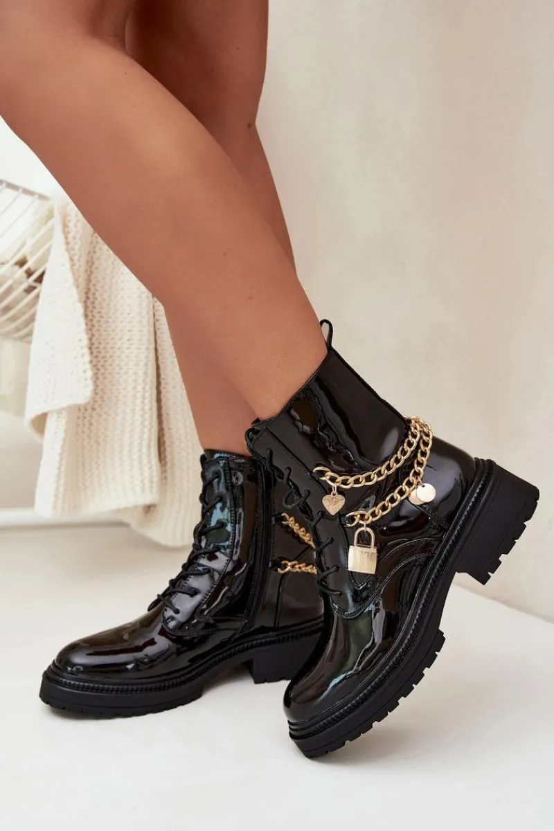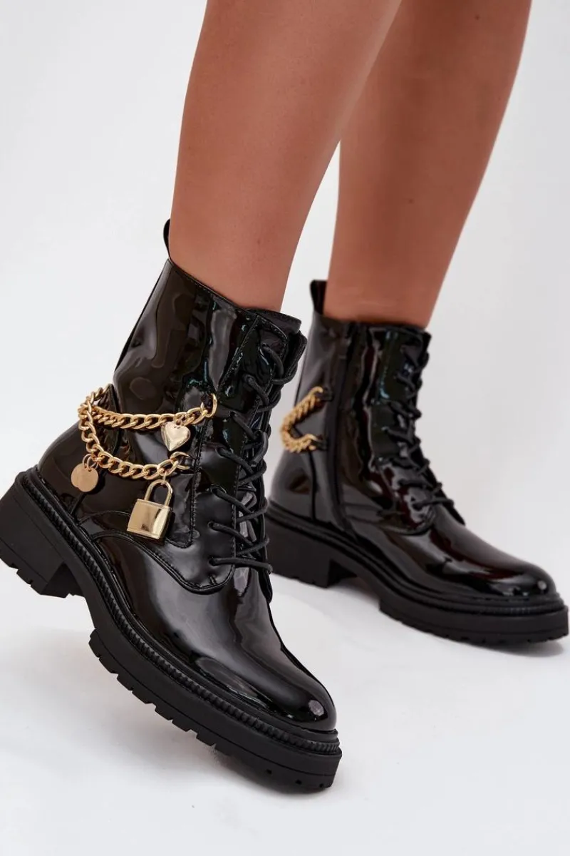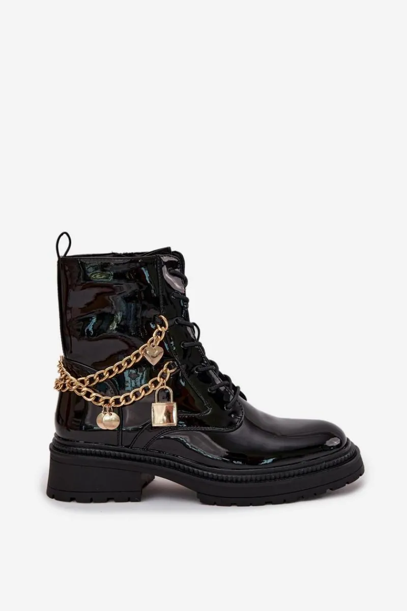 Stylowe botki damskie z eko skóry to doskonała propozycja na chłodniejsze dni. Ozdobione złotym łańcuchem z zawieszkami, które dodają modnego akcentu. Model zapinany na zamek i sznurowany umożliwia idealne dopasowanie do stopy. Środek ocieplony kocem obuwniczym gwarantuje ciepło i komfort, nawet w mroźne dni. Idealne na co dzień, te botki połączą funkcjonalność z modnym wyglądem, doskonale komponując się w różnych jesienno-zimowych stylizacjach. Przy wyborze rozmiaru prosimy sugerować się tabelą rozmiarów.