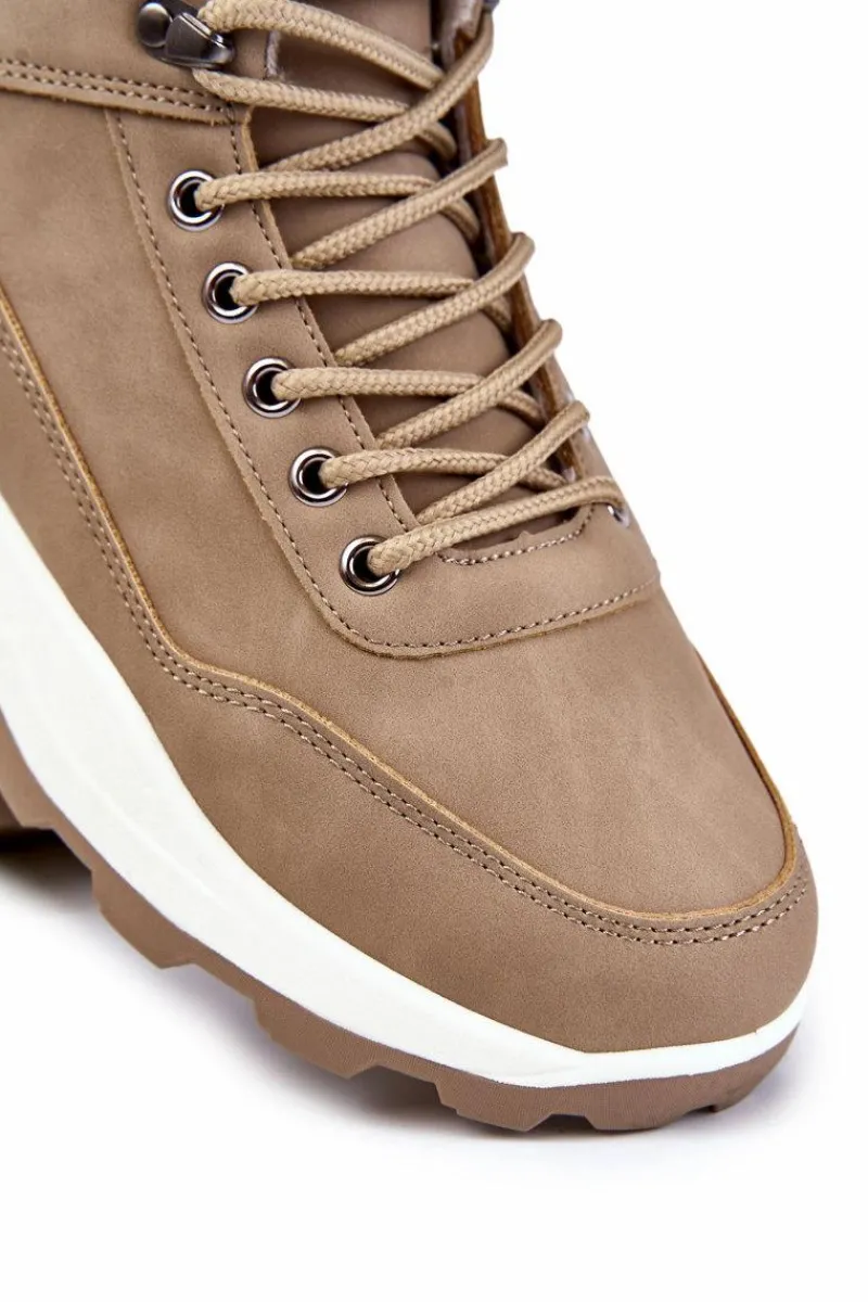 Wygodne buty trekkingowe świetnie sprawdzą się podczas jesienno-zimowych dni. Fason w stylu traperów. Wykonane z eko skóry. Buty te posiadają z boku ozdobne tłoczenie. Klasyczne sznurowanie zapewni odpowiednie dopasowanie do tęgości nogi. Trapery posiadają w środku ocieplenie w postaci futerka. Osadzone na platformie z podeszwą z bieżnikiem. Przy wyborze rozmiaru prosimy kierować tabelą rozmiarów.