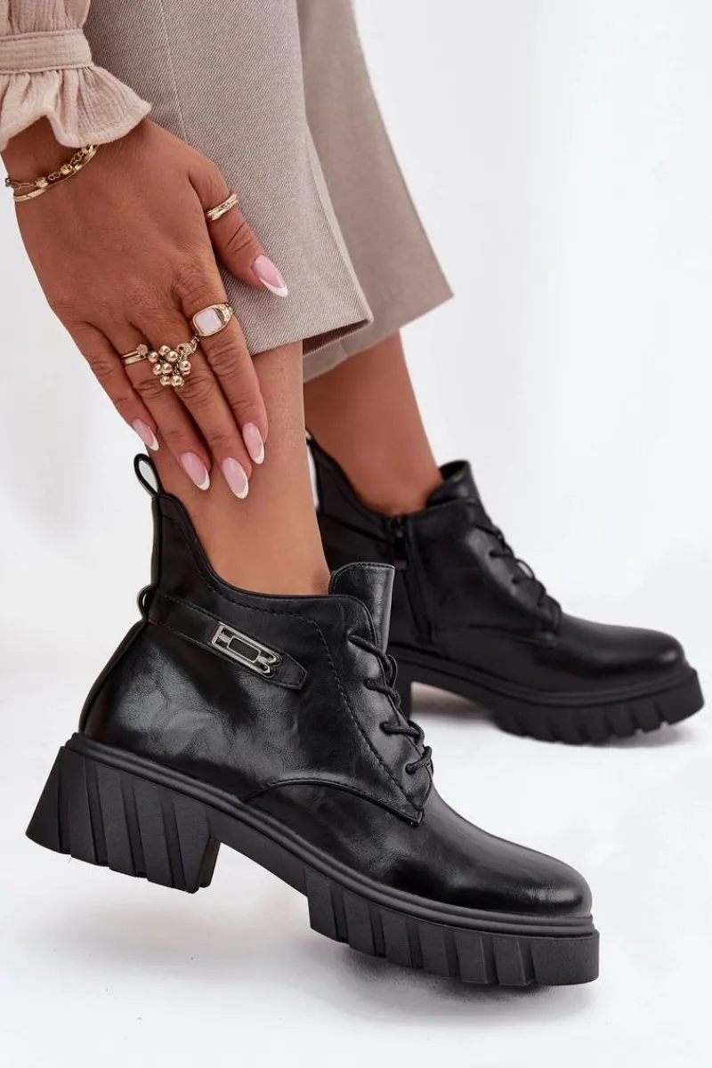 Niskie botki damskie od marki Jezzi wykonane z wysokiej jakości eko skóry to połączenie wygody i modnego wyglądu na co dzień. Osadzone na stabilnym obcasie typu klocek, zapewniają pewny krok i komfort noszenia przez cały dzień. Model łączy praktyczne sznurowanie z zamkiem błyskawicznym, co umożliwia szybkie zakładanie i idealne dopasowanie do stopy. Na cholewce znajduje się subtelny, ozdobny paseczek, który dodaje eleganckiego akcentu, sprawiając, że świetnie komponują się zarówno z casualowymi, jak i bardziej formalnymi outfitami. Przy wyborze rozmiaru prosimy sugerować się tabelą rozmiarów.