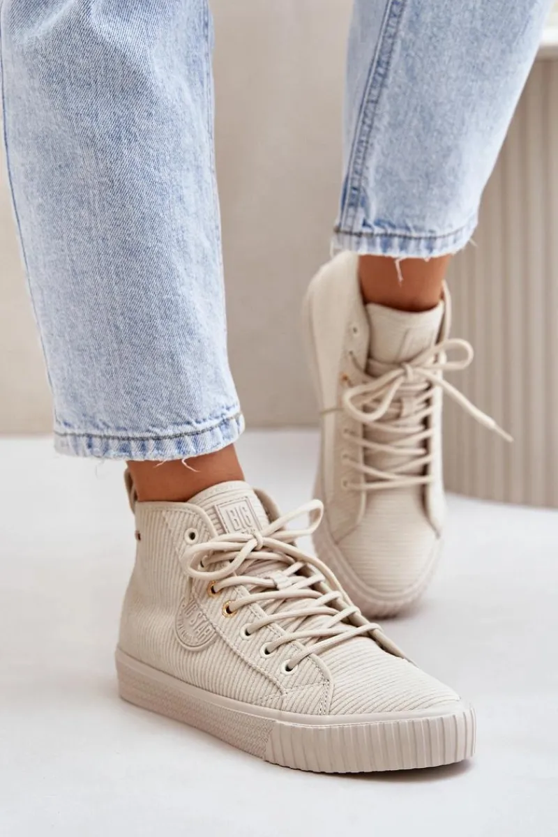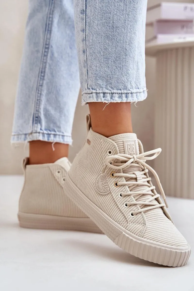 Trampki damskie z prążkowaną cholewką od marki Big Star. Wykonane z materiału tekstylnego. Osadzone na podeszwie z gumowego tworzywa. Noski zaokrąglone. Środek ocieplany futerkiem typu baranek. Dodatkowo model ten posiada wkładkę HI-POLY SYSTEM, która jest oddychająca, absorbuje wilgoć, amortyzuje wstrząsy oraz jest odporna na ścieranie i odkształcenia. Przy wyborze rozmiaru prosimy sugerować się poniższą tabelą rozmiarów.