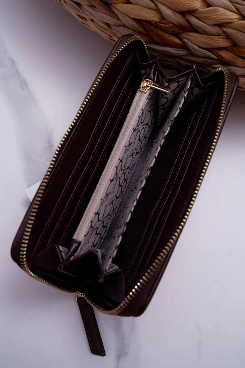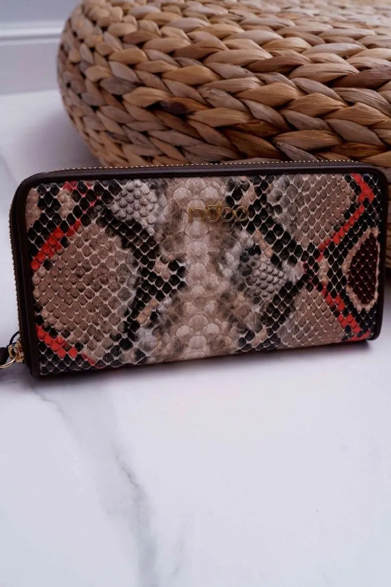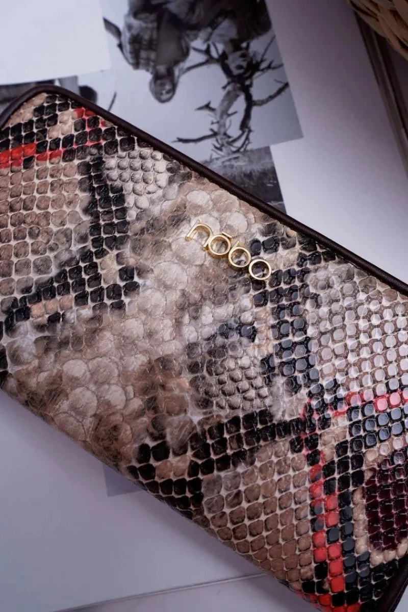 Elegancki damski portfel renomowanej marki NOBO. Klasyczny wężowy wzór wykonany ze skóry ekologicznej. Portfel zapinany na suwak. Wewnątrz znajduje się miejsce na 8 kart bądź innych dokumentów oraz cztery komory z czego jedna zapinana jest na suwak. Portfel zapakowany jest w eleganckie czarne pudełko z logiem marki.