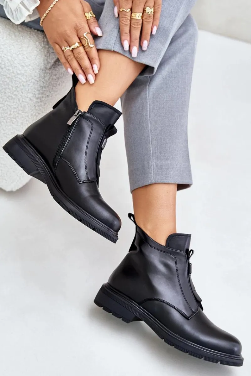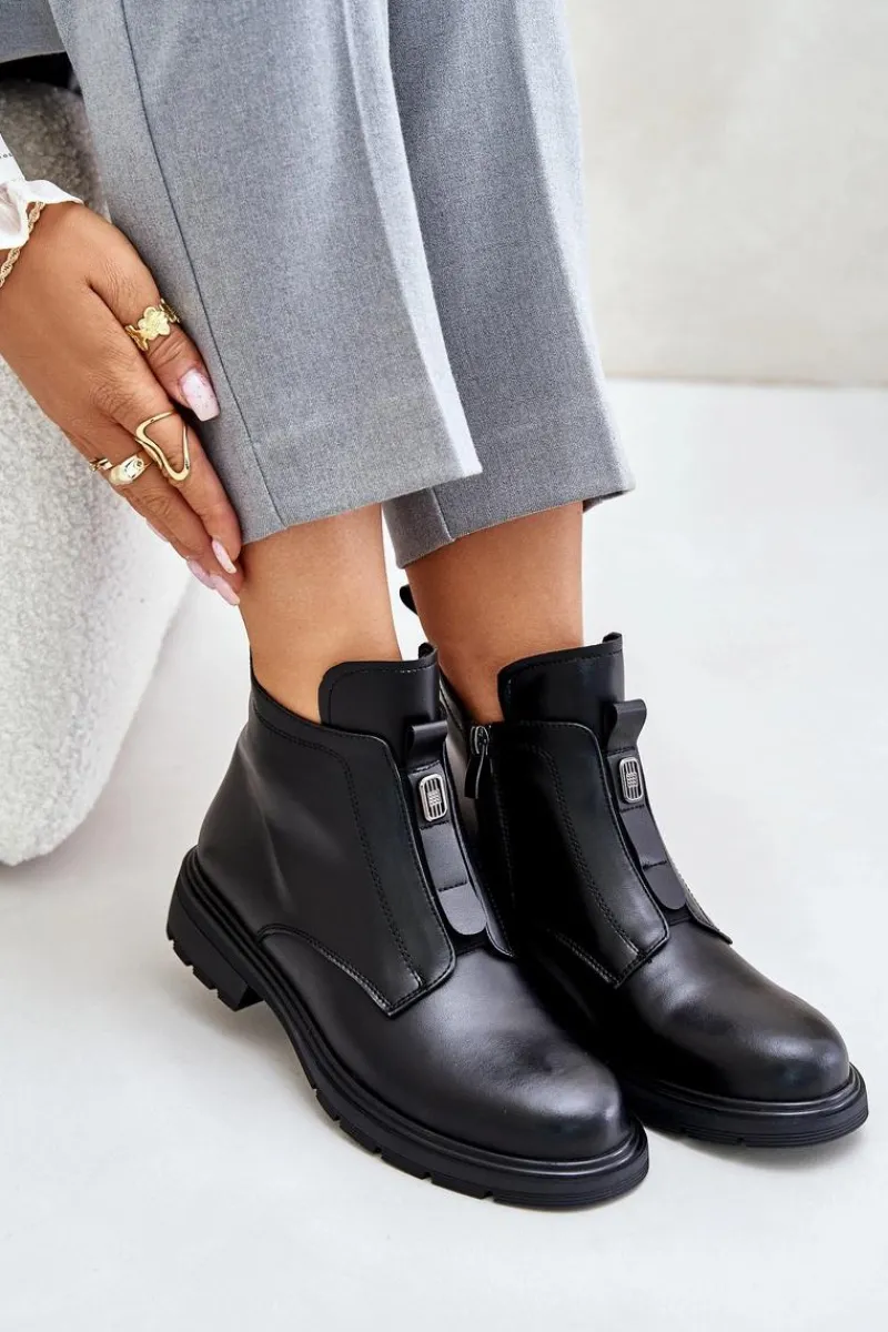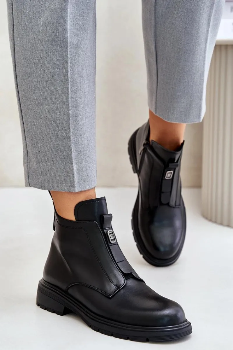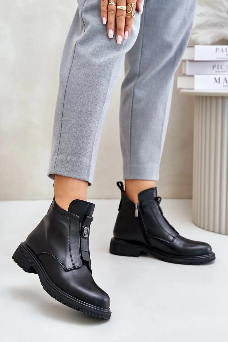 Damskie botki na płaskim obcasie, wykonane z wysokiej jakości naturalnej skóry, to stylowa i funkcjonalna opcja na chłodniejsze dni. Sięgające za kostkę, posiadają praktyczne zapięcie na zamek, które ułatwia zakładanie. Z przodu buty zdobi subtelny detal. Ocieplenie kocem obuwniczym, zapewni ciepło i komfort, idealnie wpisując się w codzienne, jesienno-zimowe stylizacje. Przy wyborze rozmiaru prosimy sugerować się tabelą rozmiarów.