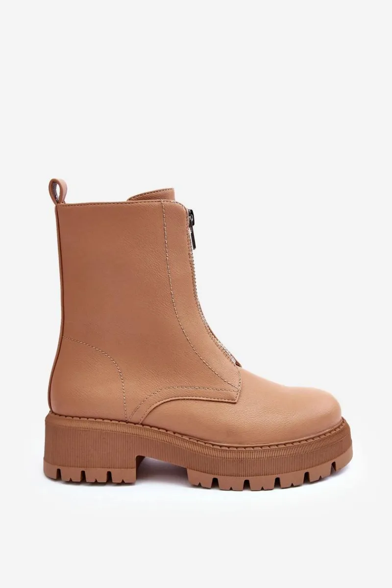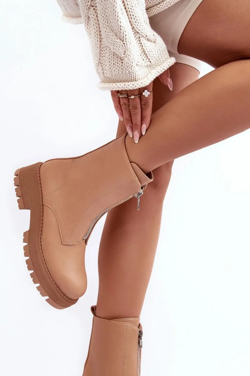 Modne botki damskie wykonane z eko skóry. Model z zaokrąglonym noskiem. Osadzone na płaskim, stabilnym obcasie i platformie. Zapinane na suwak z przodu. Środek ocieplony kocem obuwniczym. Zapiętek w tym obuwiu jest usztywniony. Przy wyborze rozmiaru prosimy sugerować się tabelą rozmiarów.