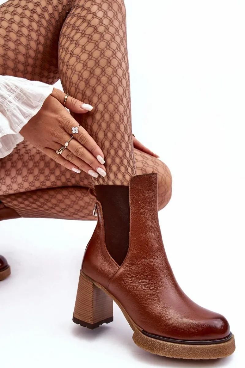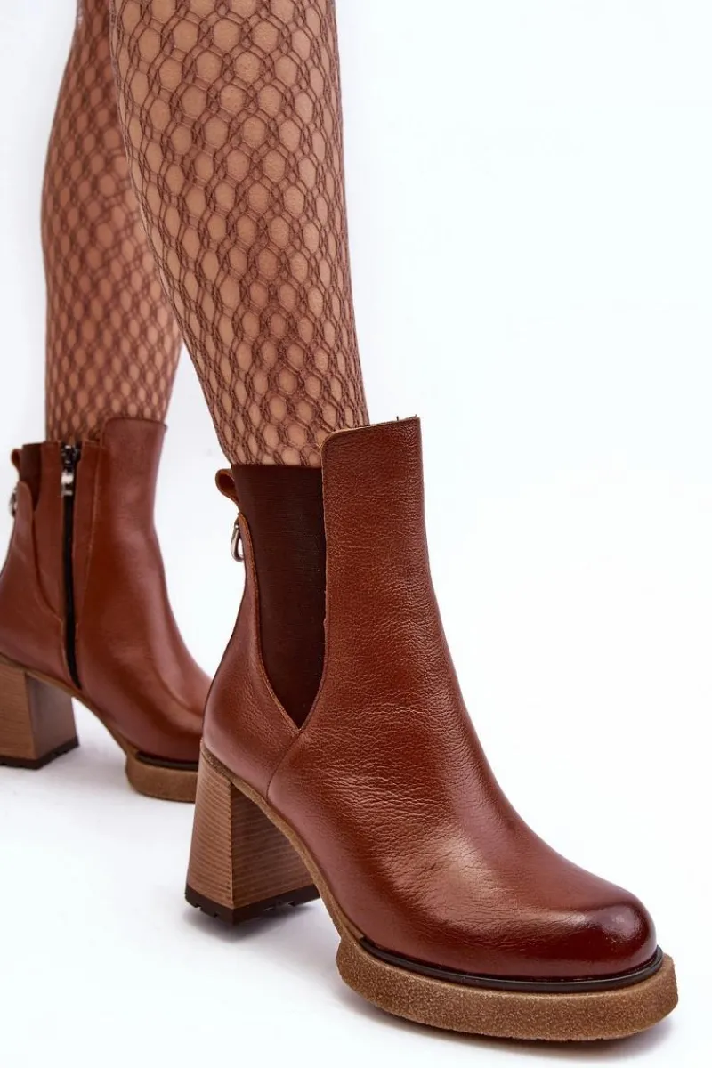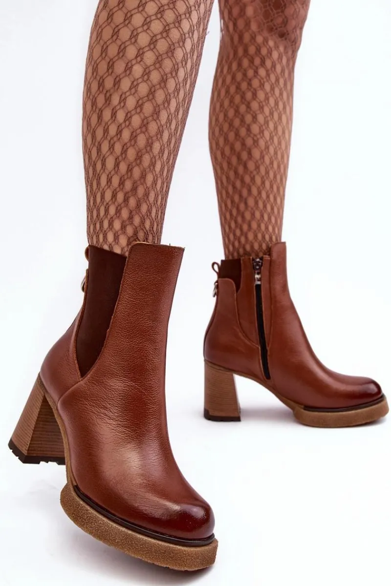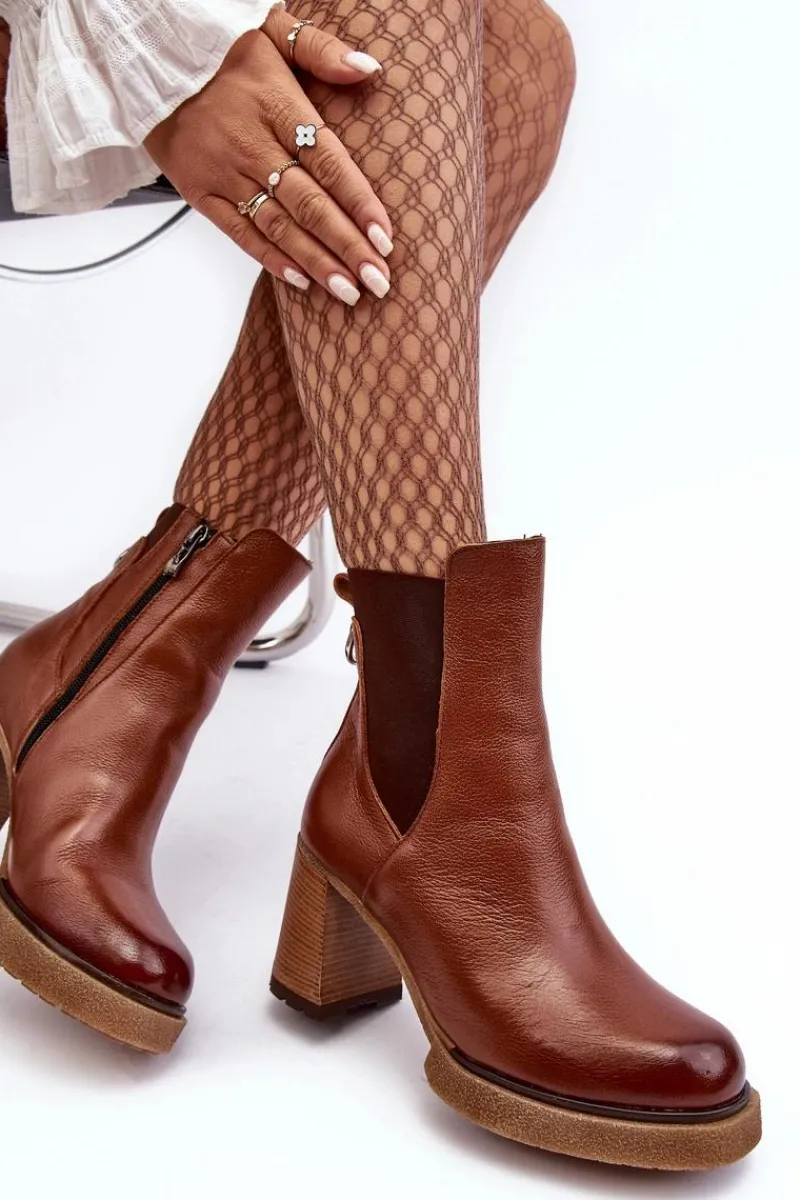 Botki na platformie i obcasie w postaci słupka. Cholewka za kostkę. Wykonane ze skóry naturalnej. Na cholewce elastyczna wstawka. Zapinane suwakiem po wewnętrznej stronie. Buty zostały ocieplone kocem obuwniczym. Podeszwa jest antypoślizgowa. Botki doskonale sprawdzą się w jesiennych stylizacjach. Przy wyborze rozmiaru prosimy kierować się tabelą rozmiarów