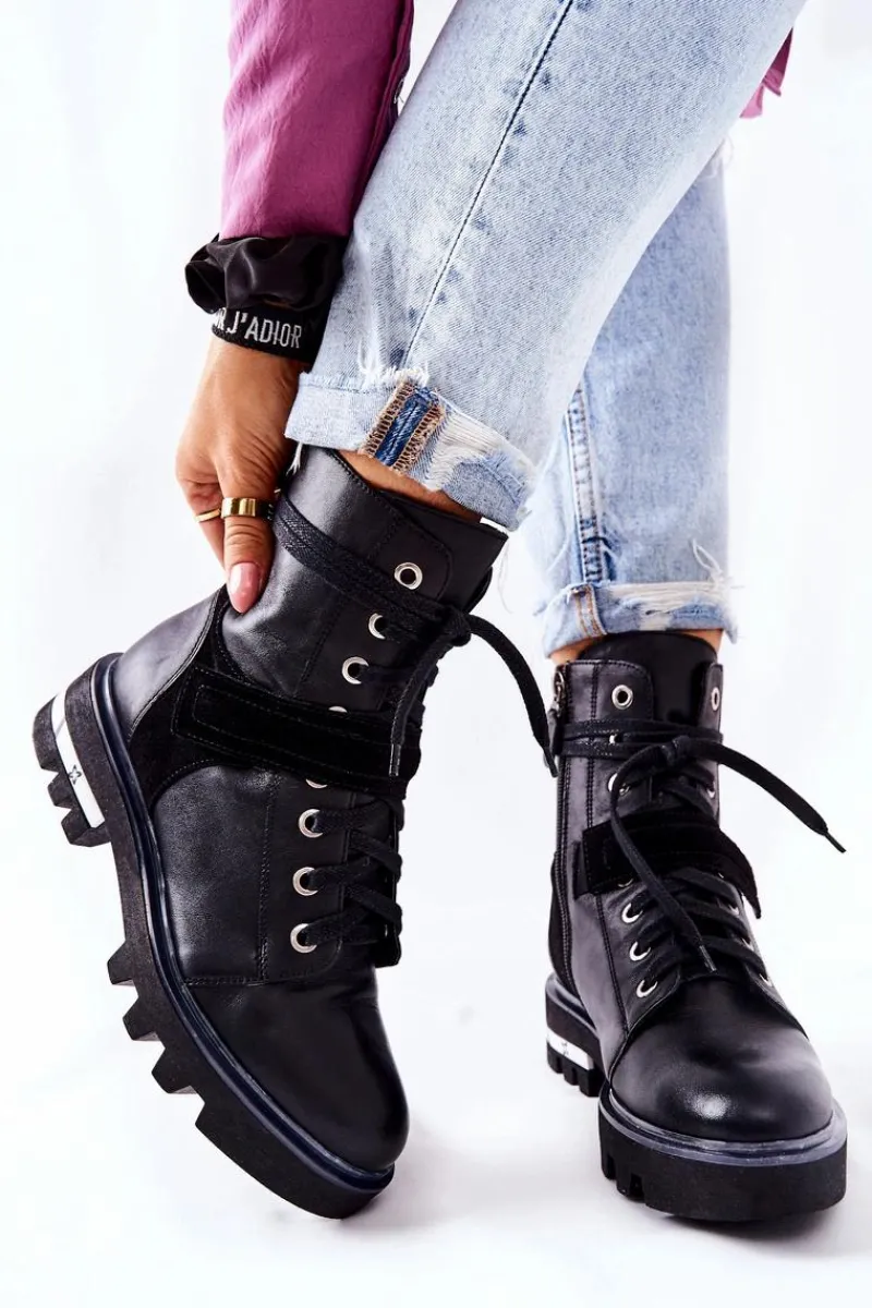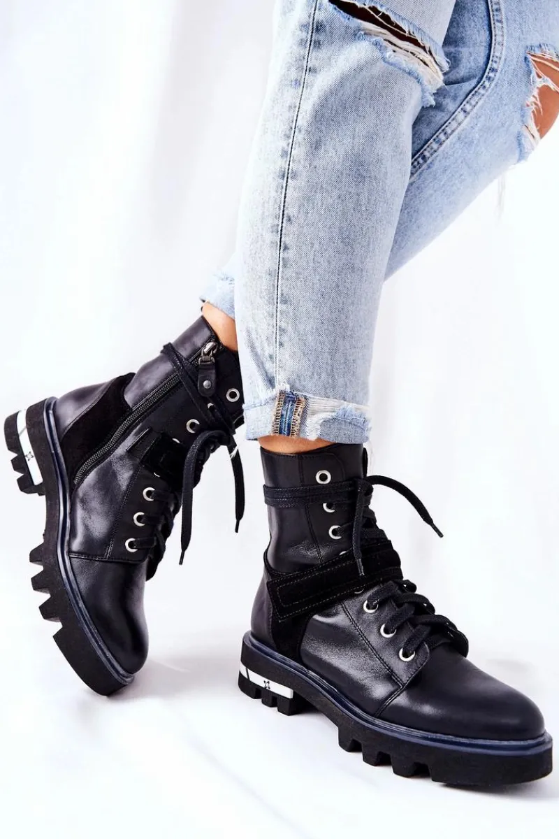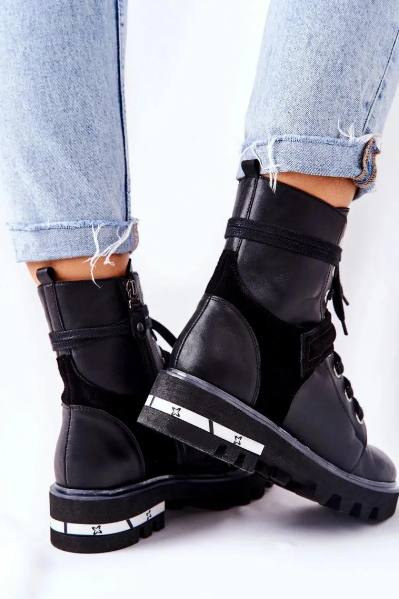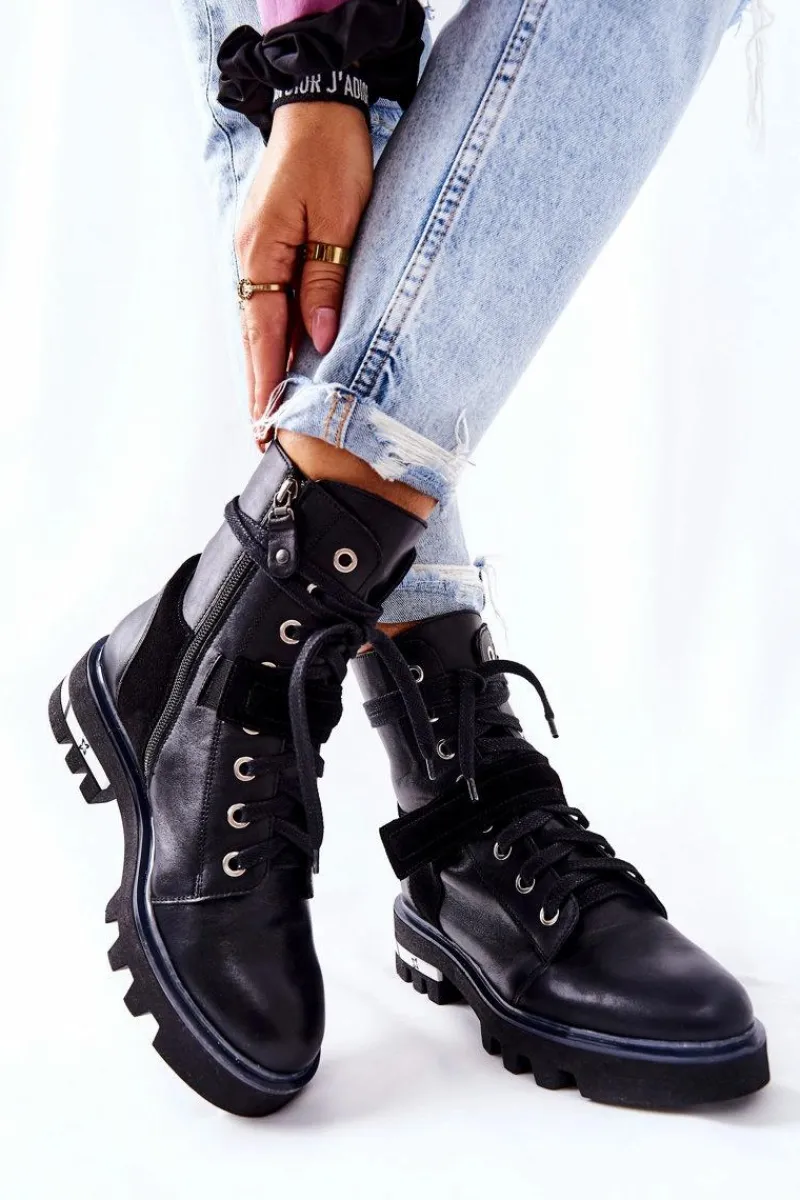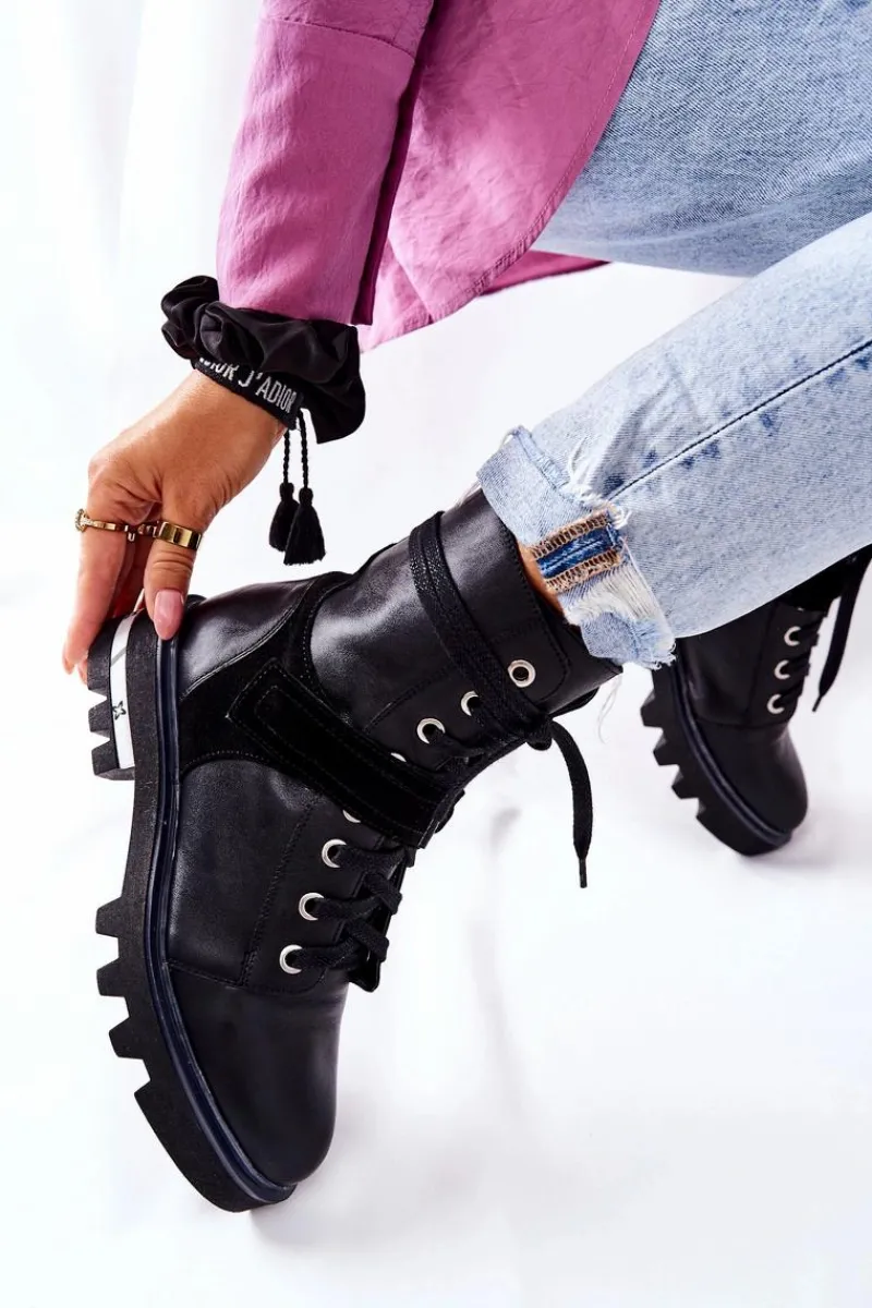 New Skórzane Botki Workery Czarne 05219-01 Damskie Botki Maciejka|Botki Sznurowane