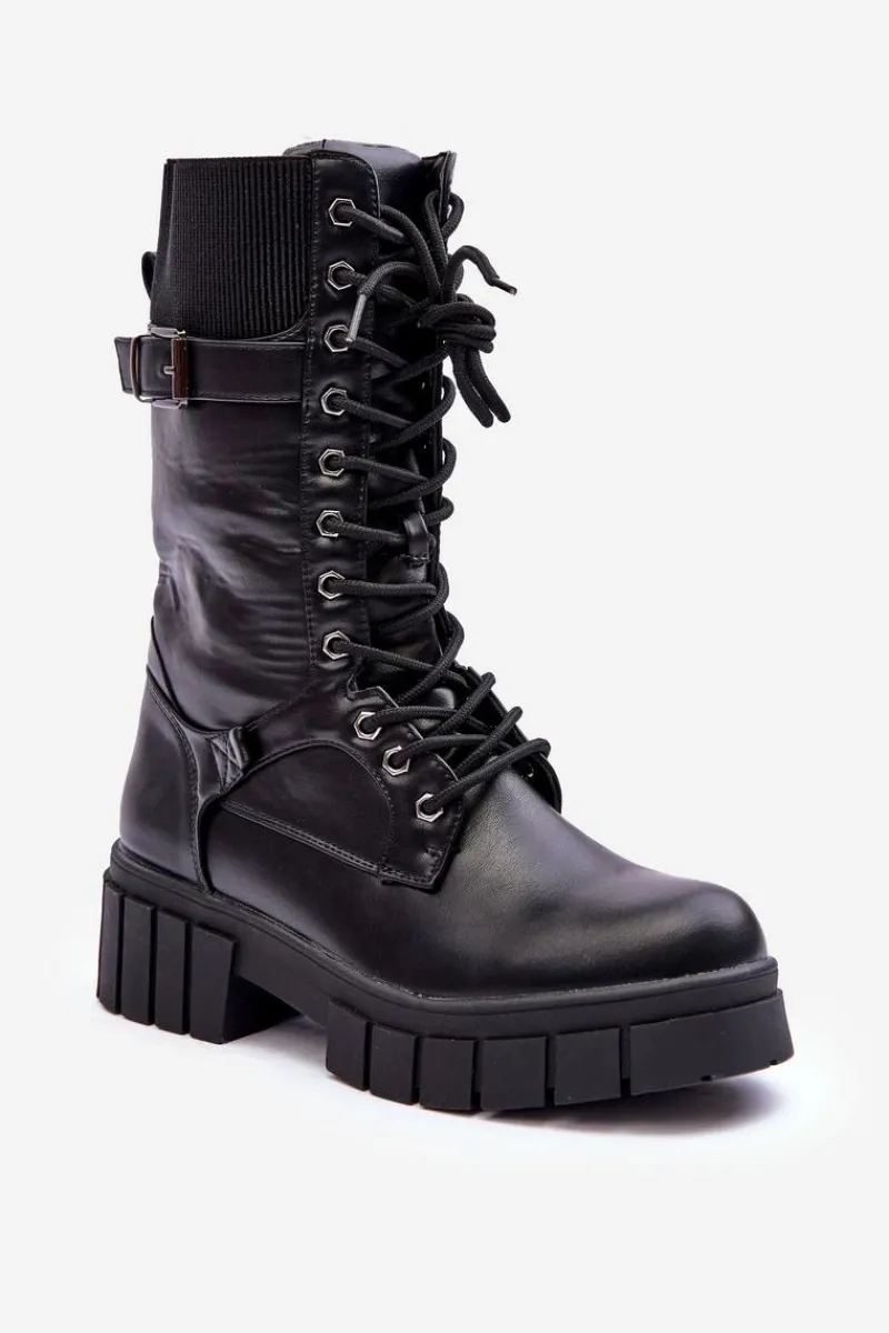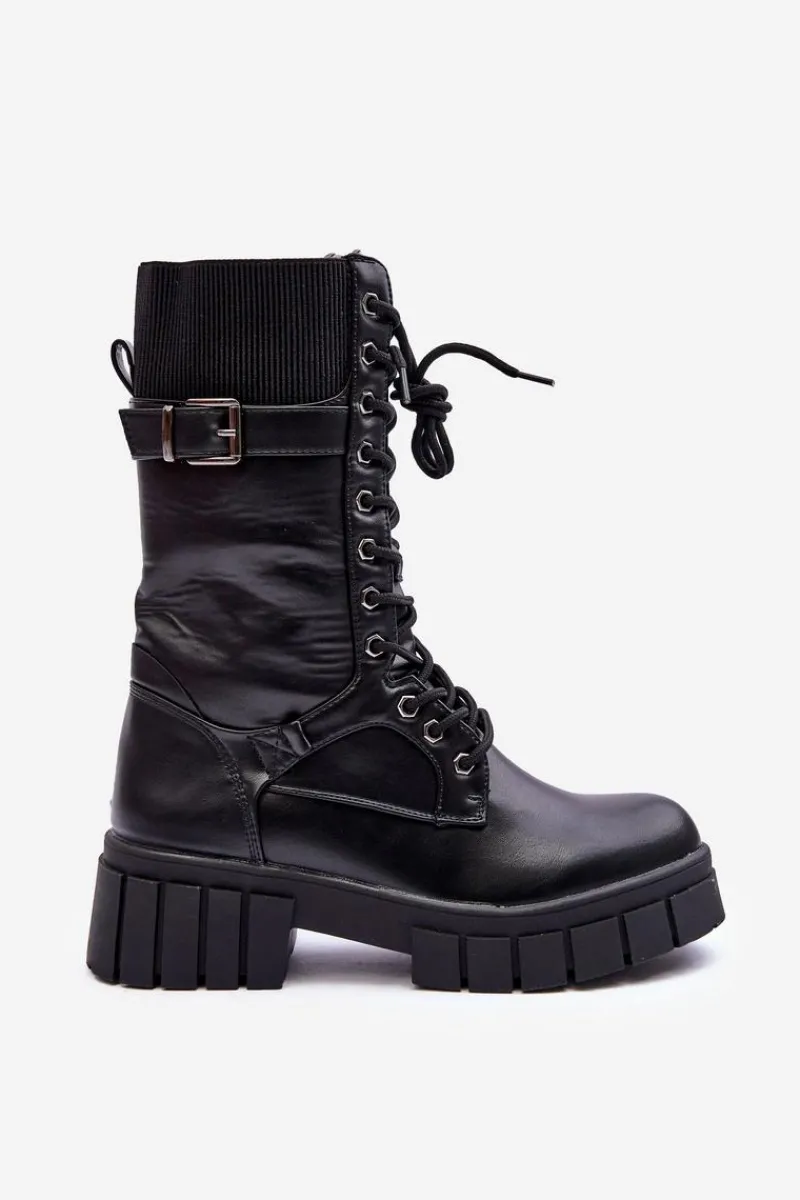 Buty wykonane ze skóry ekologicznej. Osadzone na masywnym obcasie i platformie. Zapinane na suwak z boku oraz dodatkowo sznurowane. Model ten posiada elastyczną wstawkę oraz paseczek z klamrą. Sprawdź całą naszą kolekcję wysokich botków! Przy wyborze rozmiaru prosimy sugerować się tabelą rozmiarów.