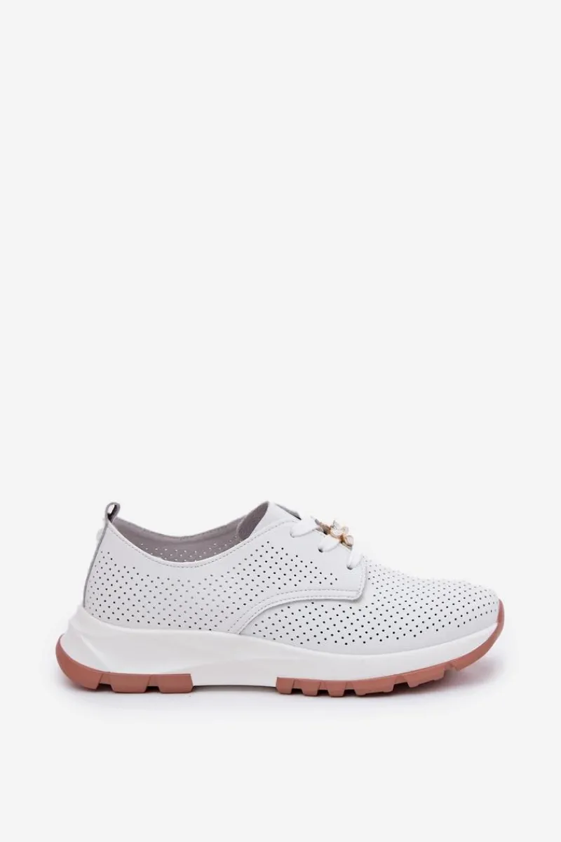 Półbuty damskie w sportowym stylu wykonane z naturalnej skóry to połączenie komfortu i modnego wyglądu. Osadzone na platformie, zapewniają lekkość i wygodę przez cały dzień. Sznurowanie ozdobione przypinką w kształcie kwiatuszków dodaje im urokliwego akcentu, a zaokrąglone noski gwarantują pełną swobodę ruchu. Skórzana wkładka dba o komfort stóp, czyniąc te półbuty doskonałym wyborem na co dzień. Przy wyborze rozmiaru prosimy sugerować się tabelą rozmiarów.