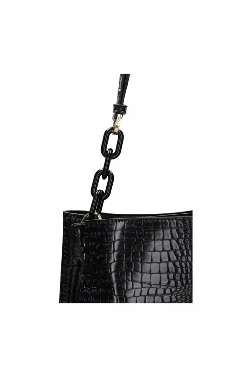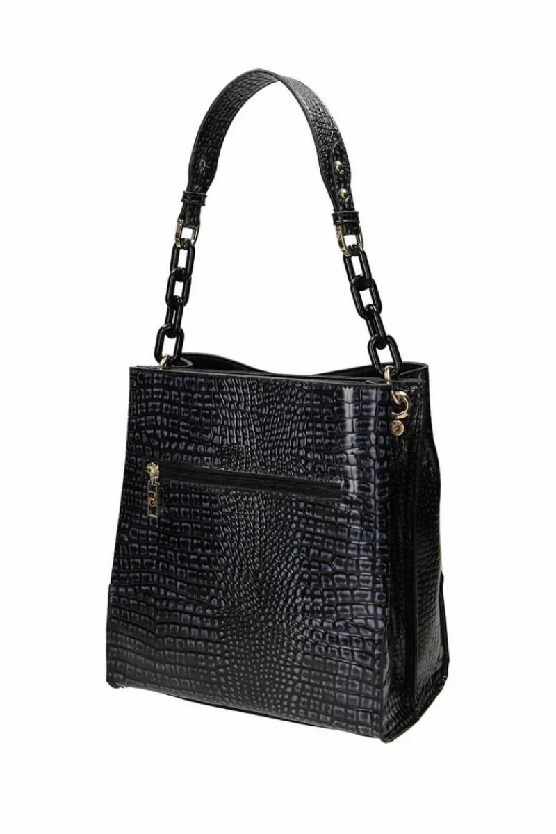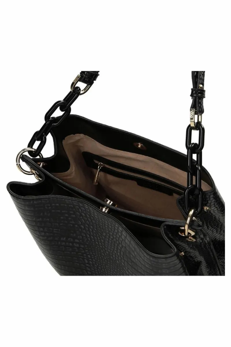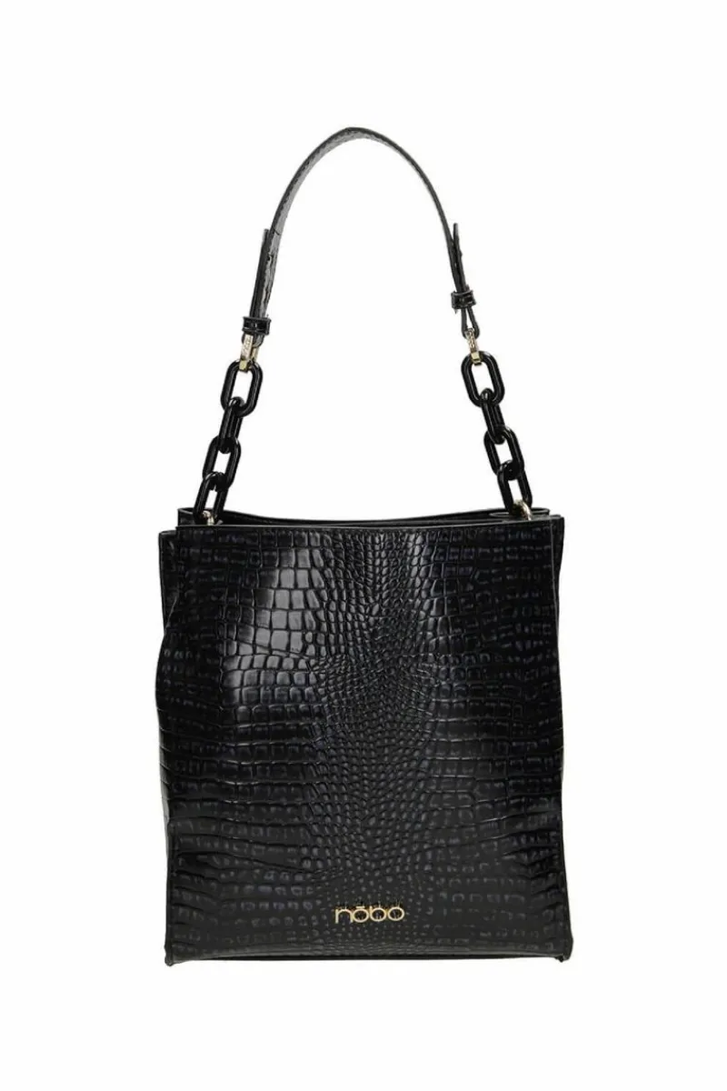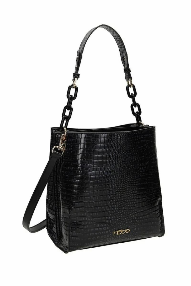 Torebka na ramię Nobo posiada dwie osobne komory zapinane na magnes. Wykonana z eko skóry w wzór przypominający skórę węża. Torebkę można nosiać na grubym pasku z łańcuchem lub dopinając dodatkowy, regulowany pasek. W modelu tym znajduje się z tyłu kieszonka na zamek, do której możesz schować np.: telefon.
