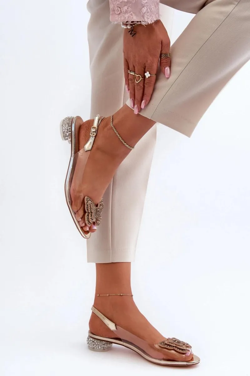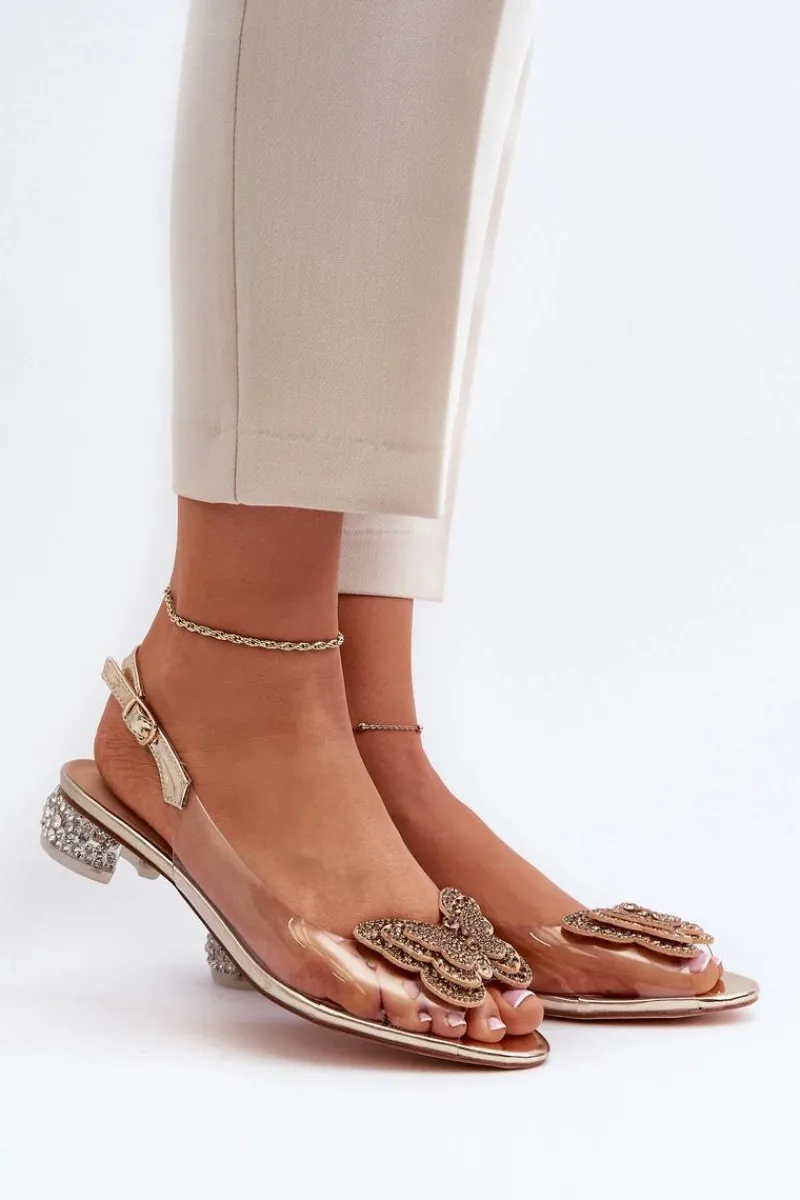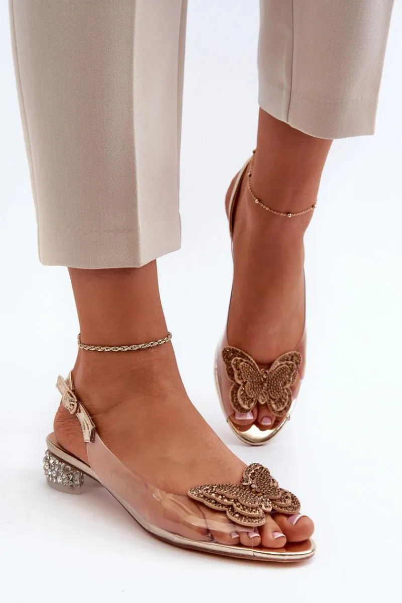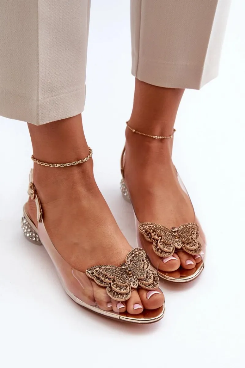 New Transparentne Sandały Na Niskim Obcasie Z Motylem Różowe Złoto D&A MR38-388 Damskie Sandały Na Obcasie