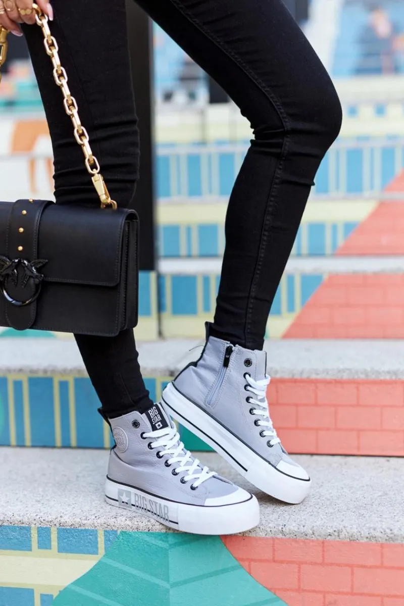 Damskie trampki polskiej marki BIG STAR. Kultowe już trampki pasują do wielu stylizacji. Buty dobrze dopasowują się do kształtu stopy, posiadają miękką, materiałową wkładkę oraz antypoślizgową podeszwę. Wykonane są z odpornej na zabrudzenia tkaniny. Koniecznie sprawdź całą naszą kolekcję butów BIG STAR. Przy wyborze rozmiaru prosimy sugerować się tabelą rozmiarów.