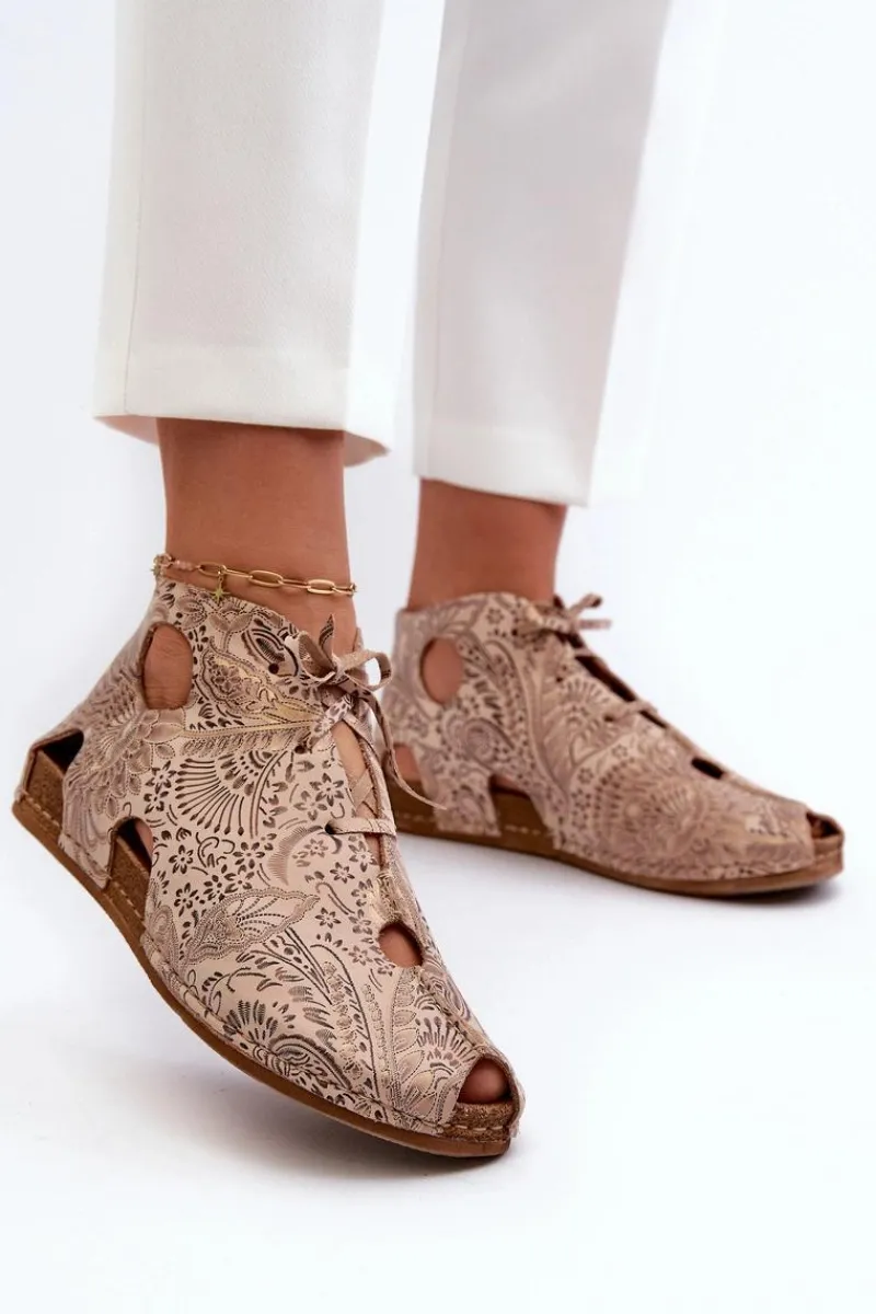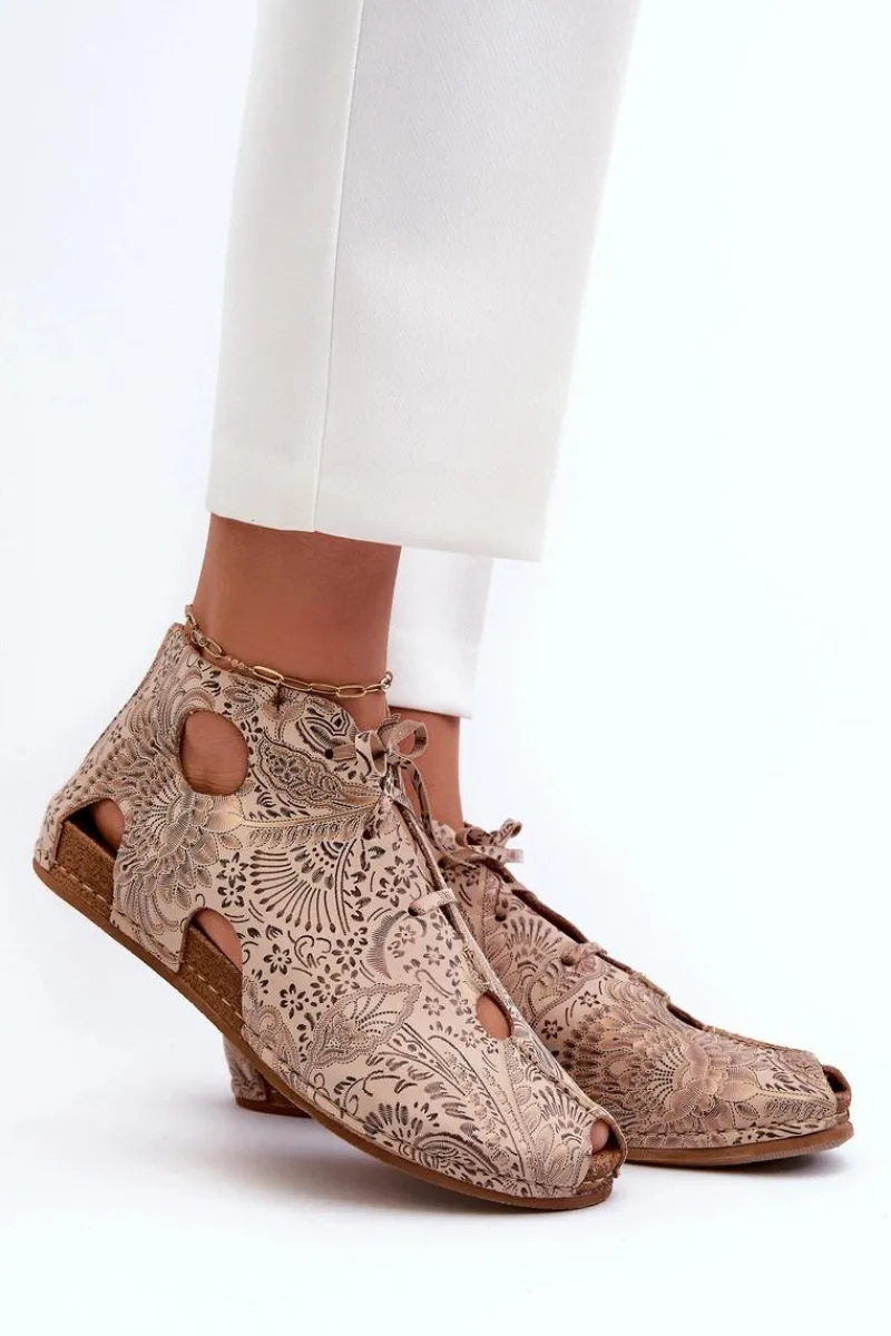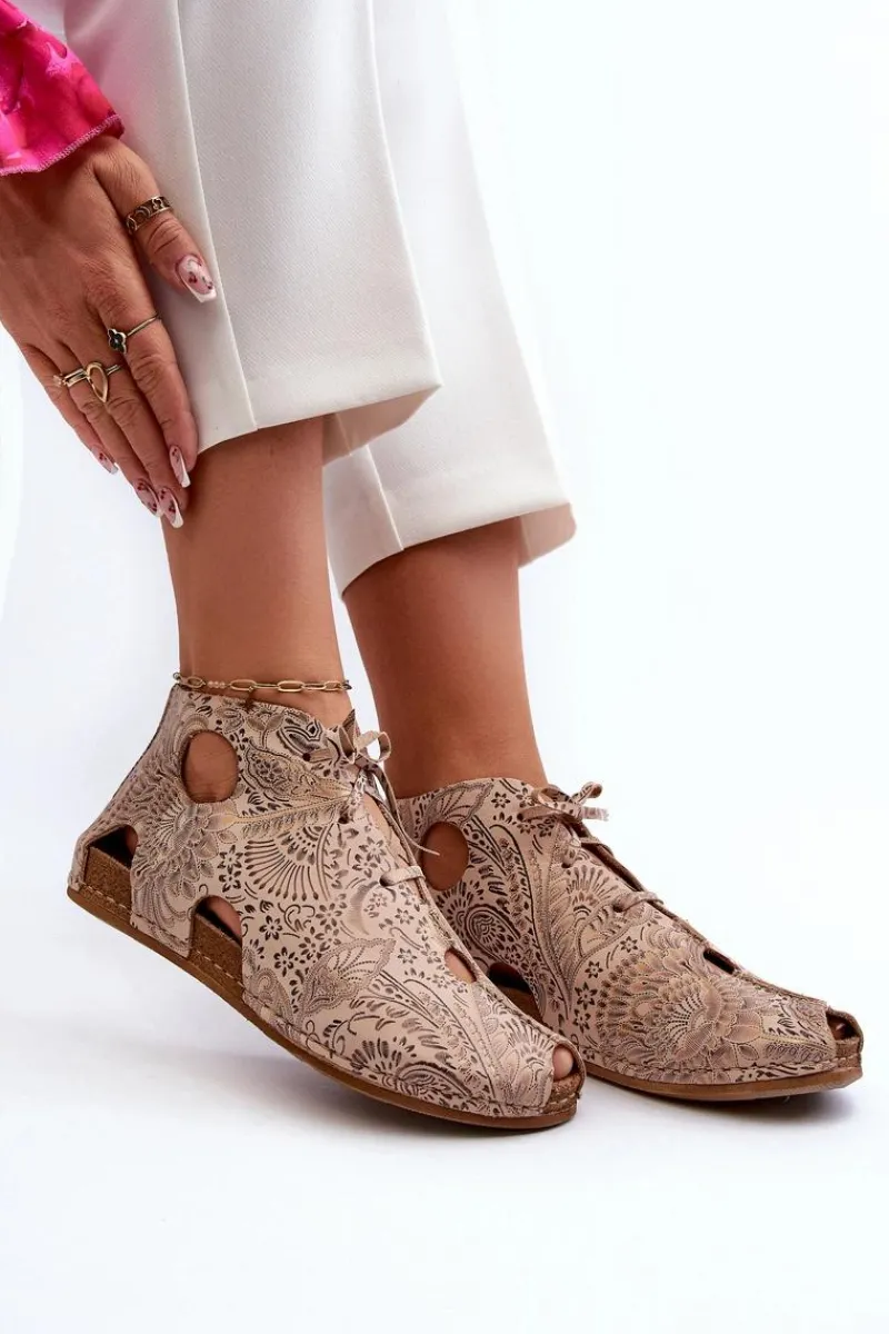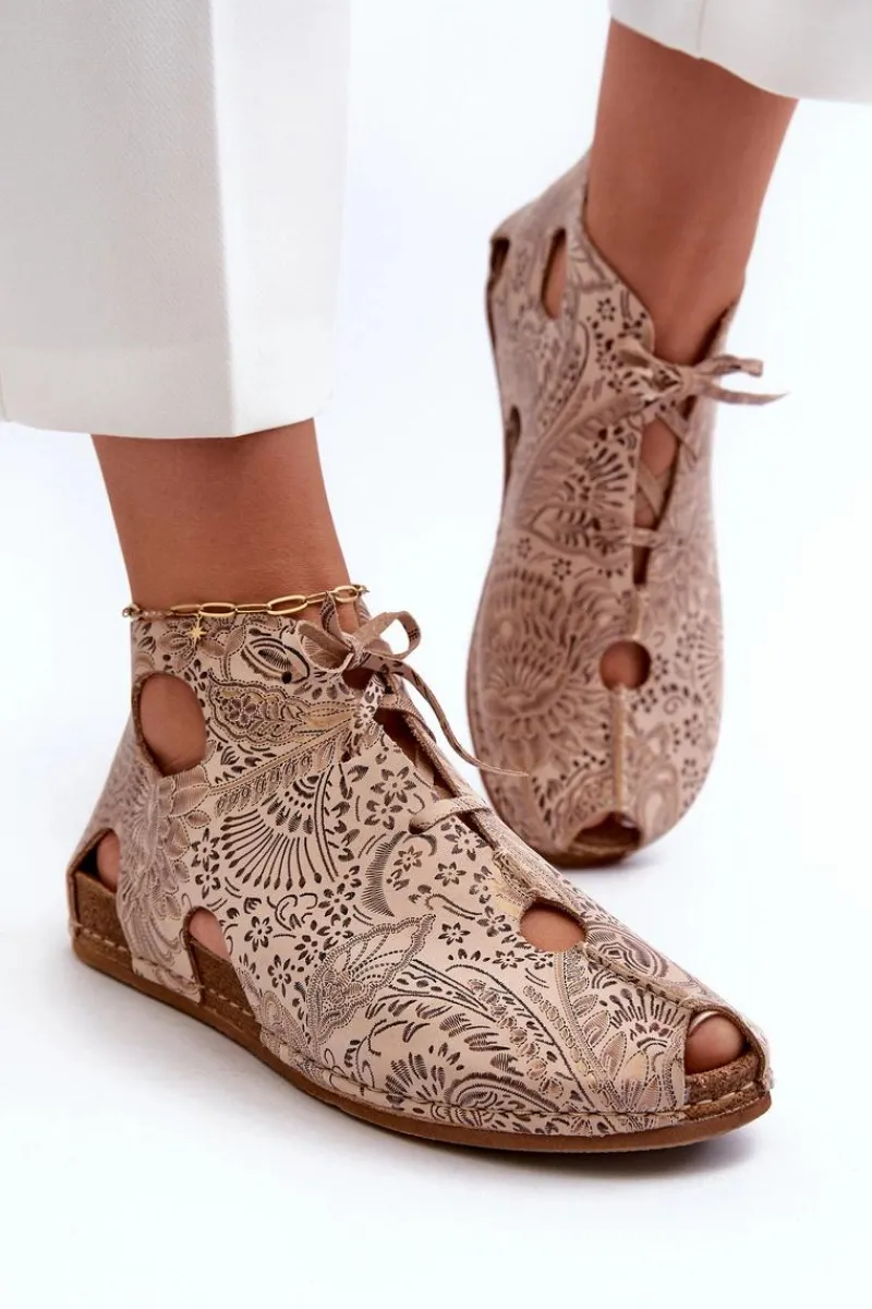 New Wzorzyste Skórzane Botki 03426-02 Beżowe Damskie Sandały Płaskie|Botki Wiosenne