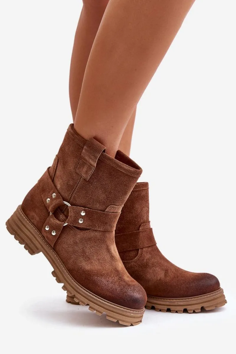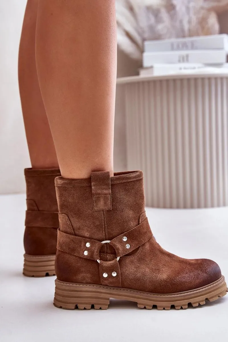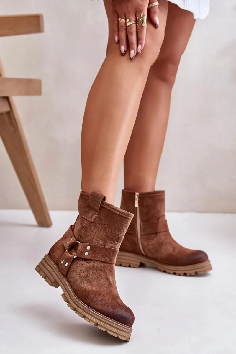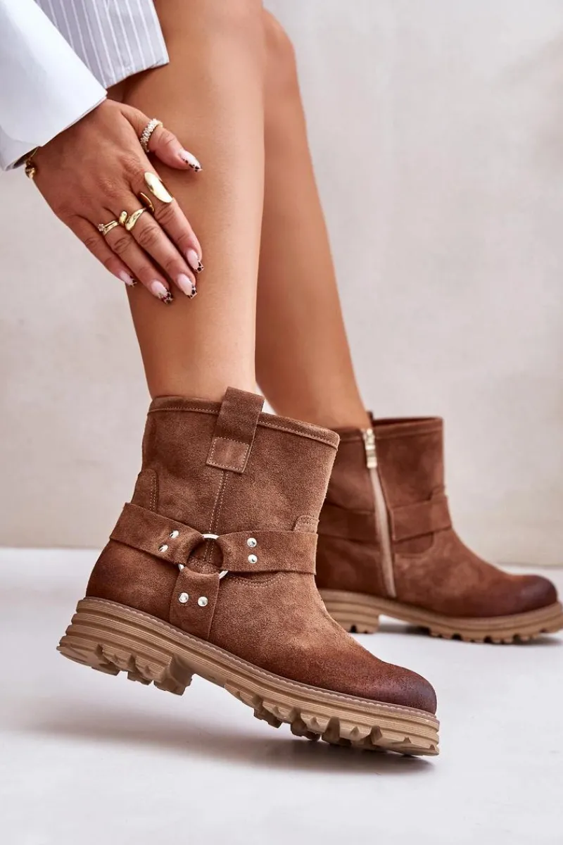 Botki wykonane z naturalnego zamszu to idealny wybór na każdą okazję. Osadzone na płaskim obcasie, zapewniają komfort i stabilność podczas chodzenia. Zaokrąglone noski dodają subtelnego charakteru. Model zapinany na zamek, co ułatwia zakładanie. Cholewka ozdobiona efektownym połączeniem pasków, które dodają stylowego akcentu. Te botki świetnie sprawdzą się w codziennych stylizacjach, łącząc elegancję z wygodą. Przy wyborze rozmiaru prosimy sugerować się tabelą rozmiarów.