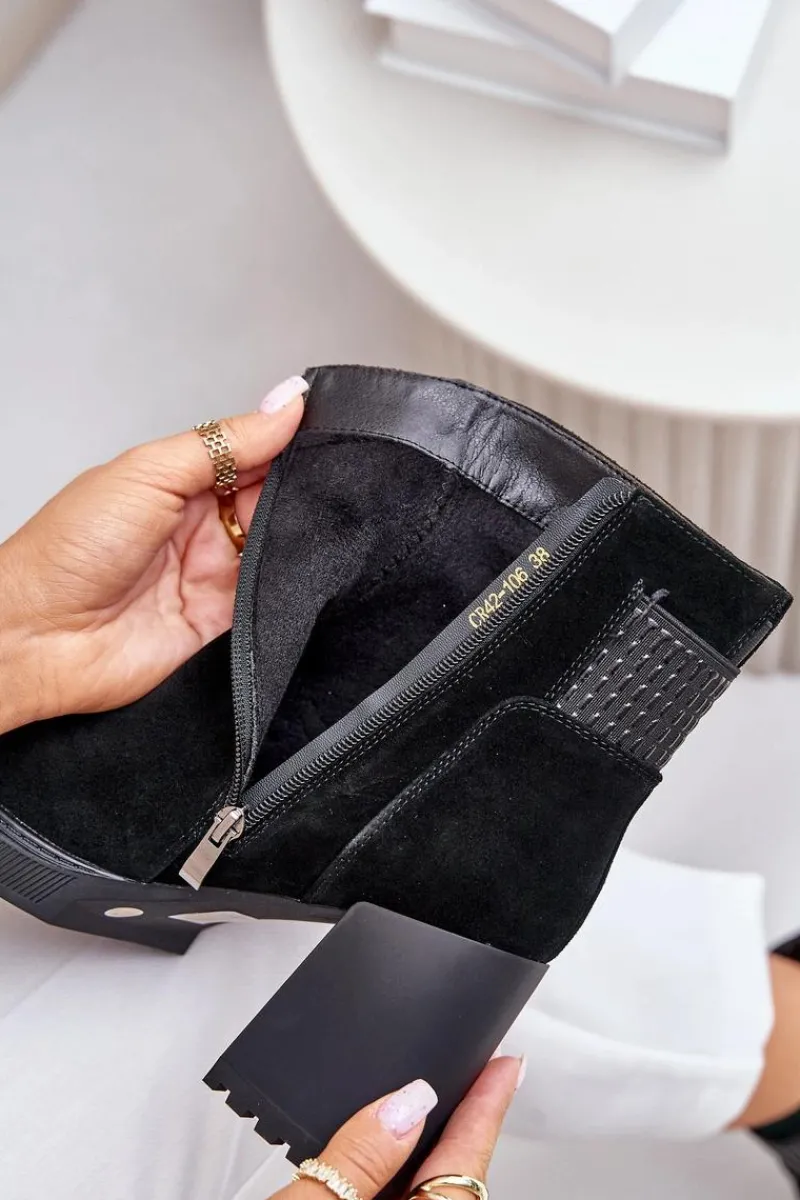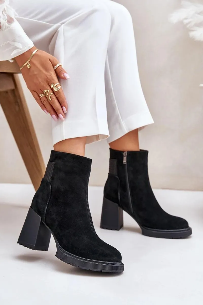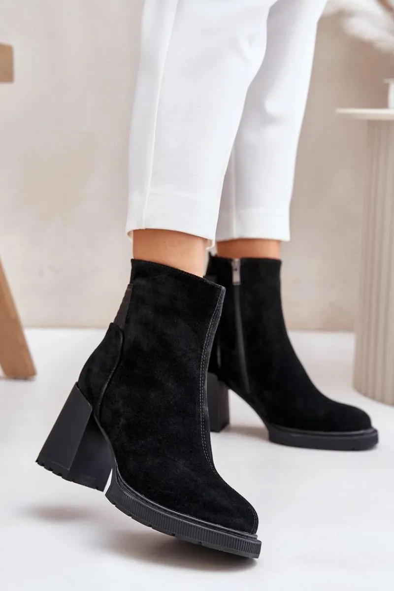Eleganckie botki wykonane z naturalnego zamszu to idealny wybór na chłodniejsze dni. Osadzone na stabilnym obcasie typu słupek, zapewniają komfort noszenia przez cały dzień. Wnętrze ocieplone kocem obuwniczym, co gwarantuje ciepło i wygodę nawet podczas mroźnych dni. Dzięki praktycznemu zapięciu na zamek, zakładanie i zdejmowanie jest szybkie i łatwe. Przy wyborze rozmiaru prosimy sugerować się tabelą rozmiarów.