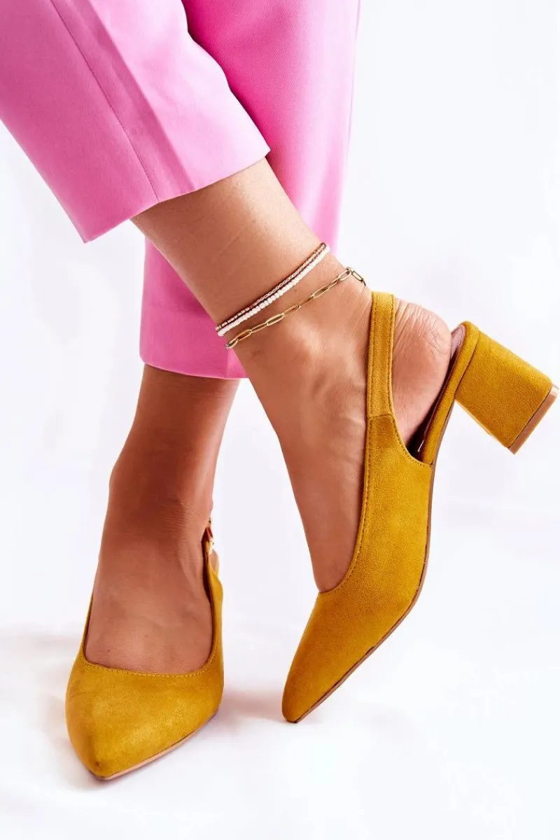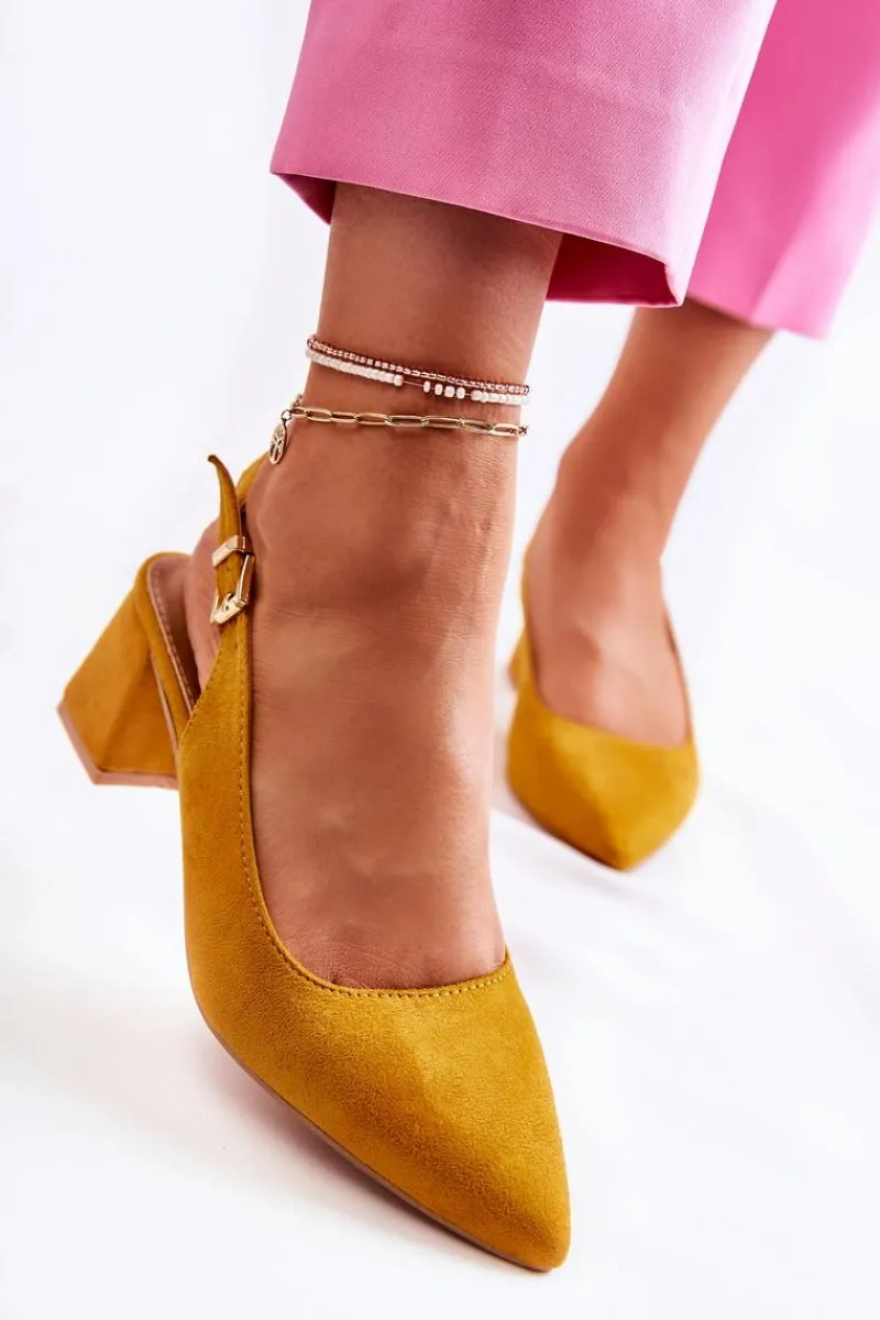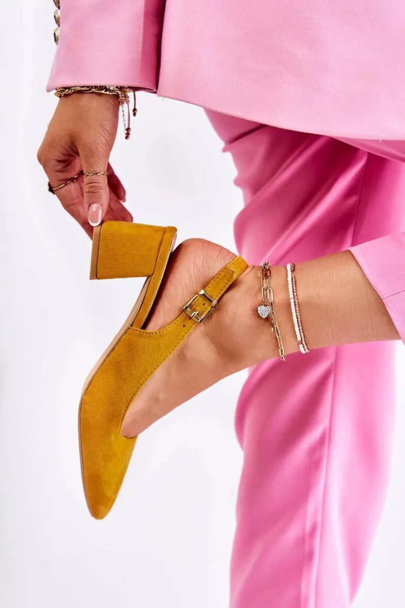 Cudne czółenka z odkrytą piętą i zakrytym noskiem w szpic. Wykonane z przyjemnego w dotyku, eko zamszu. Posiadają regulowany pasek zapinany na sprzączkę. Osadzone na obcasie w postaci klocka, który zapewni stabilność na każdym kroku. Miękka, wykonana z eko skóry wkładka to gwarancja komfortu podczas użytkowania. Czółenka te świetnie sprawdzą się podczas spotkań biznesowych czy uroczystości rodzinnych. Przy wyborze rozmiaru prosimy kierować się tabelą rozmiarów